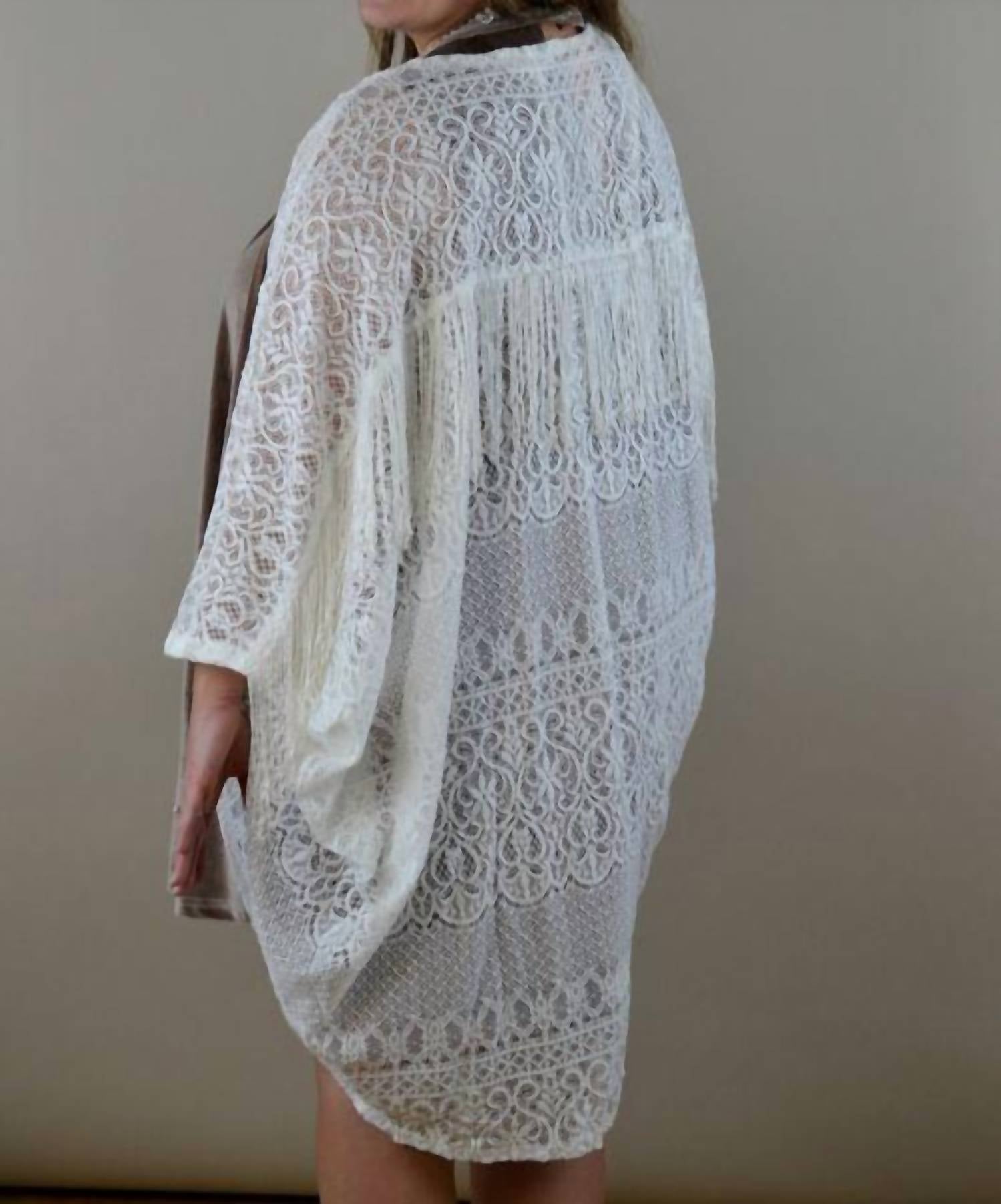 A classic fit that works just as good buttoned as it does left open. Elevate your wardrobe with the Lace Fringe Shrug Cardigan by Honey Punch, a chic layering piece in a soft off-white coconut hue. This sleeveless, cocoon-style kimono features luxurious looped fringe details across the back and sleeves, offering a unique Western-inspired flair. Made from a blend of 60% Cotton and 40% Nylon, it ensures both comfort and style. This imported cardigan has a convenient pull-on closure and should be hand washed to maintain its delicate structure.