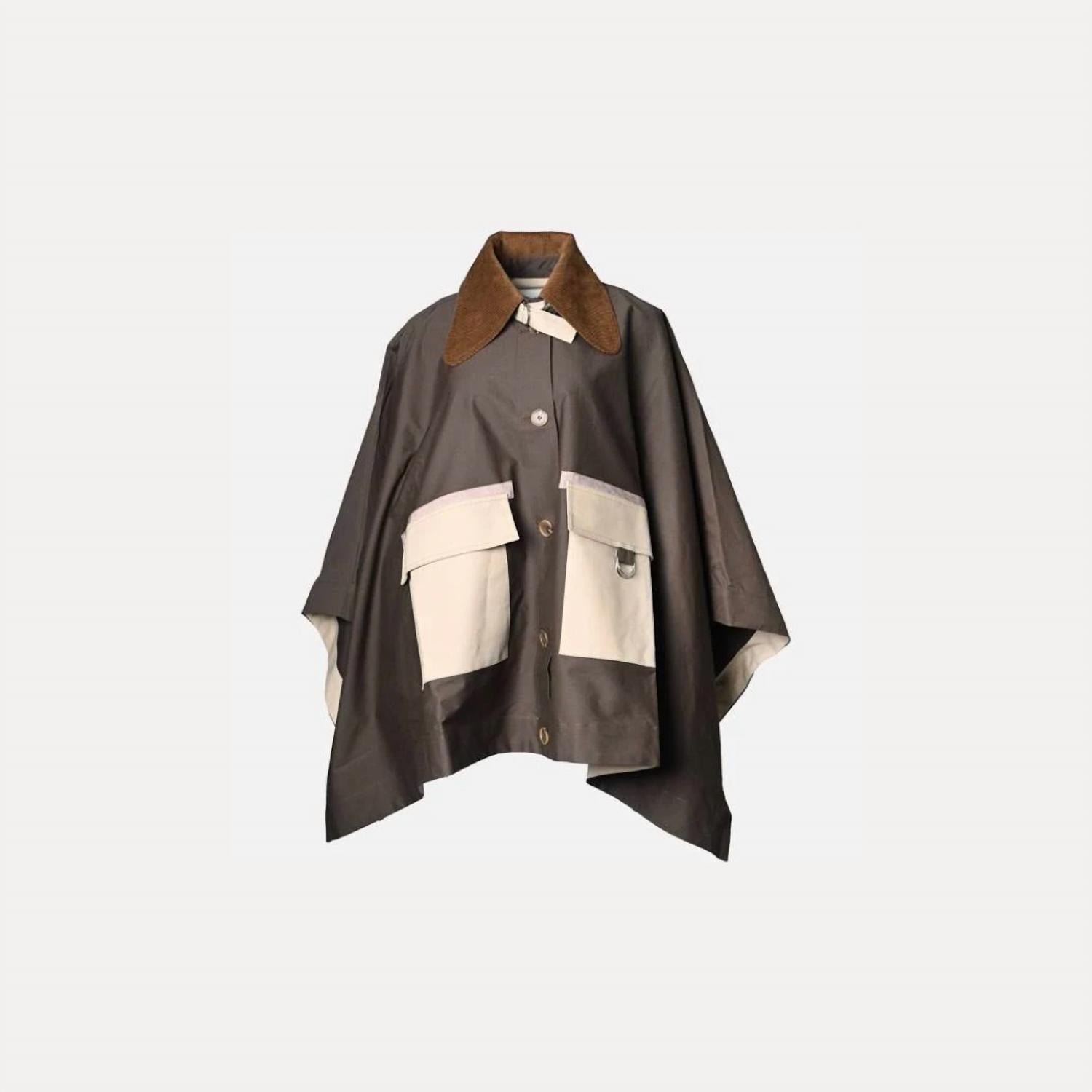Introducing the Women's Carolina Chino Poncho by SEA, a chic and functional piece designed with a detachable hood and an oversized corduroy collar. Crafted with attention to detail, this long sleeve poncho offers a textured pattern for added style. Material: Corduroy. Closure: Button closure. Enjoy both warmth and effortless fashion with this lined poncho, ideal for streetwear or vacation in the spring season.