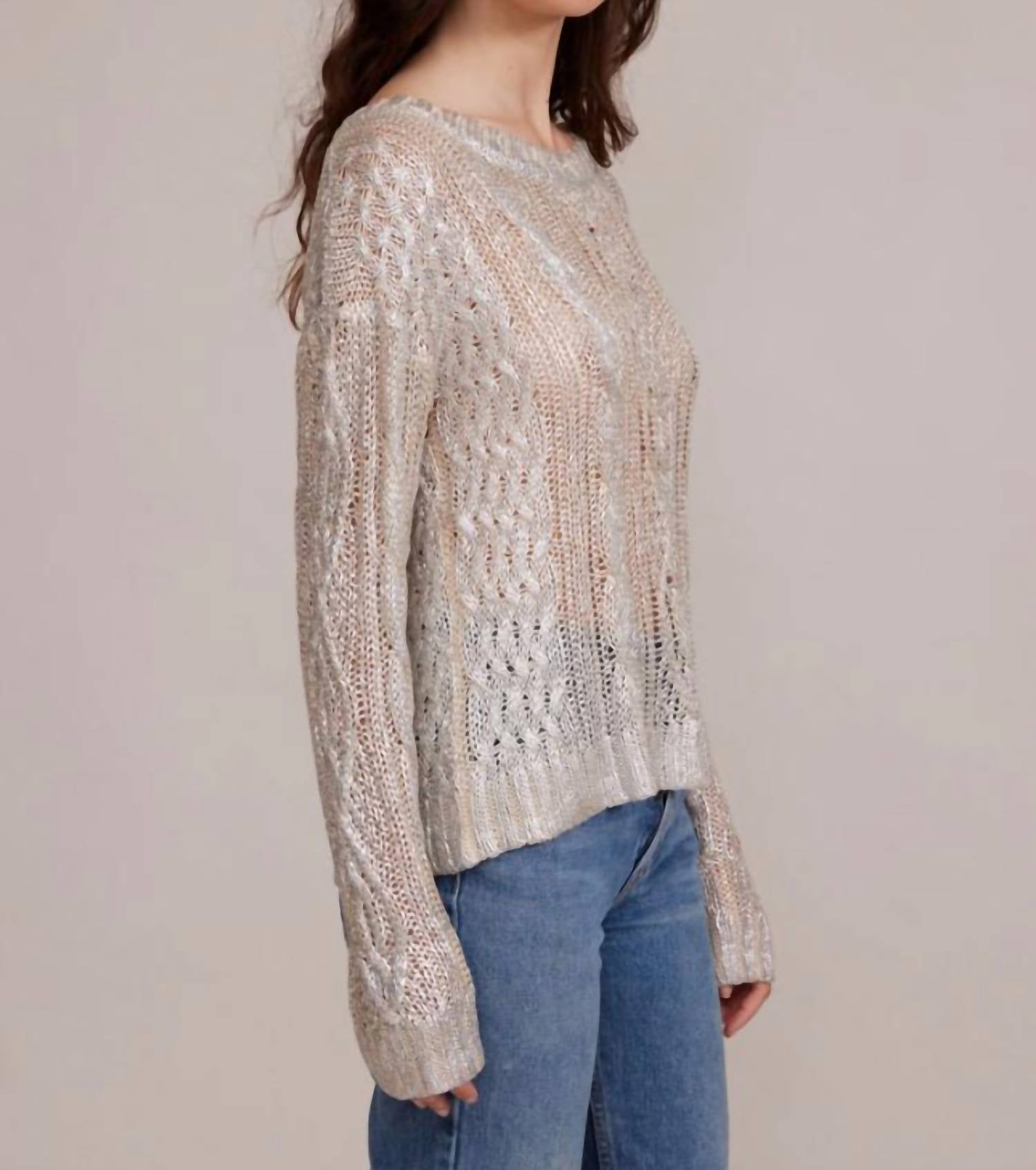 Stay warm and stylish in this versatile and effortlessly cool knitwear staple. Wear it alone or layered, it's the perfect sweater for the season and you'll wish you had it in every color. Shimmering silver piece that promises to dazzle. Designed with long sleeve. Features a graceful scoop neckline. Adds elegance to its patterned allure. Pull-on closure ensures ease of wear. For best care, dry clean only.