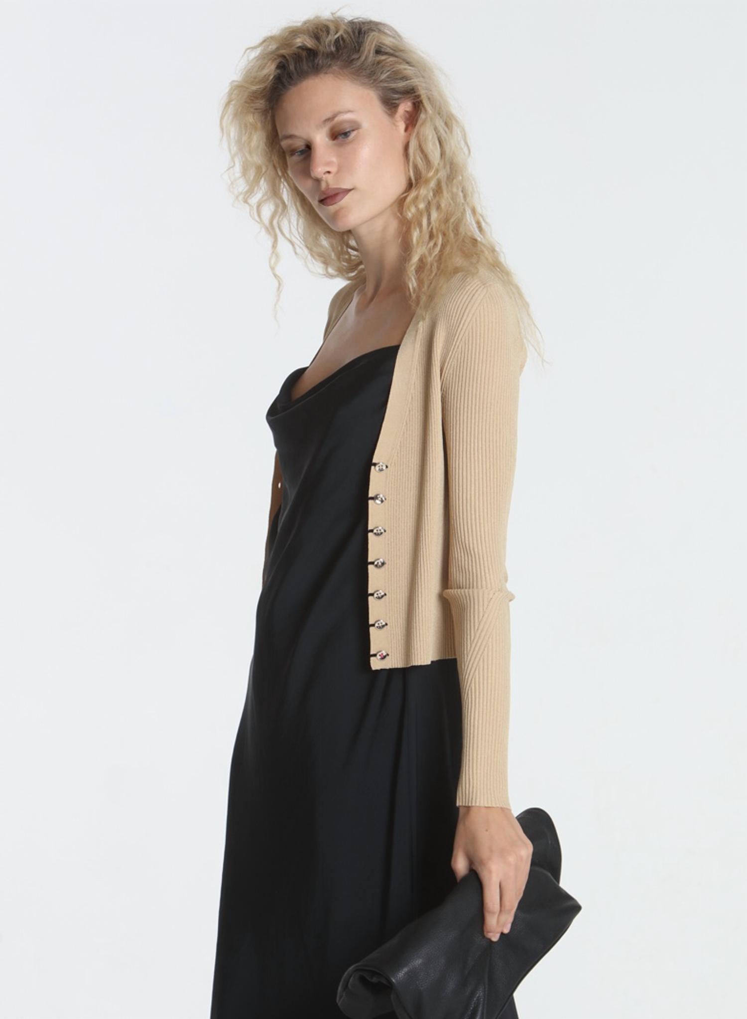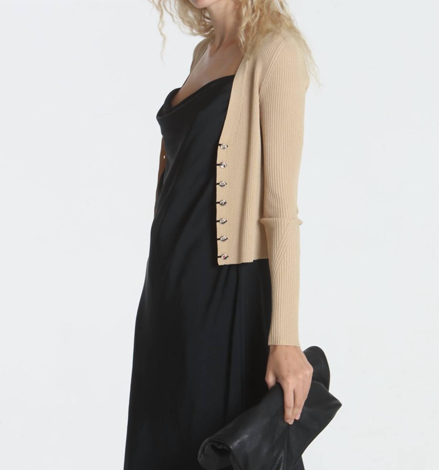 A classic fit that works just as good buttoned as it does left open. Introducing the Women's Rita Rib Cardigan by LABEL+thread, a minimalist and versatile piece in a stunning Pale Gold hue. Made with long sleeves and crafted from 83% viscose and 17% polyester, this rib stretch cardigan features high gloss metal buttons that can transform the look and enhance your ensemble. Ideal for fall, it boasts a stylish V-neck and a skinny fit that can be paired effortlessly with other garments. Care: Hand wash or dry clean. Model is 5'9" and wearing a size small.