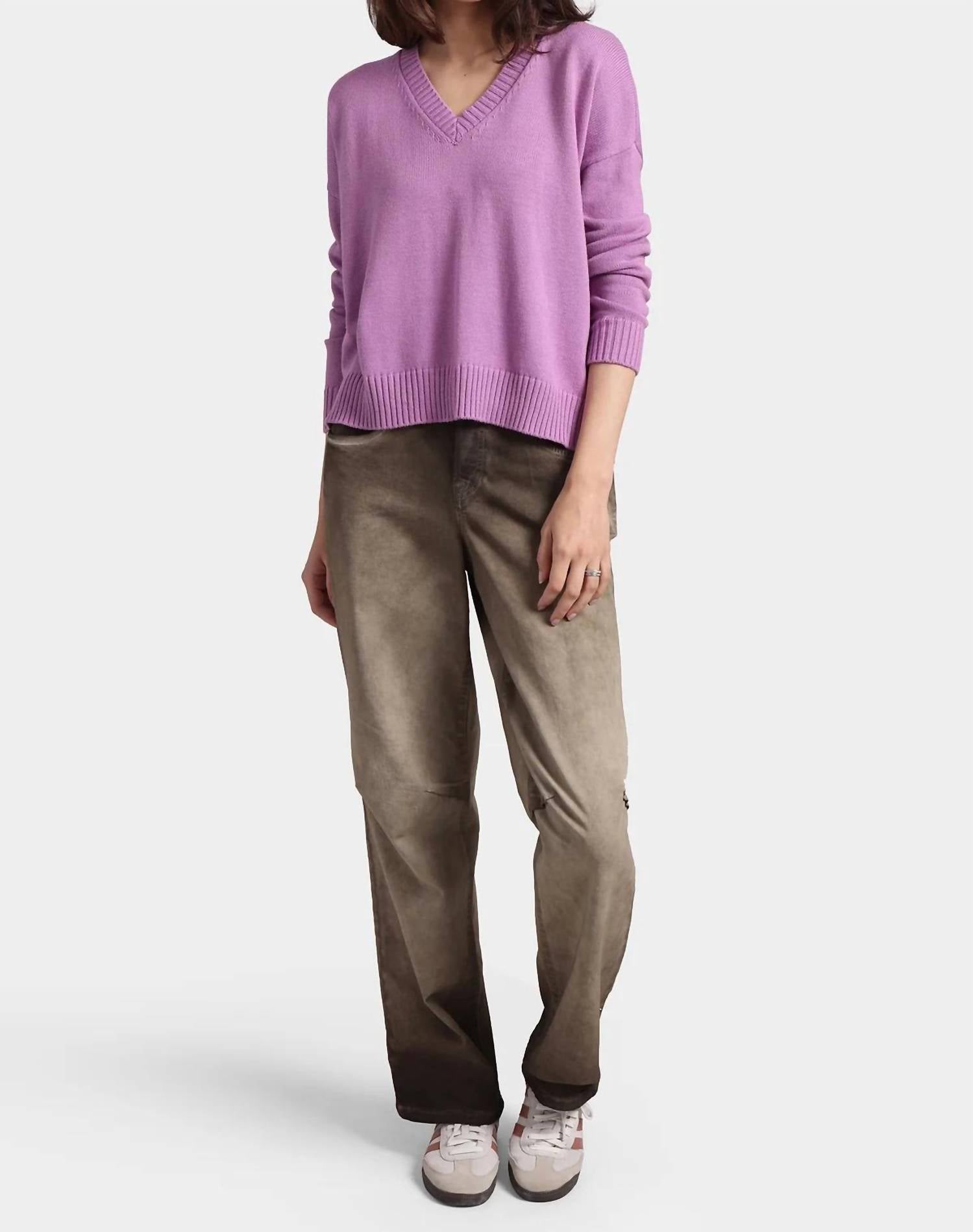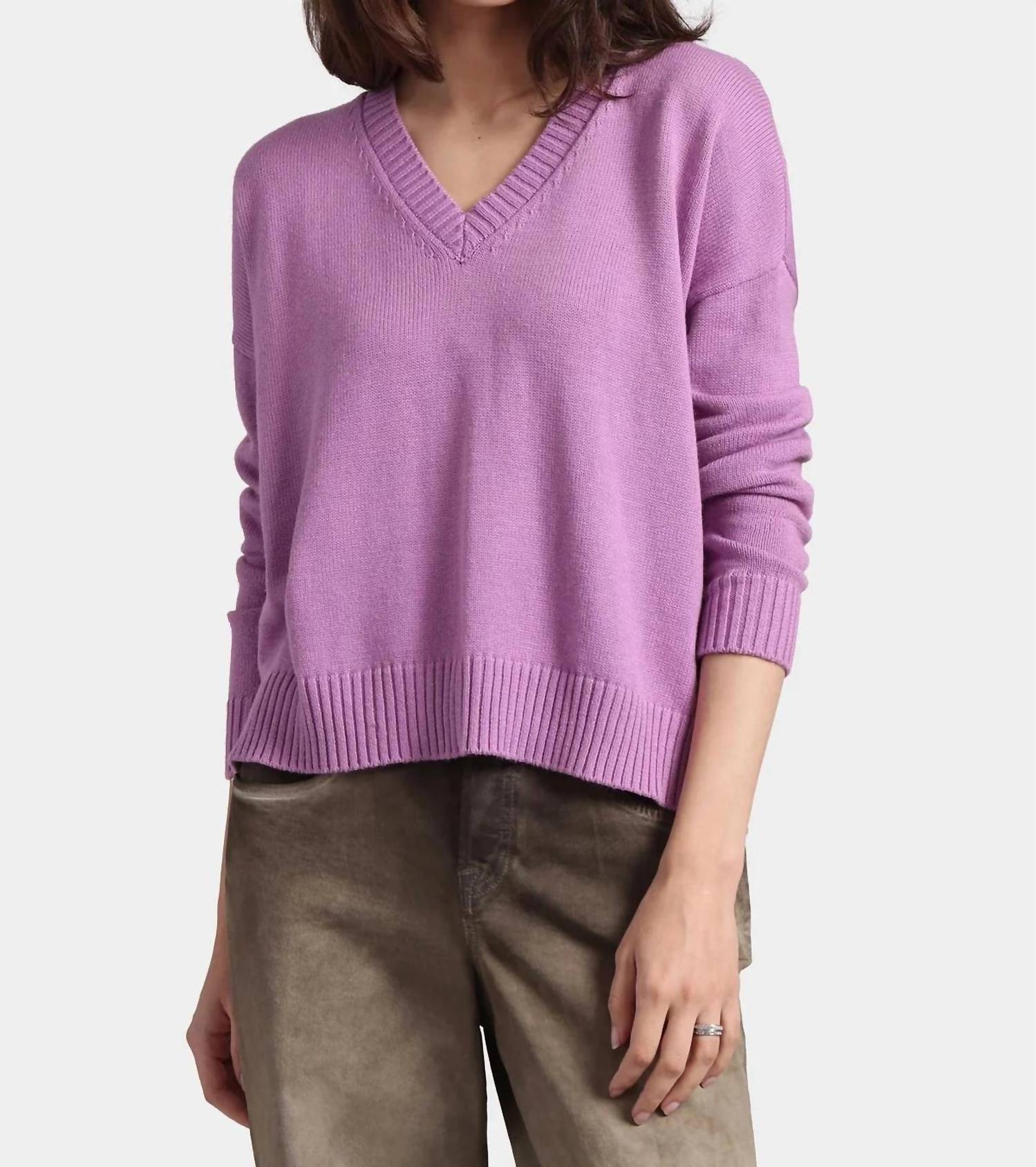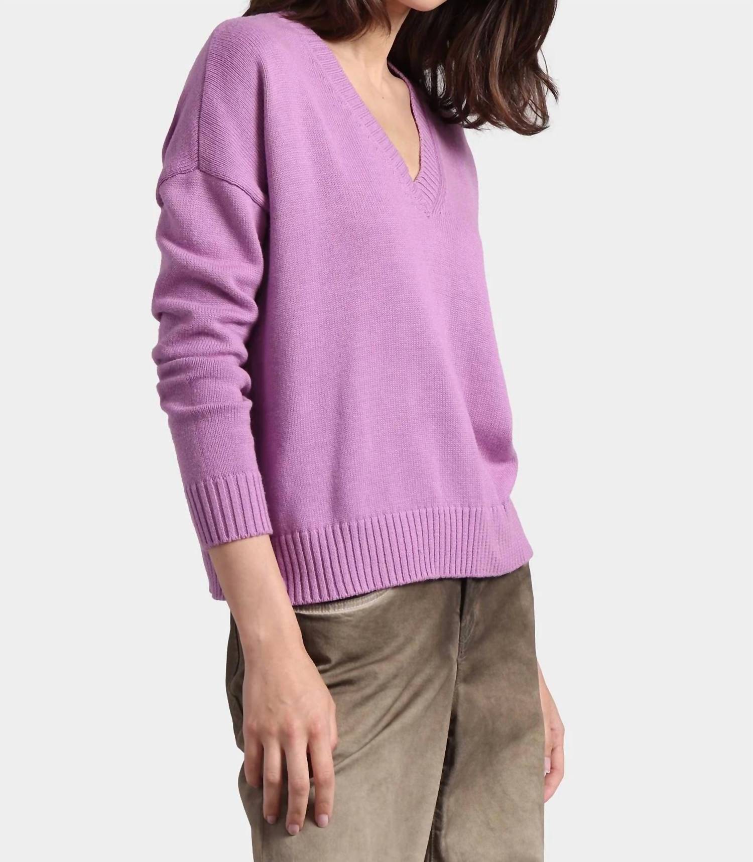 Wear this v-neck sweater with your favorite denim for the perfect fall look. Discover the ultimate in luxury elegantly crafted for women. Purple heart top features a minimalist solid pattern, long sleeves, and a sophisticated V-neckline. Composed of 95% cotton and 5% cashmere. Offers undeniable comfort ideal for winter occasions. Pull-on. Dry clean or hand wash.