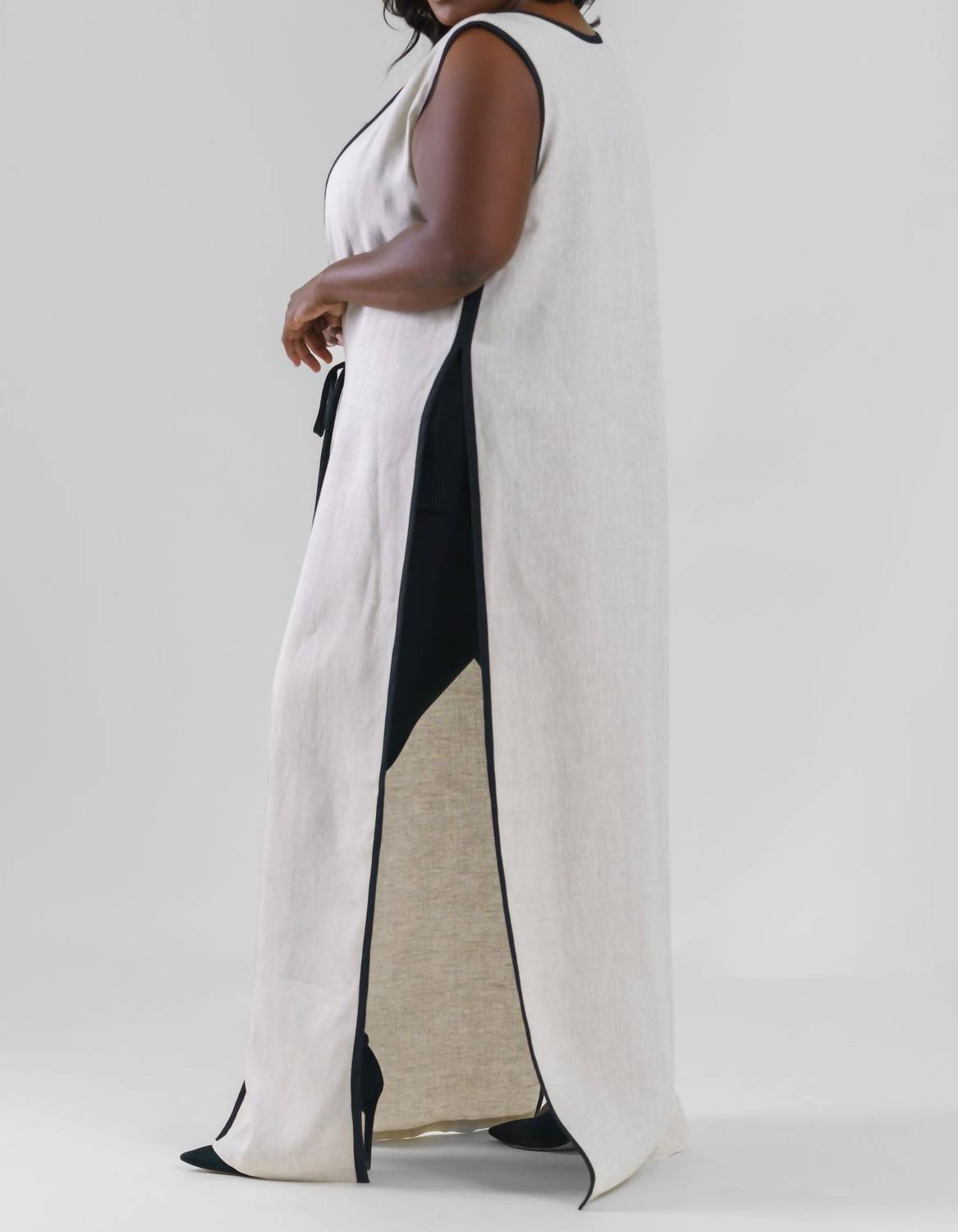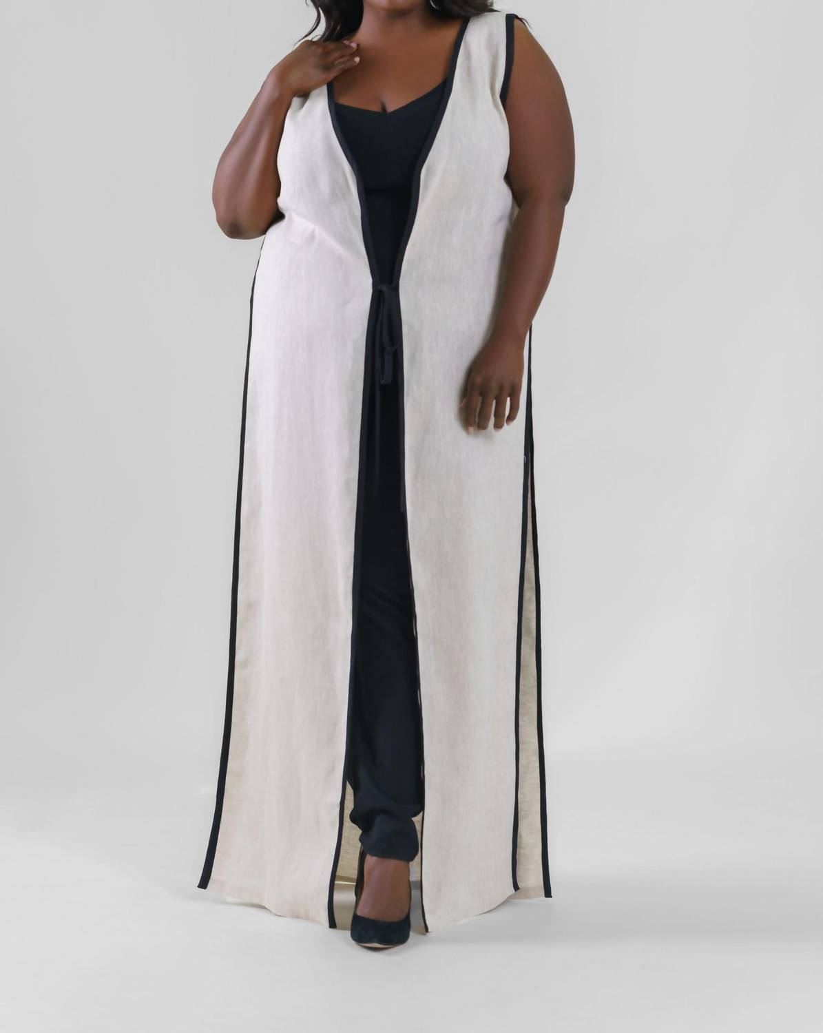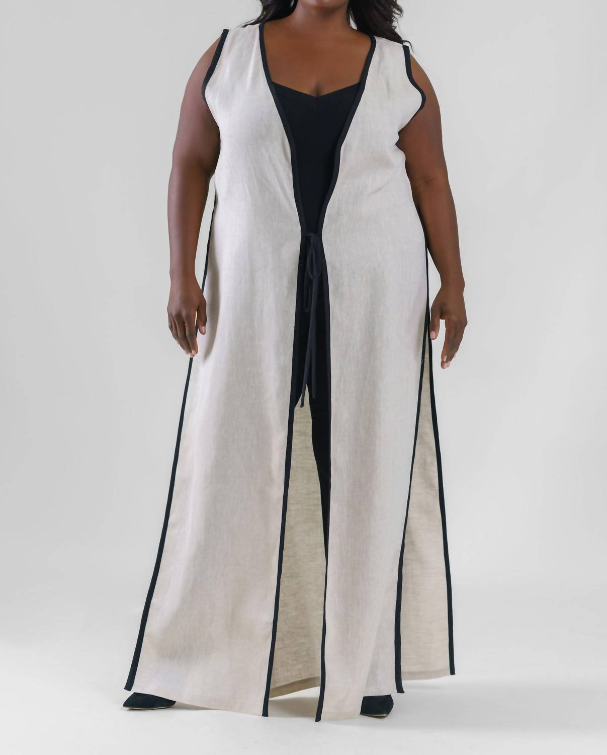 This cardigan will be a sweater-rotation favorite. Introducing the Marena Sleeveless Open Front Kimono by Adriana Contreras, a sophisticated piece in timeless taupe. This plus-sized kimono is crafted from 100% linen, offering a long length and a chic tie closure to enhance any outfit. Ideal for both casual and formal settings, its solid pattern and crewneck design make it versatile for various occasions. Care for this elegant cardigan with hand washing and line drying to maintain its exquisite quality.