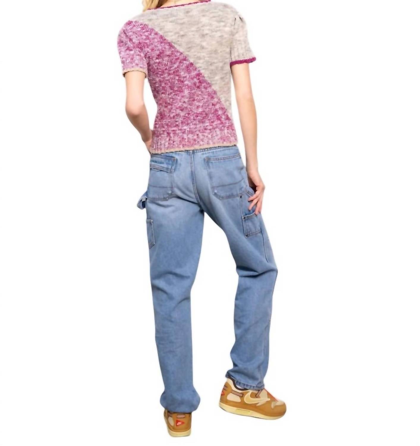 The ultimate go-to sweater, expertly crafted to provide the perfect combination of warmth and style. Its classic design and soft fabric make it a must-have addition to your wardrobe. Introducing the Aubree Short Sleeve Sweater by Central Park West, a chic addition to any wardrobe. This women's top in an oatmeal and berry multi-color features short sleeves and a stylish boatneck, perfect for a preppy fall look. Crafted from 39% Linen, 31% Cotton, 30% Rayon with a patterned design, it offers comfort with its pull-on closure. Easy to care for, simply machine wash and lay it flat to dry.