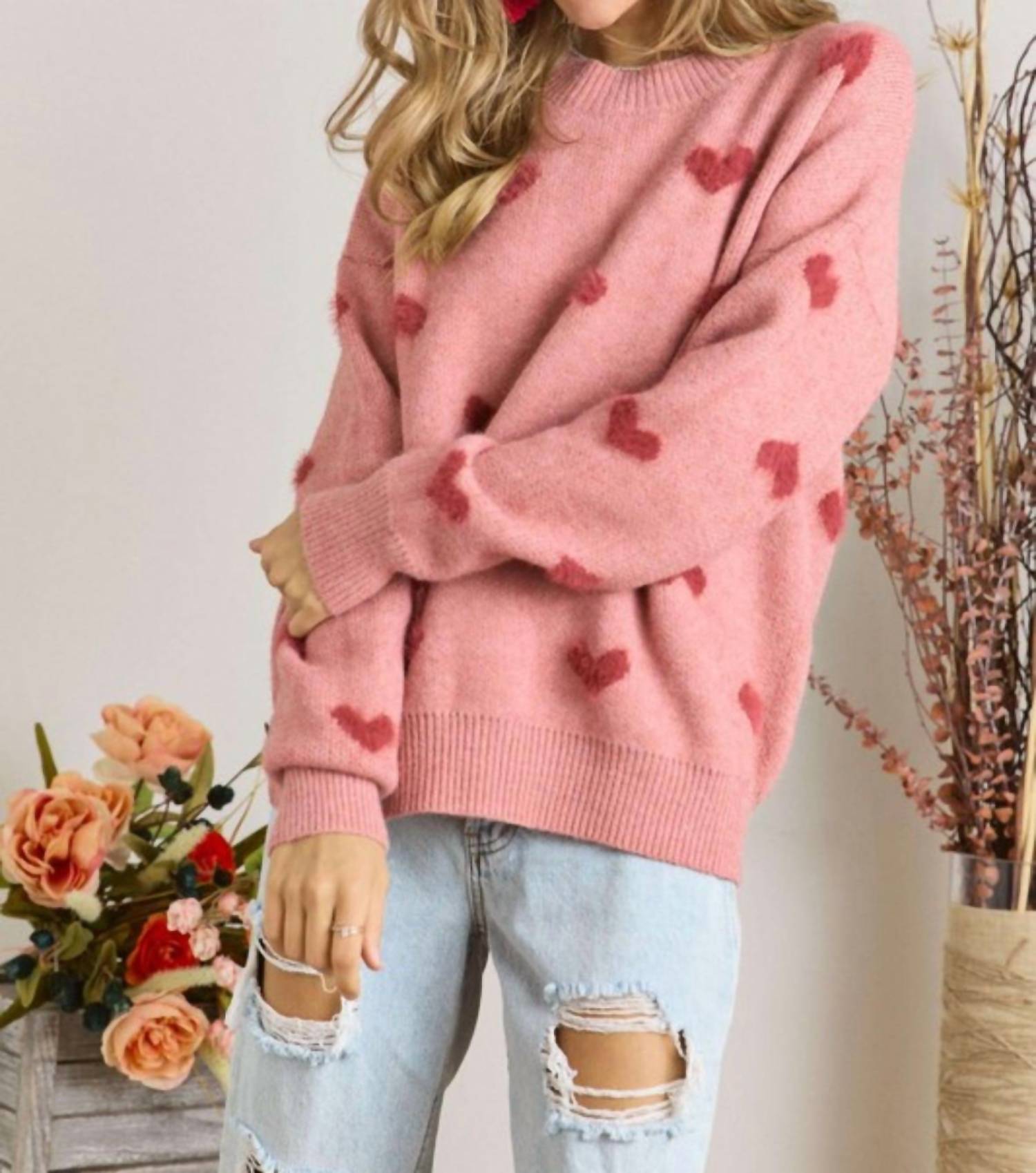 Stay warm and stylish in this versatile and effortlessly cool knitwear staple. Wear it alone or layered, it's the perfect sweater for the season and you'll wish you had it in every color. The Adora Lovely Heart Sweater is a charming addition to any wardrobe, perfect for casual yet cute looks. Featuring long sleeves and a drop shoulder design, this soft knit sweater is crafted from a blend of 52% Acrylic, 28% Polyester, and 20% Nylon. Displaying a lovely heart pattern in pink and red, it offers pull-on closure and is true-to-size for women. Care is simple: hand wash and lay flat to dry. Taylor is modeling a size M, highlighting its cozy and classic crewneck style for Valentine's Day or any day you want to feel the love.