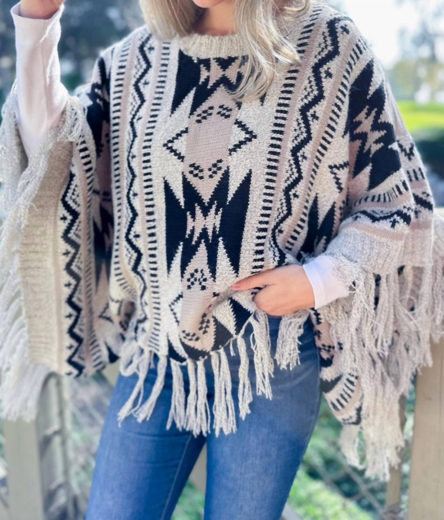Introducing the Prairie Moon Knit Tassel Top by Amoli, a boho-chic essential for women's fall wardrobes. Designed with long sleeves and crafted from soft knit, this patterned poncho comes in a striking blend of beige, black, and ivory. The Southwestern-inspired geometric print and fringe hemline offer effortless charm while providing warmth and comfort. Care instructions include hand washing and laying flat to dry, perfect for those seeking a stylish yet cozy layering piece.