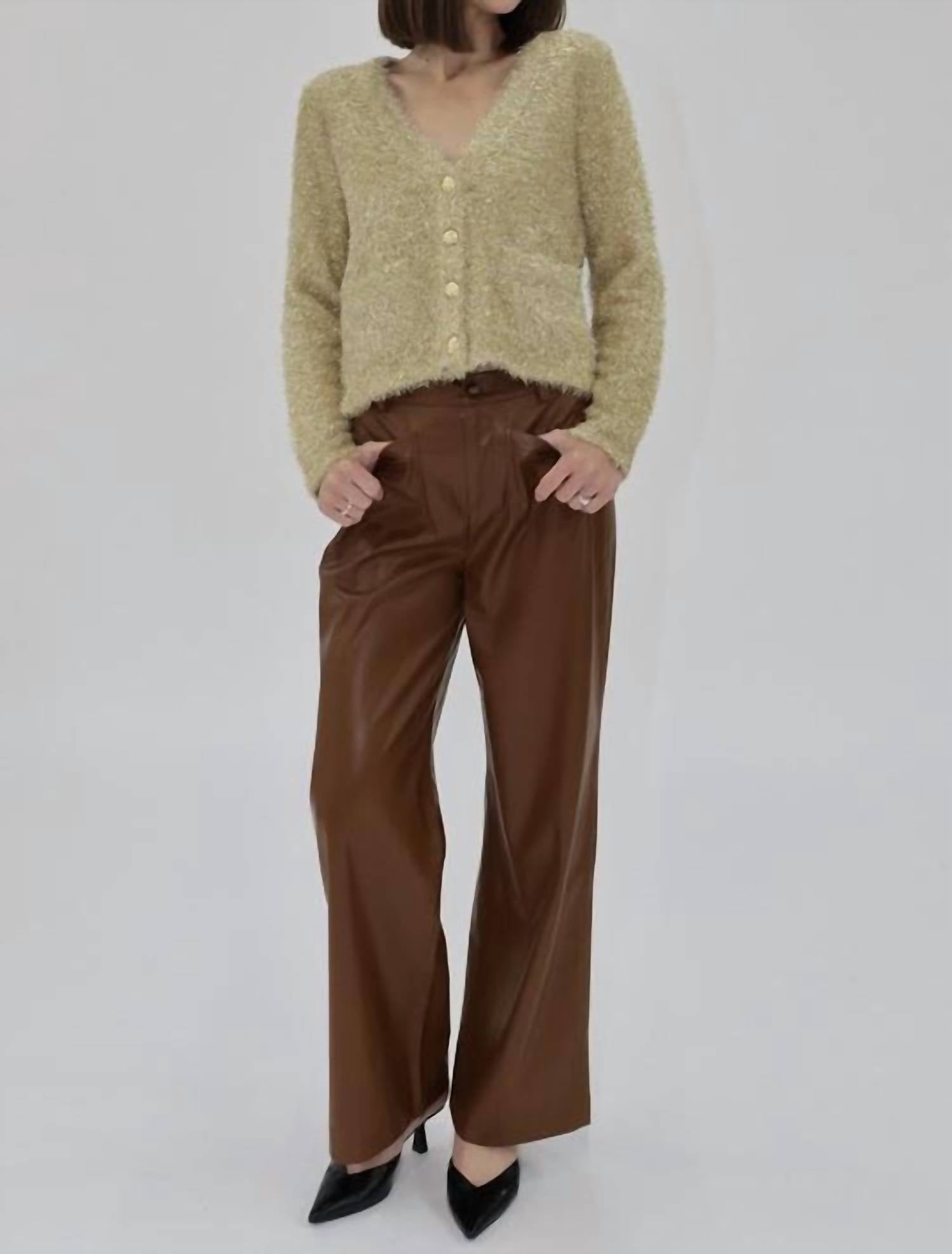 You'll be reaching for this comfy and classic v-neck sweater all season long. Experience the perfect blend of comfort and style with the Luciana Cardigan Sweater by Another Love, a standout in shimmering gold. This solid, long sleeve V-neck sweater is crafted from 100% polyester, bringing a Boho Chic touch to your fall wardrobe. Featuring a convenient button closure and practical patch pockets, it's a chic choice for a dinner party or holiday gathering. Care is simple with hand wash and lay flat to dry instructions.