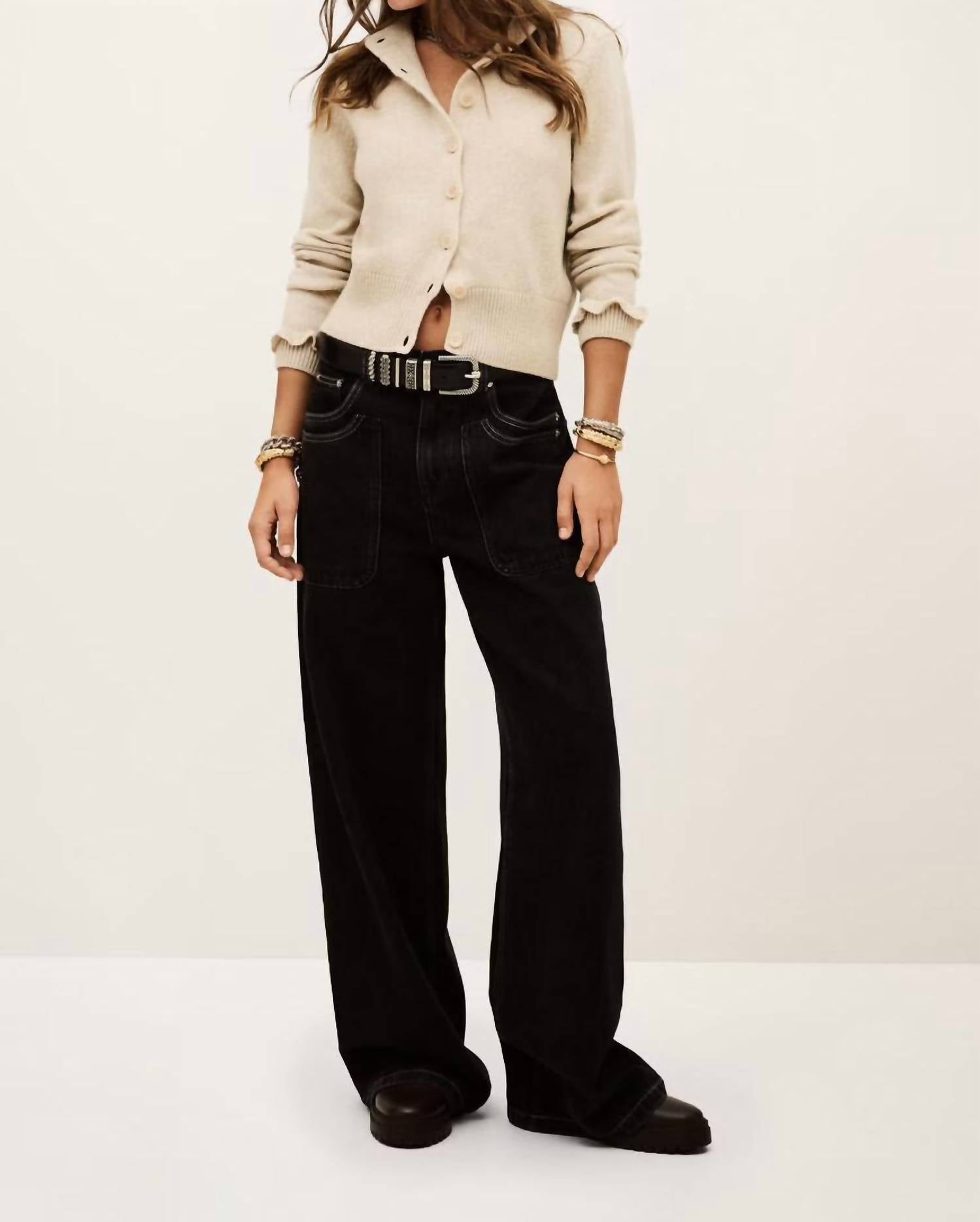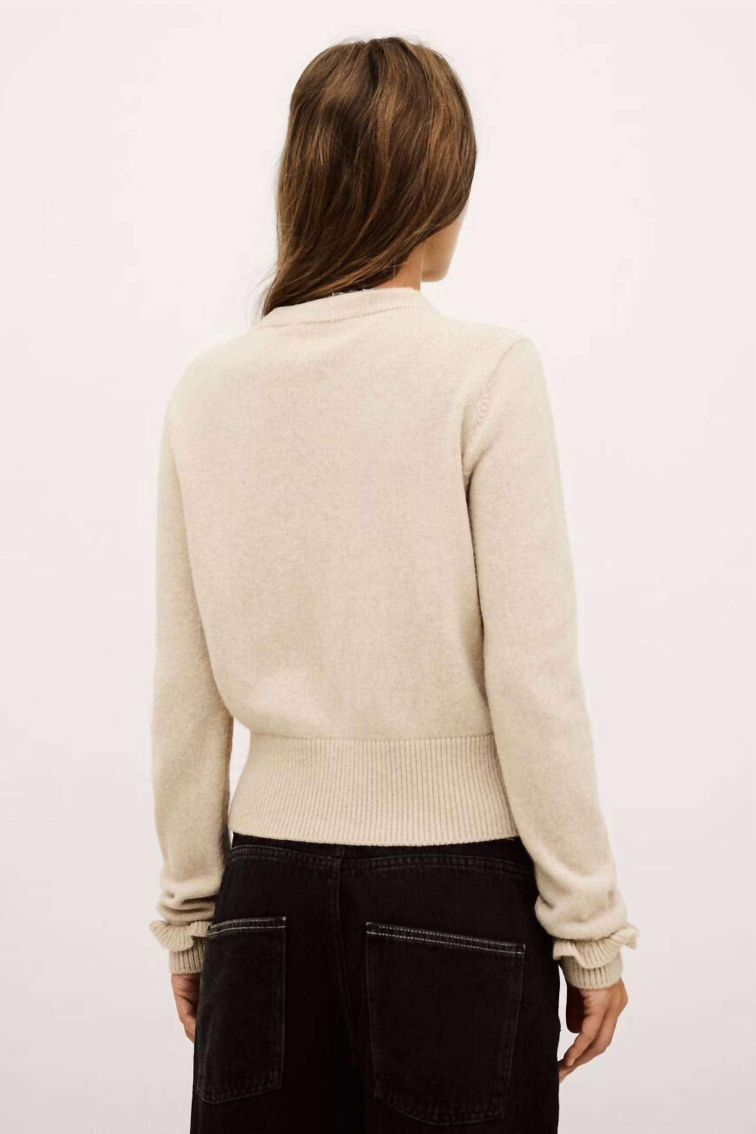 This cardigan will be a sweater-rotation favorite. Introducing the Karante Round Neck Cardigan by ba&sh, a minimalist and elegant addition to your fall wardrobe. This beige cardigan features long fitted sleeves with ruffled wrists and a round collar, offering a chic yet cozy aesthetic. Made from 100% wool, sourced from a certified supply chain that prioritizes animal welfare, it boasts a ribbed hem and sleeve cuffs for added style. Originating from Bulgaria, it closes with buttons and requires hand washing, high-temperature ironing, and flat drying for lasting quality.