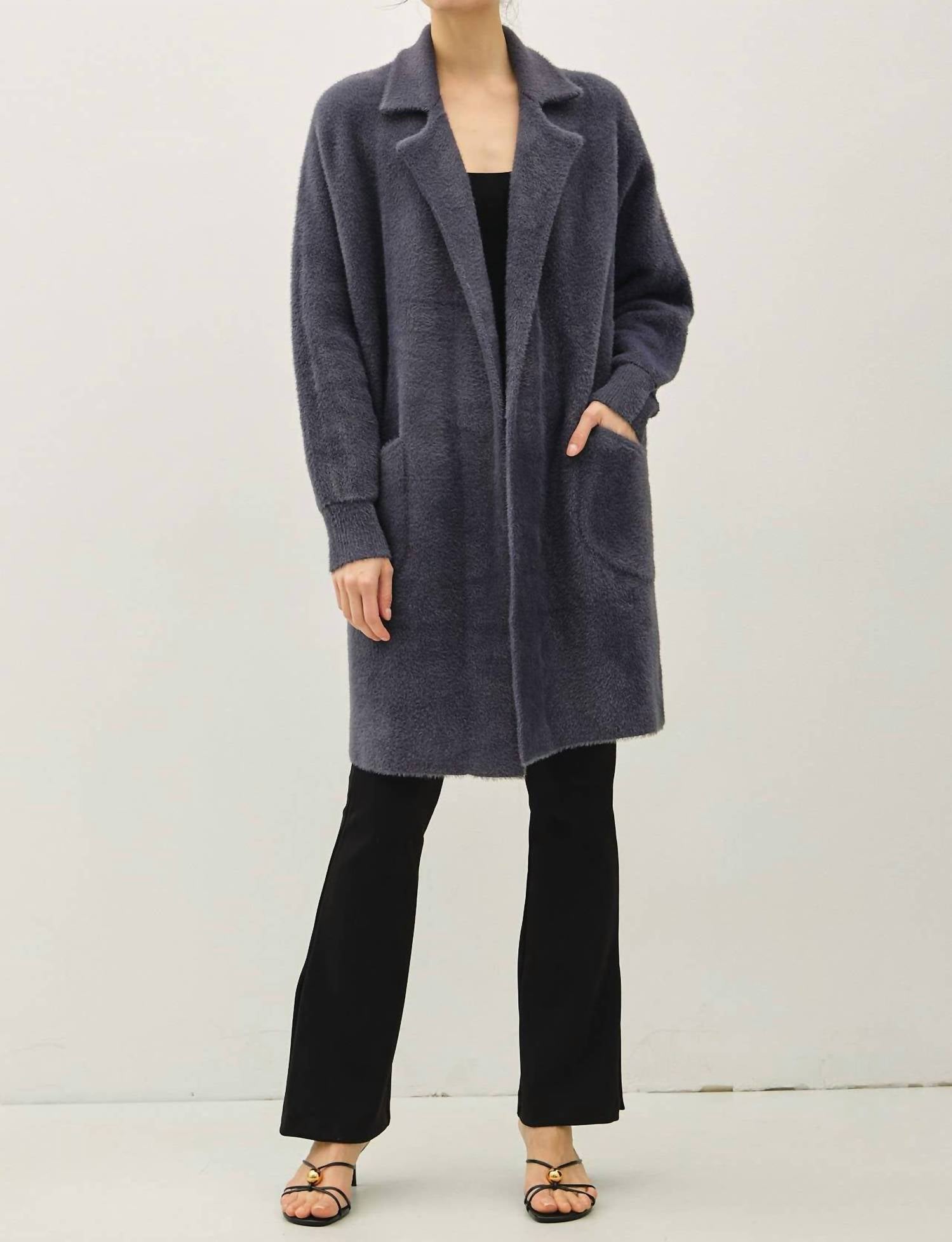 Throw this adorable cardigan over any cami or tank top. Elevate your style with the Fuzzy Blazer Cardigan by Be Cool, a must-have piece for every season. This women's cardigan in a versatile grey boasts long sleeves and a chic collared neckline. With its solid pattern and practical pockets, it's perfect for holiday gatherings or a monochrome trend-inspired vacation look.