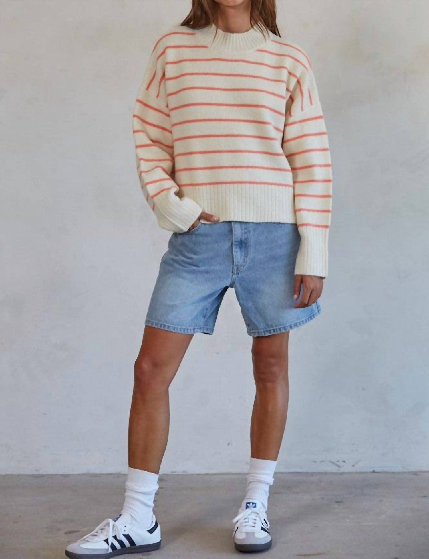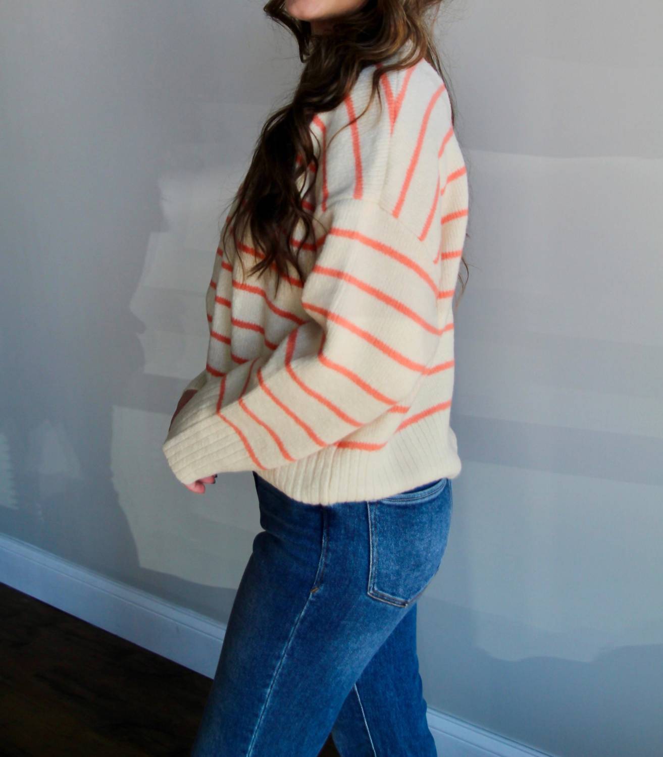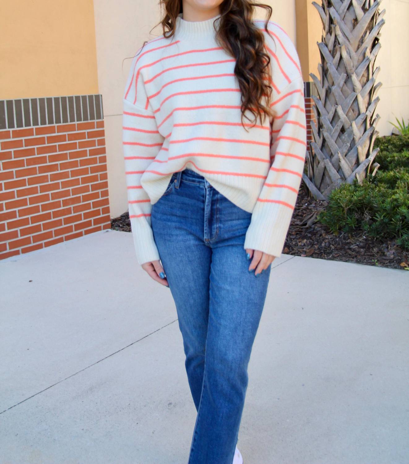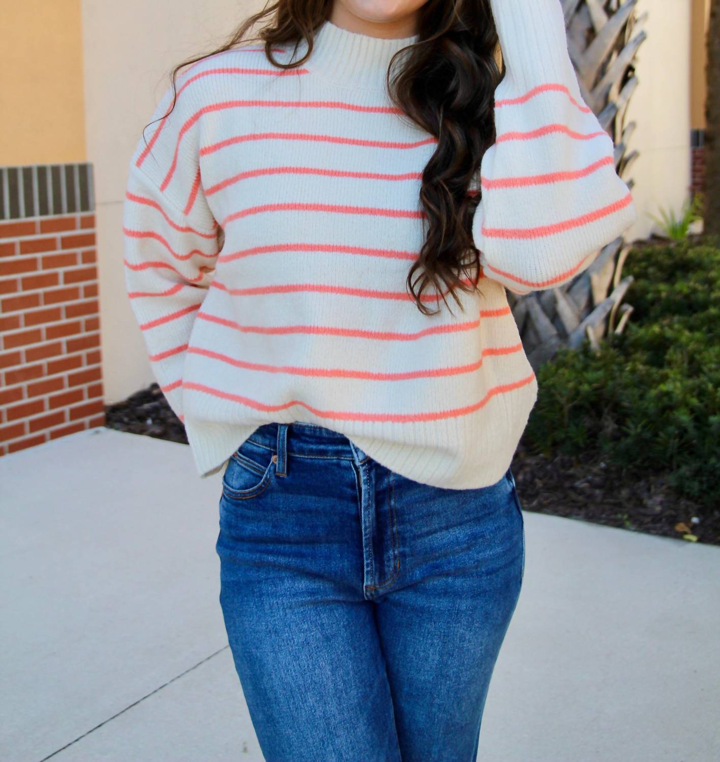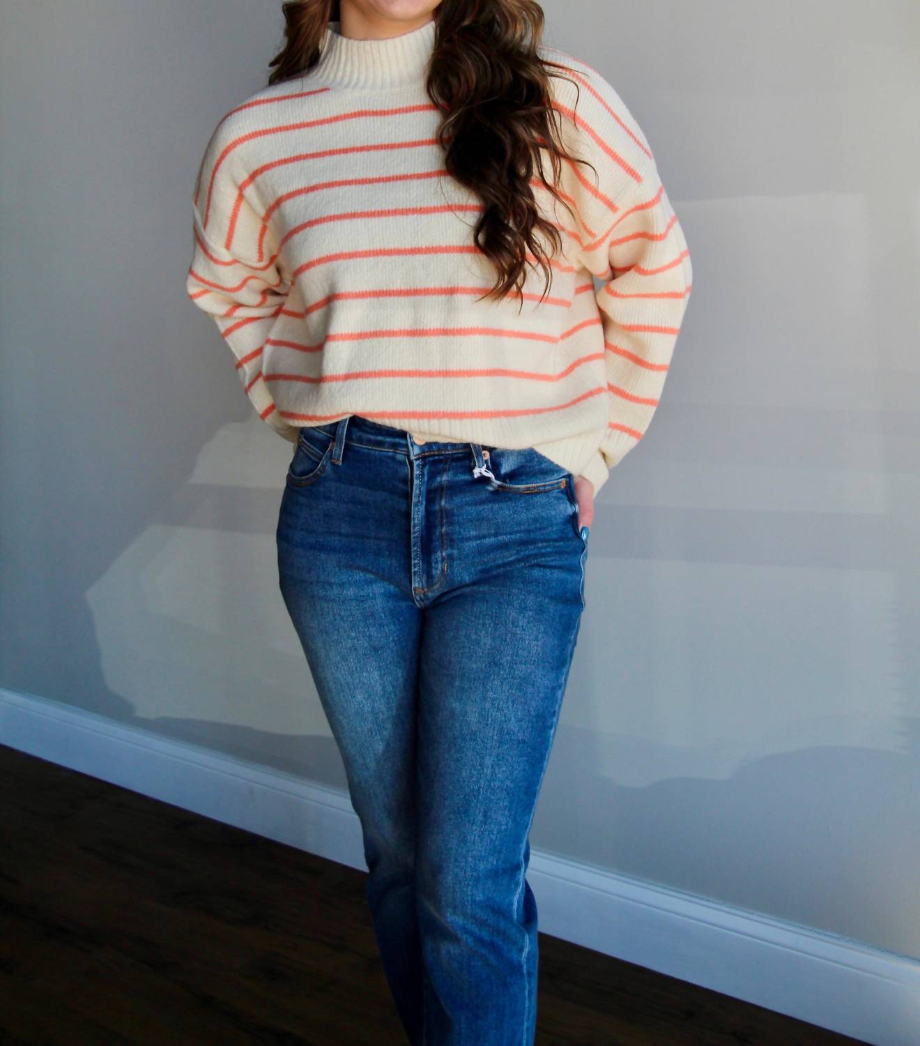 The ultimate go-to sweater, expertly crafted to provide the perfect combination of warmth and style. Its classic design and soft fabric make it a must-have addition to your wardrobe. Brighten up your days with the Geneva Striped Sweater by By Together, a cozy white piece perfect for an elevated casual style. This long sleeve sweater features a mock turtleneck and a drop shoulder design, complemented by ribbed details on the neckline, cuffs, and hemline for added texture. Its boxy fit makes it an ideal pairing with denim, offering comfort and style for any holiday party. Closure: Pull on. Perfect for fall wear. Model Kami is 5’3 and wearing a size small.