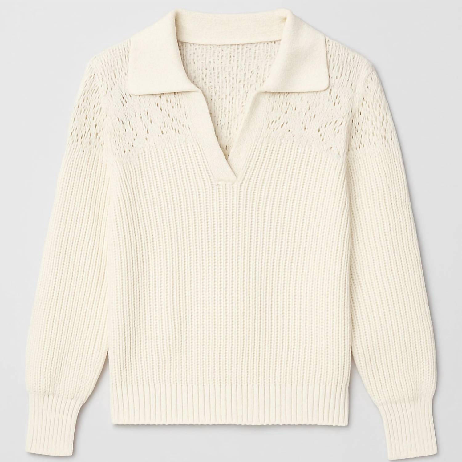 A timeless v-neck sweater that works season after season. Experience timeless elegance with the Mariana Pullover Sweater by Cecilia Prado in a sophisticated off-white hue. This long sleeve knit sweater showcases a delicate lace detail on the shoulder and a chic polo collar, perfect for travel or adaptable for any occasion. Made with textured high-quality materials, it promises comfort and fashion through fall and beyond. Closure: Pull on. Care: Hand wash and dry in the shade to preserve its quality.