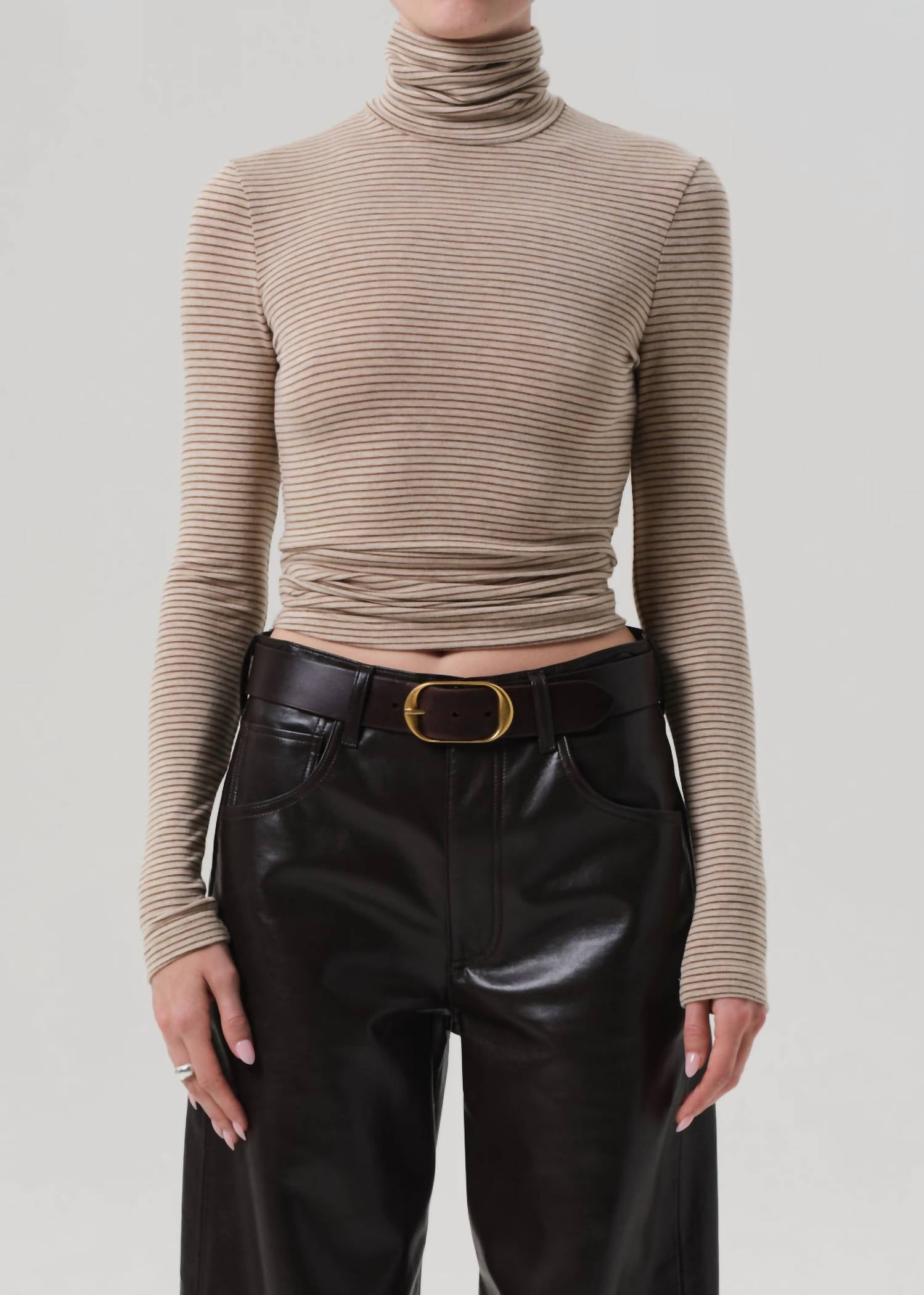 Layer under your favorite sweater or wear tucked into jeans for a perfectly polished winter look. Introducing the Caradene Turtleneck Sweater by Citizens of Humanity, an elegant winter essential for women. This long sleeve turtleneck showcases a chic Chiltern & Oatmeal stripe pattern and is crafted from a luxurious blend of 75% Rayon, 10% Recycled Cotton, 10% Recycled Polyester, and 5% Spandex for just the right amount of stretch. Measuring 23 inches in body length, this piece offers a slim silhouette that's perfect for layering or wearing alone. Closure is a pull-on style, and you can easily care for this garment by machine washing and tumble drying. Model is 5'10" and wears a size small.