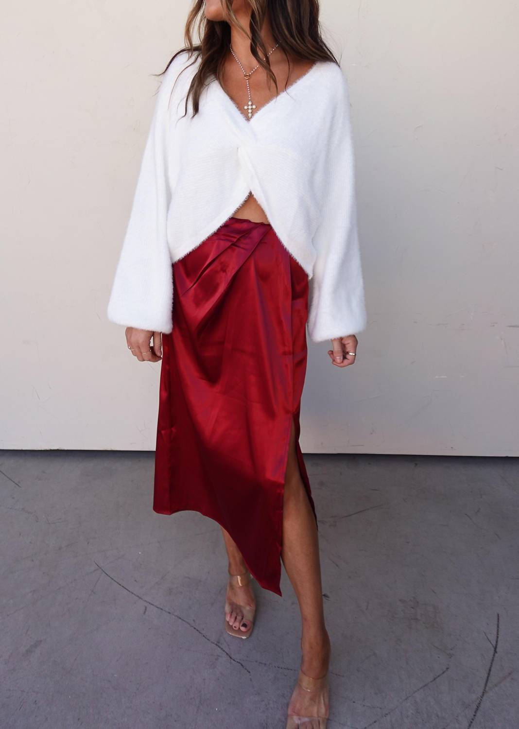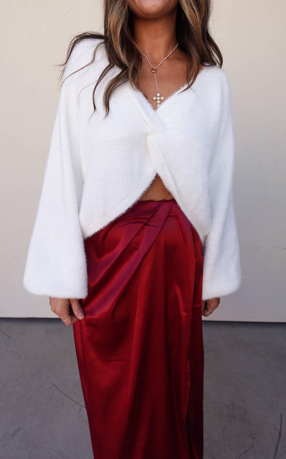 Wear this v-neck sweater with your favorite denim for the perfect fall look. Embrace timeless elegance with the Twist Front Sweater by Cozy Co. in a luxe off-white tone. This women's V-neck sweater features long sleeves with a relaxed, slightly ballooned fit and a deep twist-front detail, perfect for adding a flattering shape. Crafted from 77% Polyamide and 23% Acrylic, the cropped length pairs beautifully with high-waisted skirts or trousers. Closure: Pull-on. Care: Hand wash and line dry. Model Lauren is 5’2” and wears a Small; Elizabeth is 5’7” and wears a Medium.