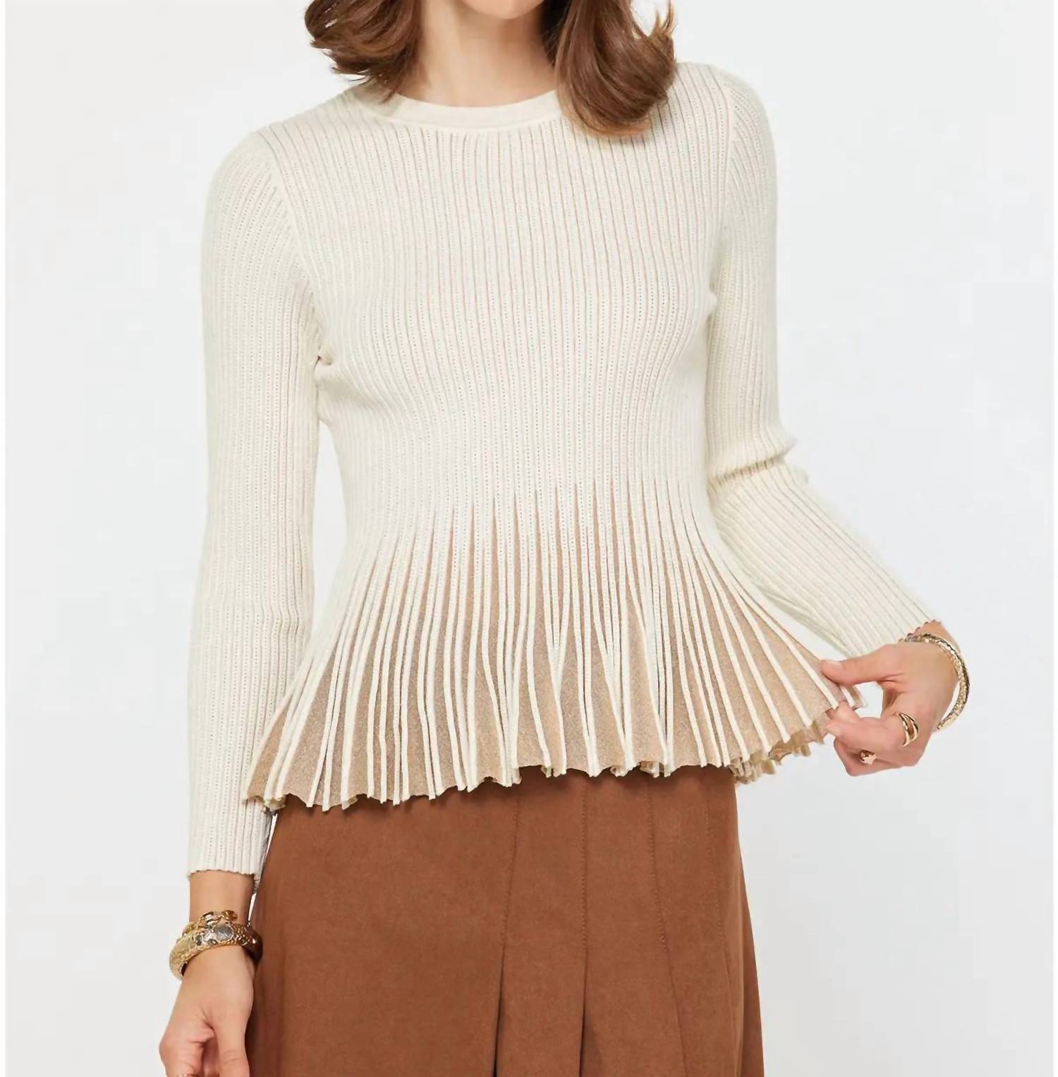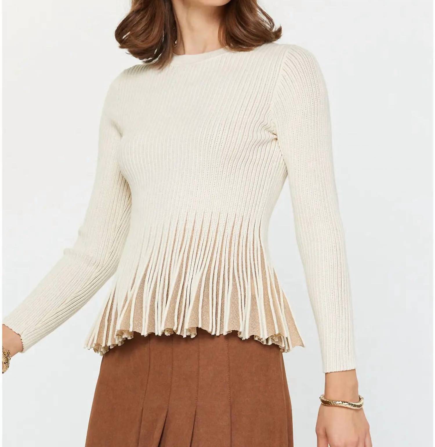 The ultimate go-to sweater, expertly crafted to provide the perfect combination of warmth and style. Its classic design and soft fabric make it a must-have addition to your wardrobe. Introducing the Shimmer Fitted Ribbed Sweater by Current Air, a chic piece in beige that effortlessly combines style and elegance. With long sleeves and a crew neckline, this sweater is made from a viscose blend, featuring a delicate metallic shimmer and a flared peplum hem with gold contrast detail. It's a pull-on style crafted from 75% viscose and 25% polyester. Care for it with a hand wash in cold water, and lay flat to dry for maintaining its elegant texture.