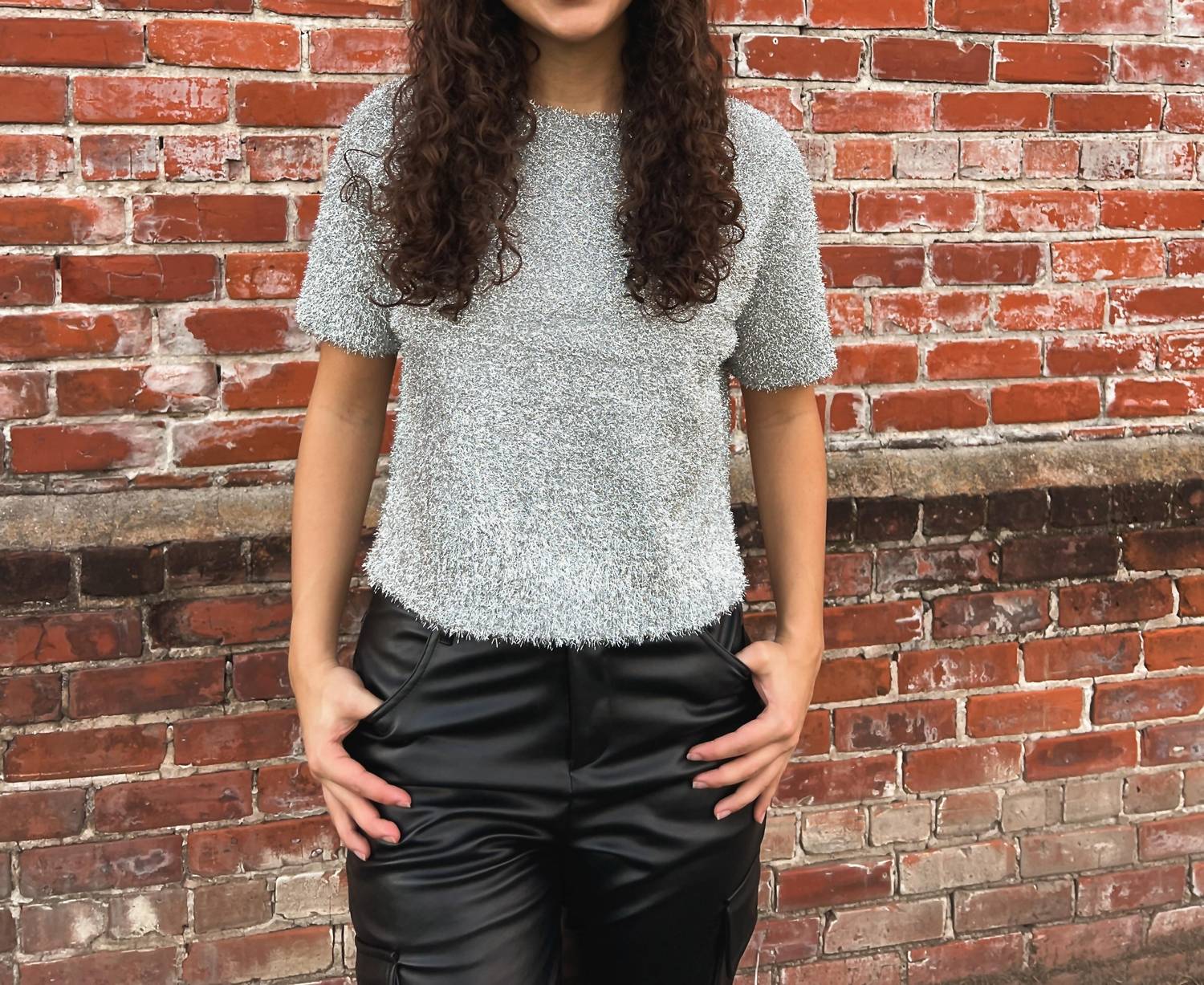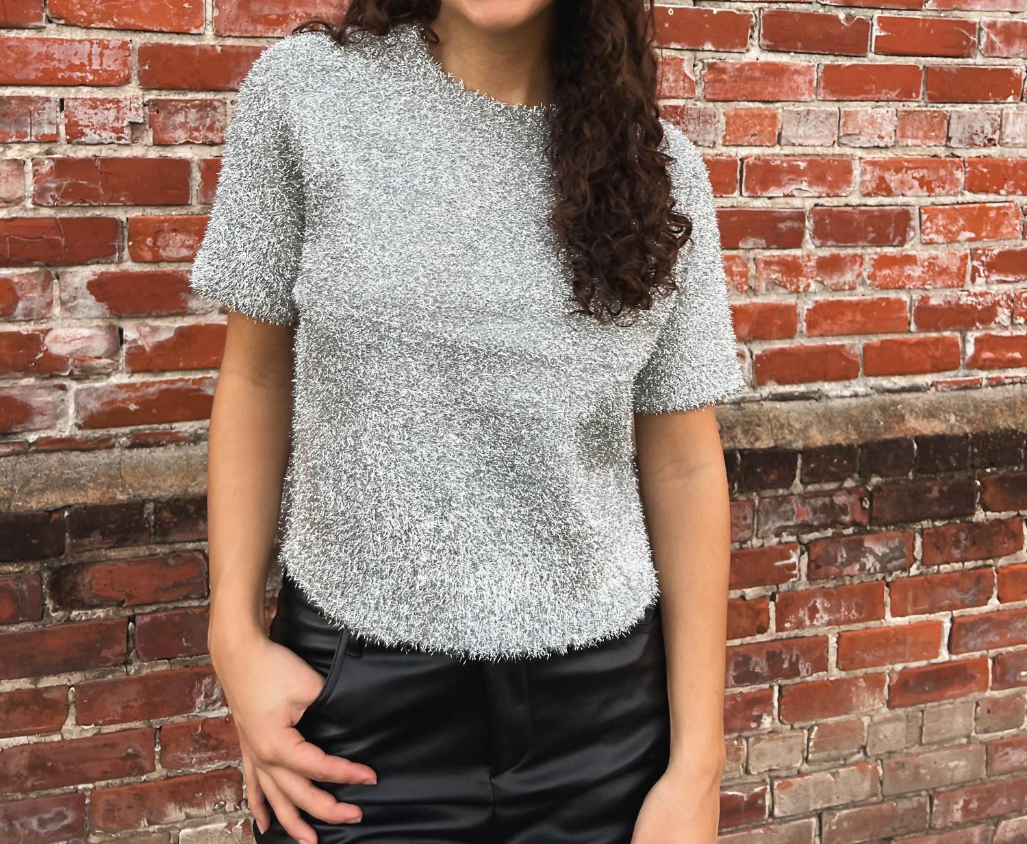 Experience the perfect blend of comfort and style with this trendy crew neck sweater, designed to effortlessly elevate your wardrobe. Pair it with your favorite denim and loafers for the perfect look. Introducing the Adeline Short Sleeve Sweater Top by Design History, a playful and sparkly addition to your wardrobe. This short-sleeved top is crafted from 100% polyester, offering a shimmering silver hue perfect for New Year's Eve celebrations. Designed with a classic crewneck, it features a textured pattern that channels 90s fashion trends. Closure: Pull-on style. Model is wearing a size XS. Ideal for women's holiday parties this spring.