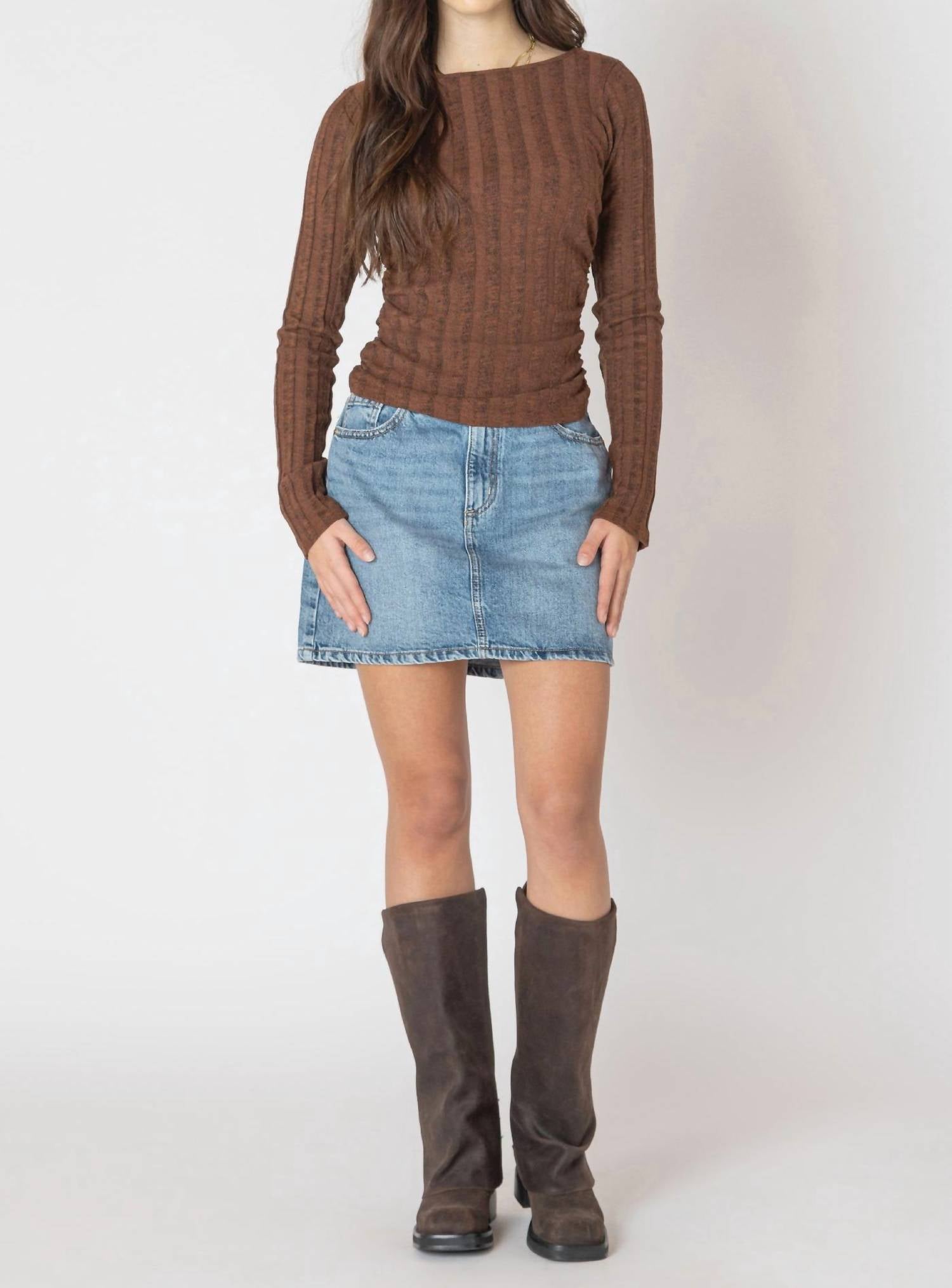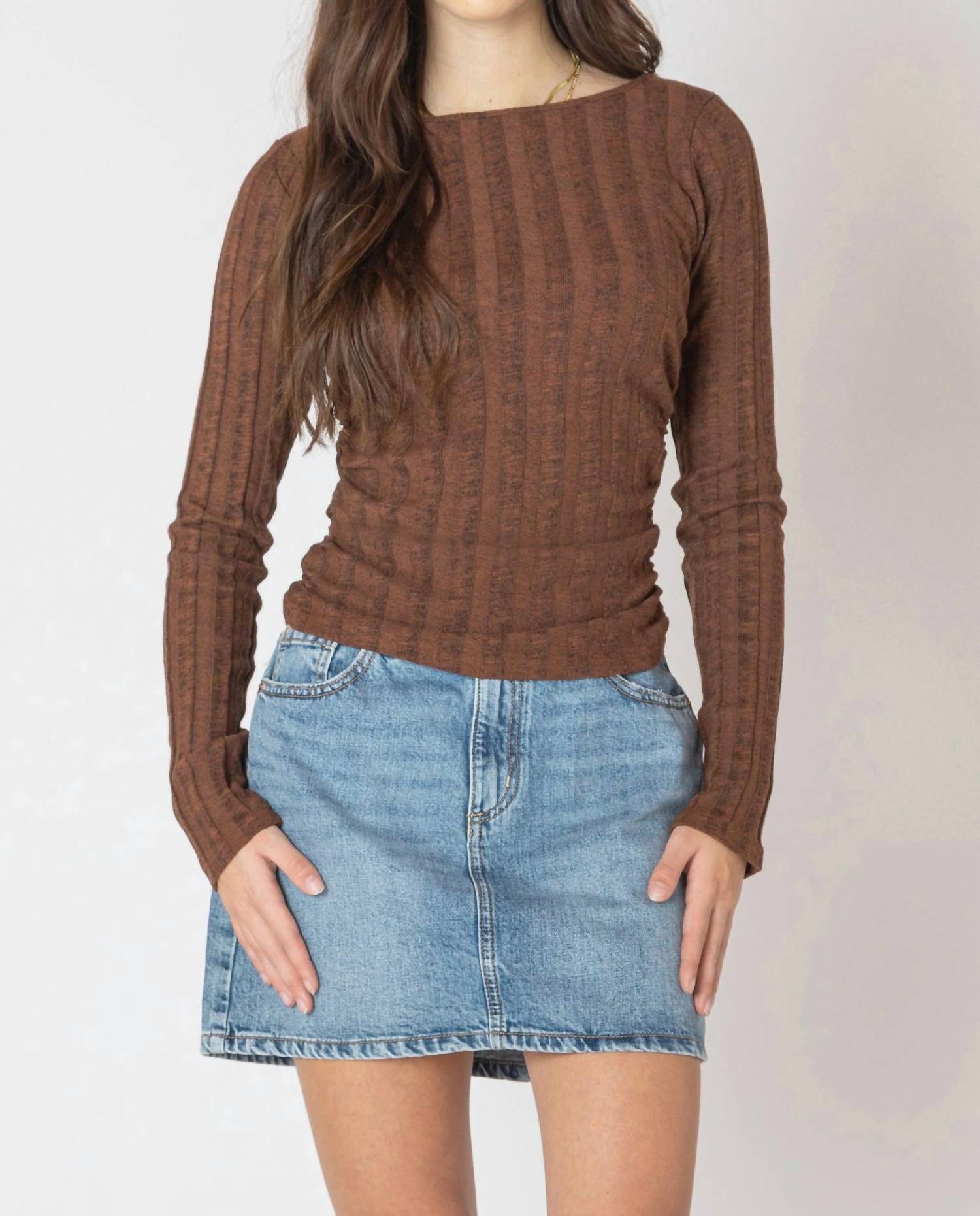 Experience the perfect blend of comfort and style with this trendy crew neck sweater, designed to effortlessly elevate your wardrobe. Pair it with your favorite denim and loafers for the perfect look. Discover the Dex Long Sleeve Ribbed Sweater, an essential fall piece for women that provides style and comfort. Crafted from a cozy cotton blend, this textured sweater in marled brown features a flattering boat neckline with ruching on both sides. Designed to hit at the hip, it ensures a true-to-size fit with a pull-on closure. Care is a breeze with machine washable instructions, making it perfect for any Thanksgiving or vacation occasion.