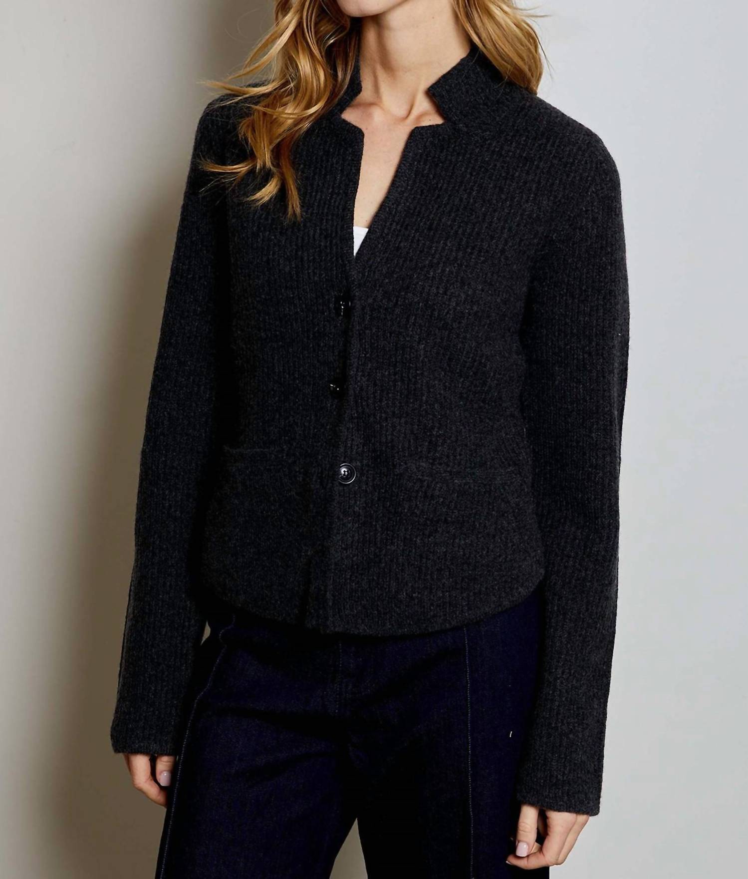 You'll be reaching for this comfy and classic v-neck sweater all season long. Embrace timeless elegance with the Evelyn Cardigan from dh NEW YORK, a staple piece in versatile black. Made from a luxurious cotton blend with a composition of 9% Cashmere, 49% Nylon, 27% Wool, and 15% Acrylic, this long-sleeve cardigan features a sophisticated collar and a button closure. Ideal for winter travel and New Year's Eve gatherings, its textured design adds a minimalist touch to any look. Care for this women's cardigan by dry cleaning to maintain its quality and texture.