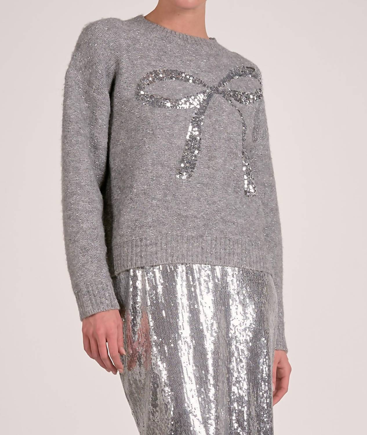 Stay warm and stylish in this versatile and effortlessly cool knitwear staple. Wear it alone or layered, it's the perfect sweater for the season and you'll wish you had it in every color. Introducing the Elan Crewneck Bow Sweater, a festive yet sophisticated piece perfect for the holiday season. This long sleeve sweater is made from a blend of polyester, acrylic, and elastane, offering both comfort and style. With a crewneck design and pull-on closure, it features a stunning sequin bow embellishment for a touch of sparkle. Elevate your festive wardrobe effortlessly with this minimalist, yet chic, silver piece.