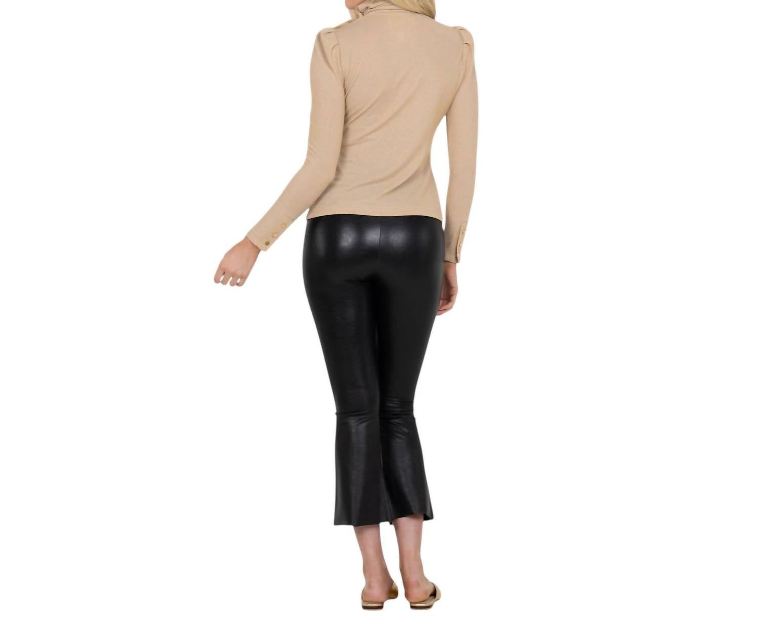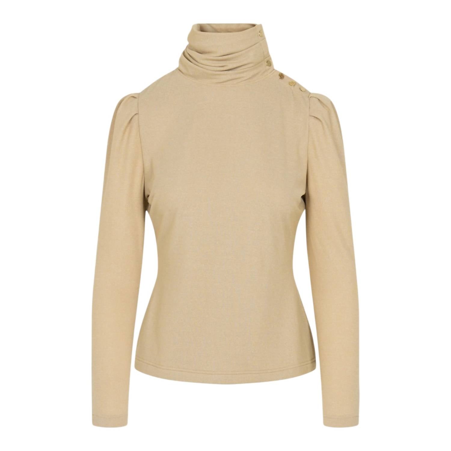 Fit to perfection and effortlessly chic. Introducing the Tessa Turtleneck Knit Sweater by Emily McCarthy, a chic choice for a refined autumn look. This metallic gold sweater features long sleeves with gold button details, a gathered mock neck, and a tailored silhouette. Crafted from 72% Nylon, 16% Polyester, 8% Metallic, and 4% Spandex, this pull-on piece adds a subtle shimmer to any outfit. Care: Hand wash with gentle detergent in cold water and lay flat to dry. Model Emma is 5'10" and wearing an XS.
