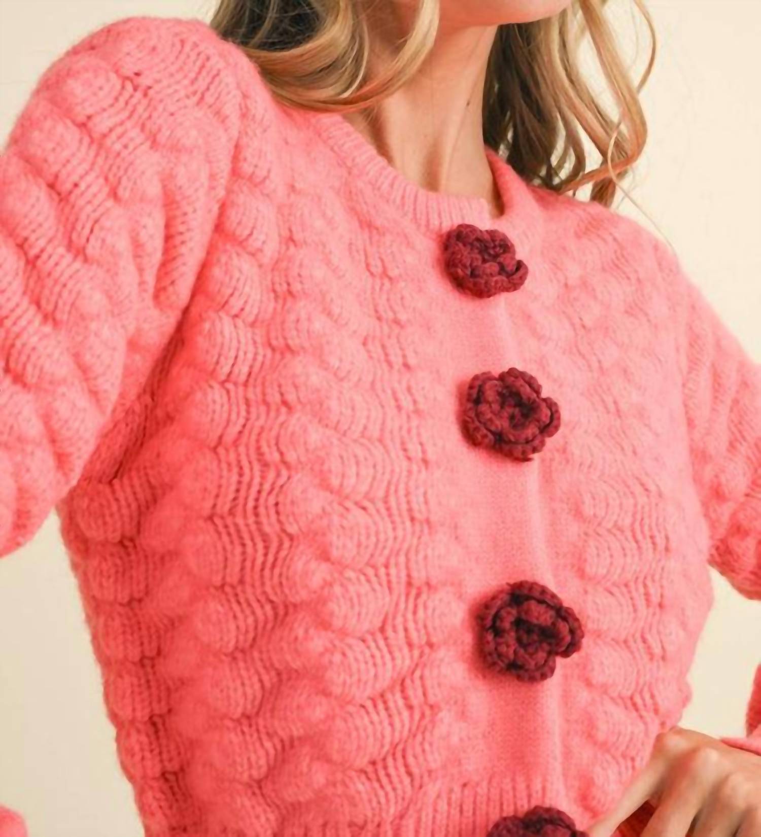 Throw this adorable cardigan over any cami or tank top. Stay stylishly cozy with the Rosette Cardigan by En Merci, crafted in a vibrant Coral Pink hue. This long-sleeve piece, made from a textured 42% Acrylic, 30% Polyester, 28% Nylon Blend, features delightful knitted rosette accents and a relaxed fit for added comfort. The cardigan boasts a crew neckline and button closure, while the ribbed cuffs and hem complete the look. Perfect for a holiday party, this Boho Chic cardigan is ideal for the fall season. Model is 5'10.5" with a 32-24-36 figure and wears a size S.