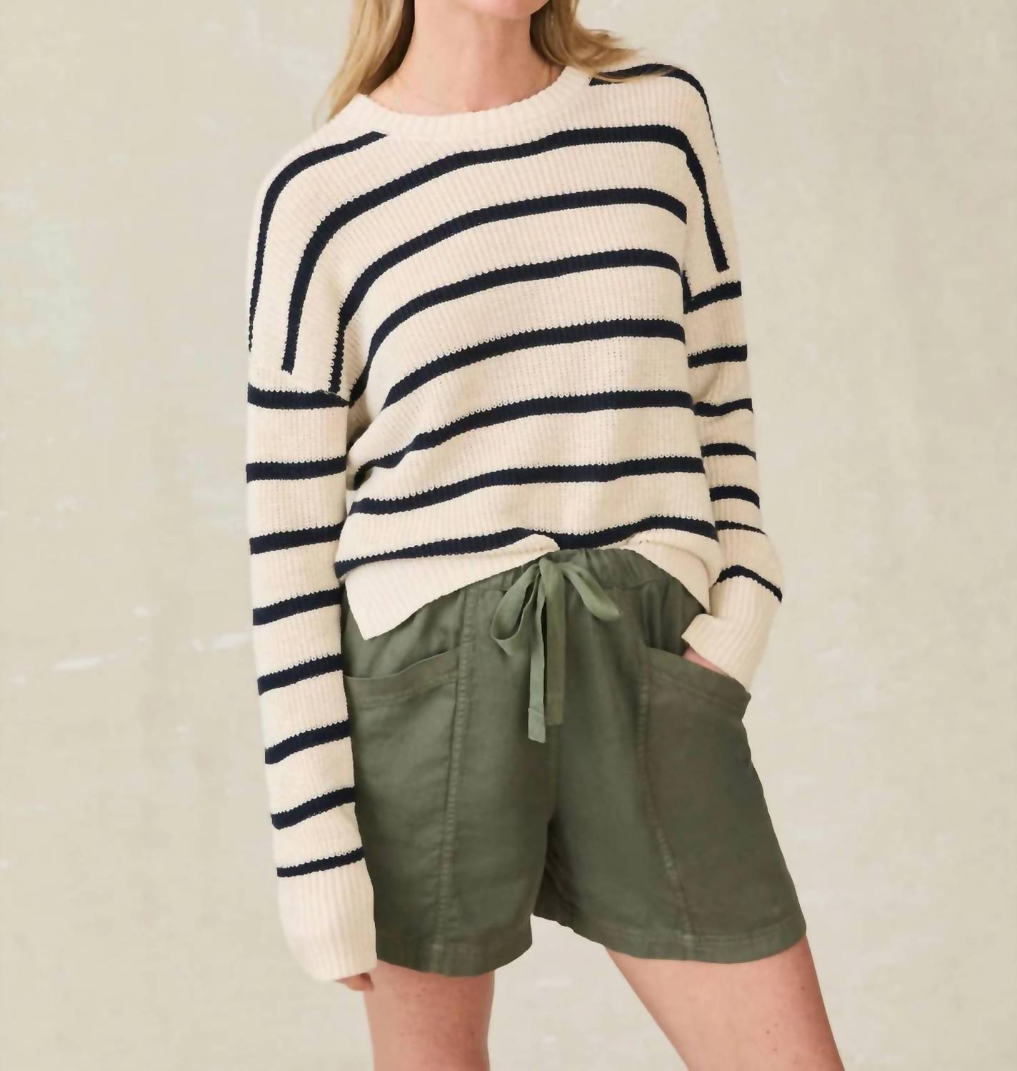 Experience the perfect blend of comfort and style with this trendy crew neck sweater, designed to effortlessly elevate your wardrobe. Pair it with your favorite denim and loafers for the perfect look. The Faherty Miramar Linen Crewneck Sweater in Montauk Stripe combines comfort and style with its lightweight linen-cotton blend, perfect for seasonal transitions. Featuring loosely-knit half cardigan stitching and rib trims, it offers a relaxed 22" length fit with long sleeves and side slits for added elegance. Composition: 64% Linen, 36% Organic Cotton. Closure: Pull on style. Care: Hand wash cold with like colors, lay flat to dry, cool iron if needed, and dry cleanable.