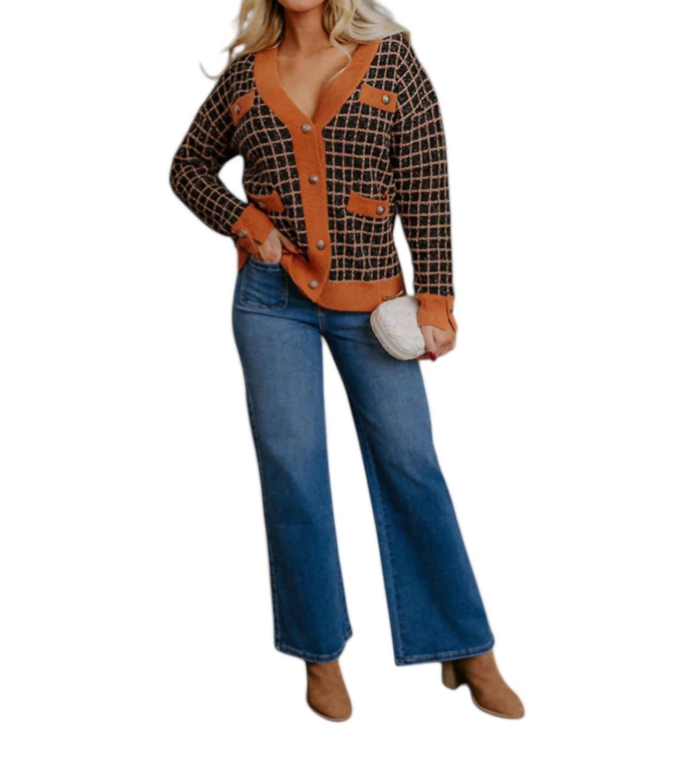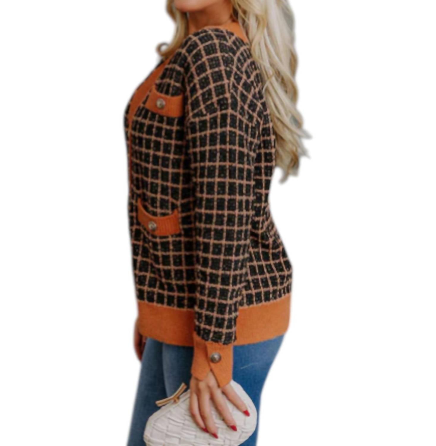 A classic fit that works just as good buttoned as it does left open. Meet the Checkered Cardigan by Fate, an essential piece for elevating your everyday style with its timeless design and subtle shine. This women's cardigan in black and camel features long sleeves and is crafted from 80% polyester, 10% acrylic, and 10% nylon, forming a relaxed silhouette with a checkered pattern and golden tinsel. The piece is accentuated with a V-neckline, gold-toned lion design buttons, faux chest pockets, and functional low front pockets. Adorn your fall streetwear collection with this versatile button closure cardigan, designed to add a touch of elegance to any outfit.