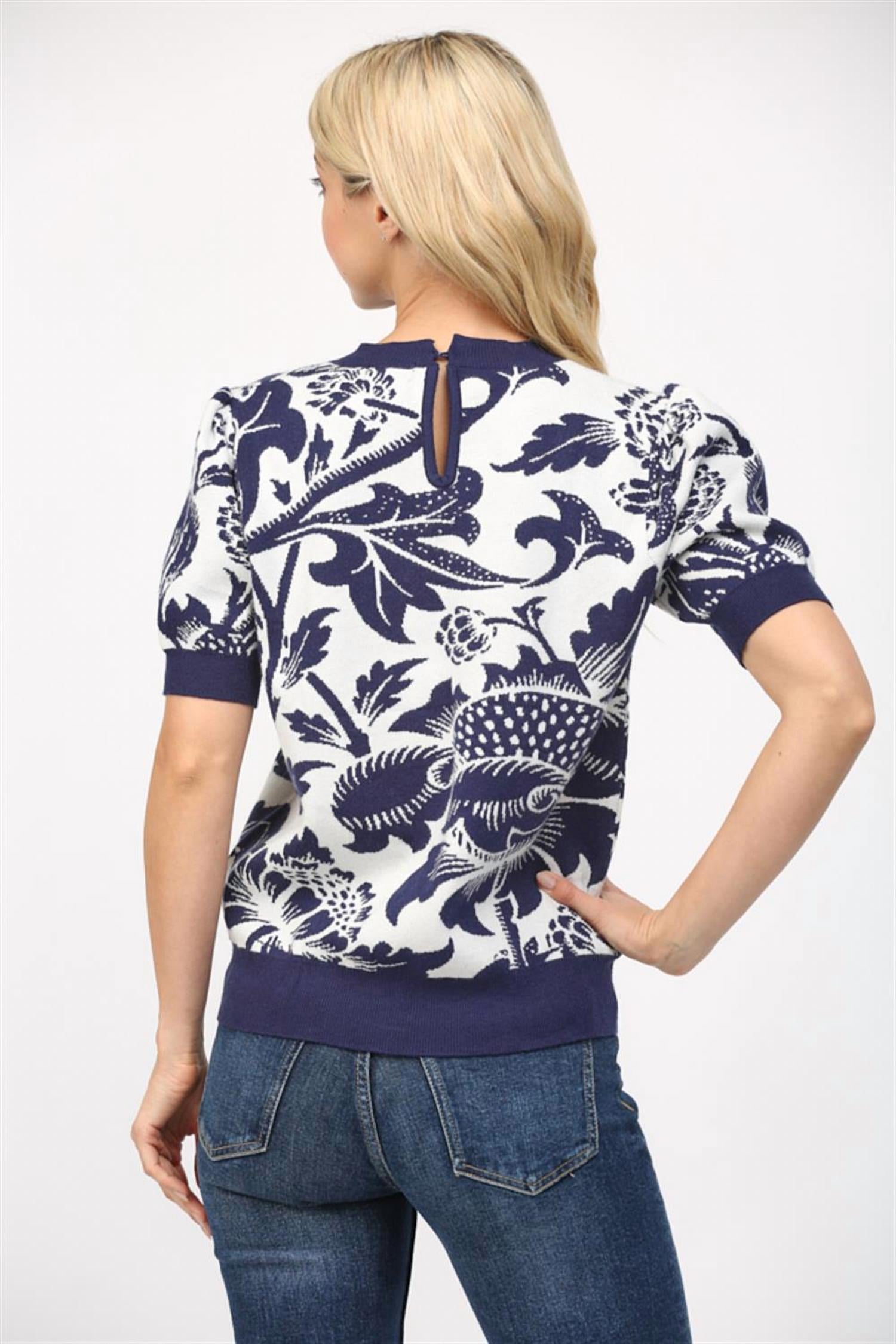 The ultimate go-to sweater, expertly crafted to provide the perfect combination of warmth and style. Its classic design and soft fabric make it a must-have addition to your wardrobe. Elevate your spring wardrobe with the Women's Southern Living Sweater by Fate, featuring a charming floral motif jacquard design. This blue sweater boasts short puff sleeves and a classic crewneck, perfect for a minimalist vacation look. Closure is effortless with a pull-on style for convenience and comfort. Please note this piece is designed for women and does not include pockets.