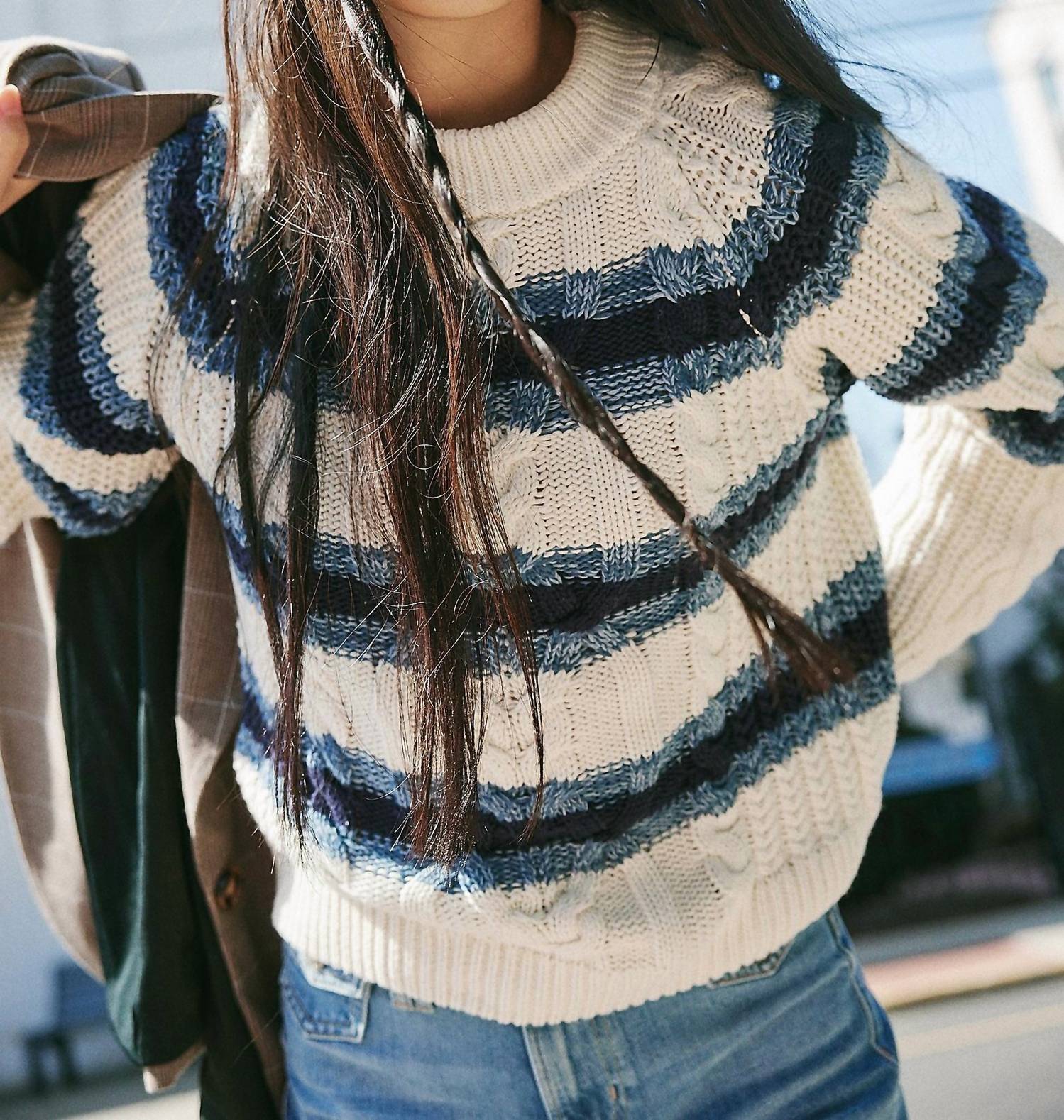 The ultimate go-to sweater, expertly crafted to provide the perfect combination of warmth and style. Its classic design and soft fabric make it a must-have addition to your wardrobe. Introducing the Frankie Striped Cable Knit Sweater by Free People, a stylish addition to your fall wardrobe in an Ivory Combo hue. This chunky sweater features long sleeves, crafted from 100% cotton in a classic crewneck design. The cropped, boxy style with a pull-on closure makes it perfect for layered looks. Care for this vintage-inspired piece by hand washing cold.