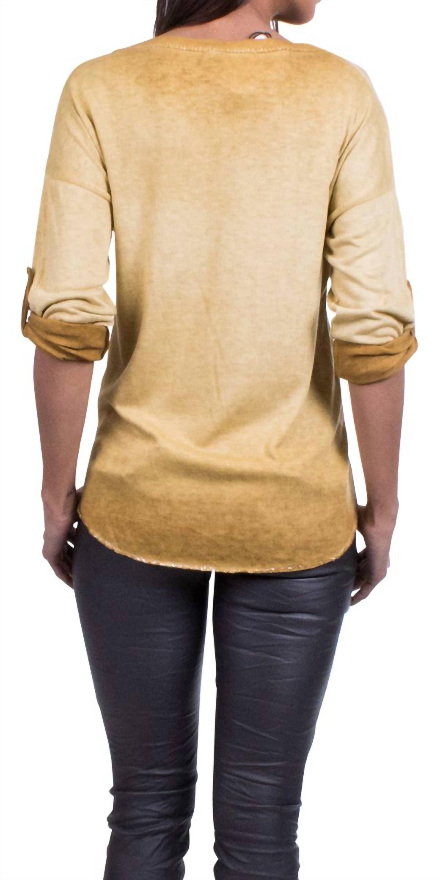 The ultimate go-to sweater, expertly crafted to provide the perfect combination of warmth and style. Its classic design and soft fabric make it a must-have addition to your wardrobe. Introducing the Alicia Blouse Sweater by GIGI MODA, a stunning mustard piece perfect for fall travel and Thanksgiving celebrations. This versatile women’s top features long sleeves that can be worn cuffed or long, crafted from a luxurious viscose blend with 95% Viscose and 5% Elastane. Made in Italy, it boasts a delightfully soft and shimmery feel with a silver stitch line and a unique faux pocket detailing. The sweater is easy to wear with a pull-on closure and offers great fit flexibility as it is one size fits most. For care, hand wash and lay flat to dry. It's a perfect blend of style and comfort with a chic crewneck design, suiting your workwear and travel wardrobe. Suitable for one size, model is 5'8".