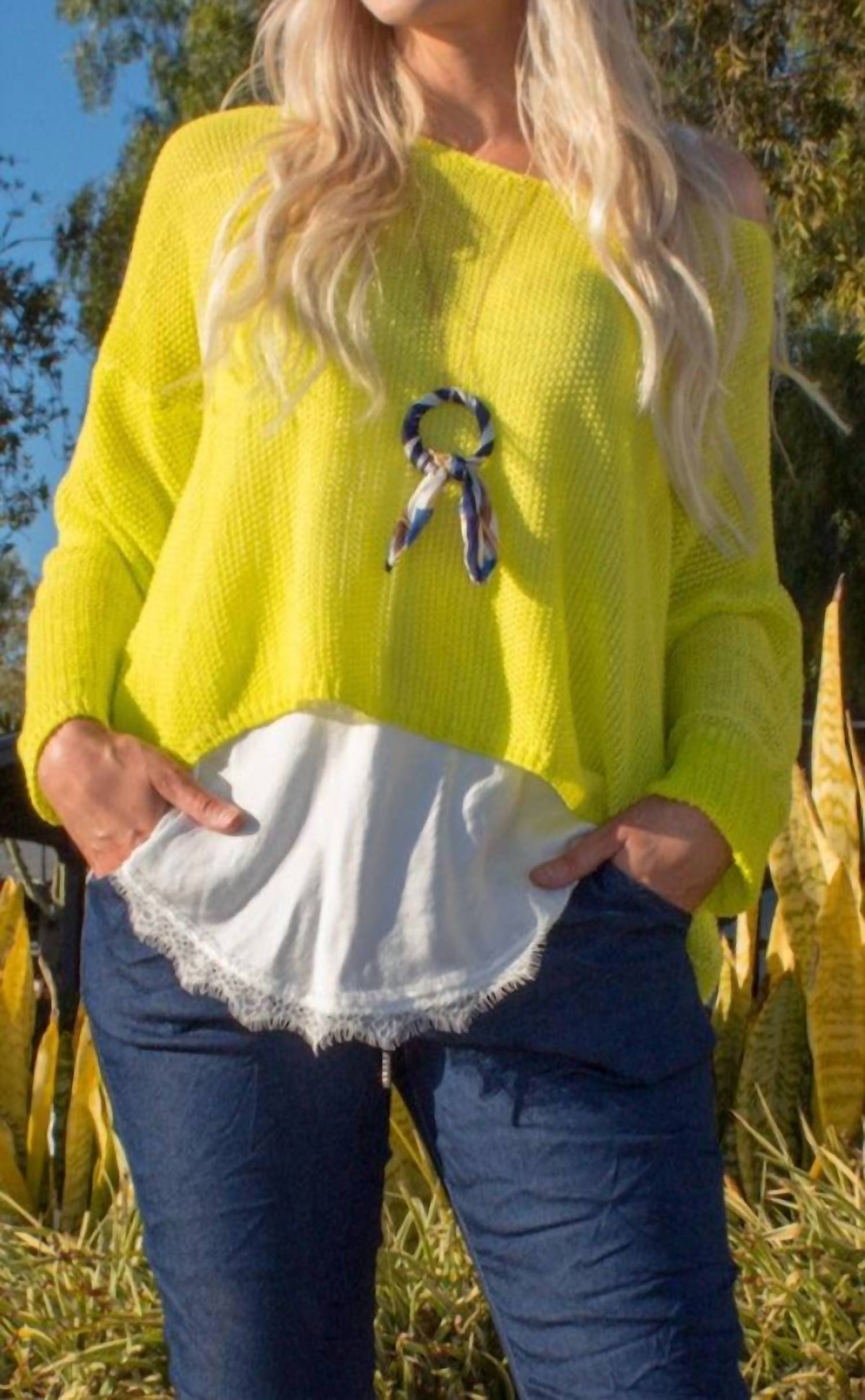 Experience the perfect blend of comfort and style with this trendy crew neck sweater, designed to effortlessly elevate your wardrobe. Pair it with your favorite denim and loafers for the perfect look. Introducing the Caprice Scoop Neck Sweater by GIGI MODA, a textured piece in a vibrant lime hue designed for year-round appeal. This lightweight knit features long sleeves with an easy roll-up design for adaptable styling. Composition: 55% Modal, 45% Acrylic. Origin: Made in Italy. Closure: Pull on. Care: Hand wash, lay flat to dry. Model height: 5'8". Available in one size.