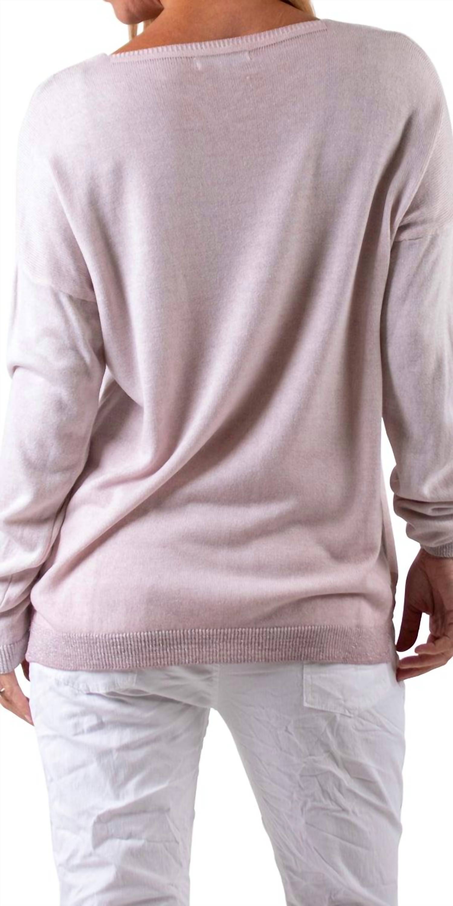 Wear this v-neck sweater with your favorite denim for the perfect fall look. Embrace the season with the La Neve Knit V-neck Sweater by GIGI MODA, an elegant addition to your preppy fall wardrobe. This women’s long-sleeve sweater features a charming embossed snowflake graphic on the front and glittery cuffs and hemline for a touch of sparkle. Crafted from 55% Modal and 45% Acrylic, this Italian-made sweater offers a luxurious feel in a versatile pink hue. Closure: Pull on. Care: Hand wash and lay flat to dry. Model is 5'8". One size fits most.
