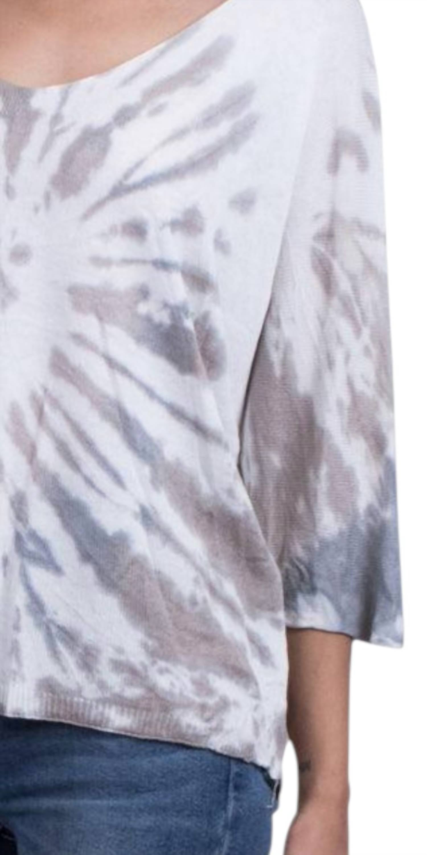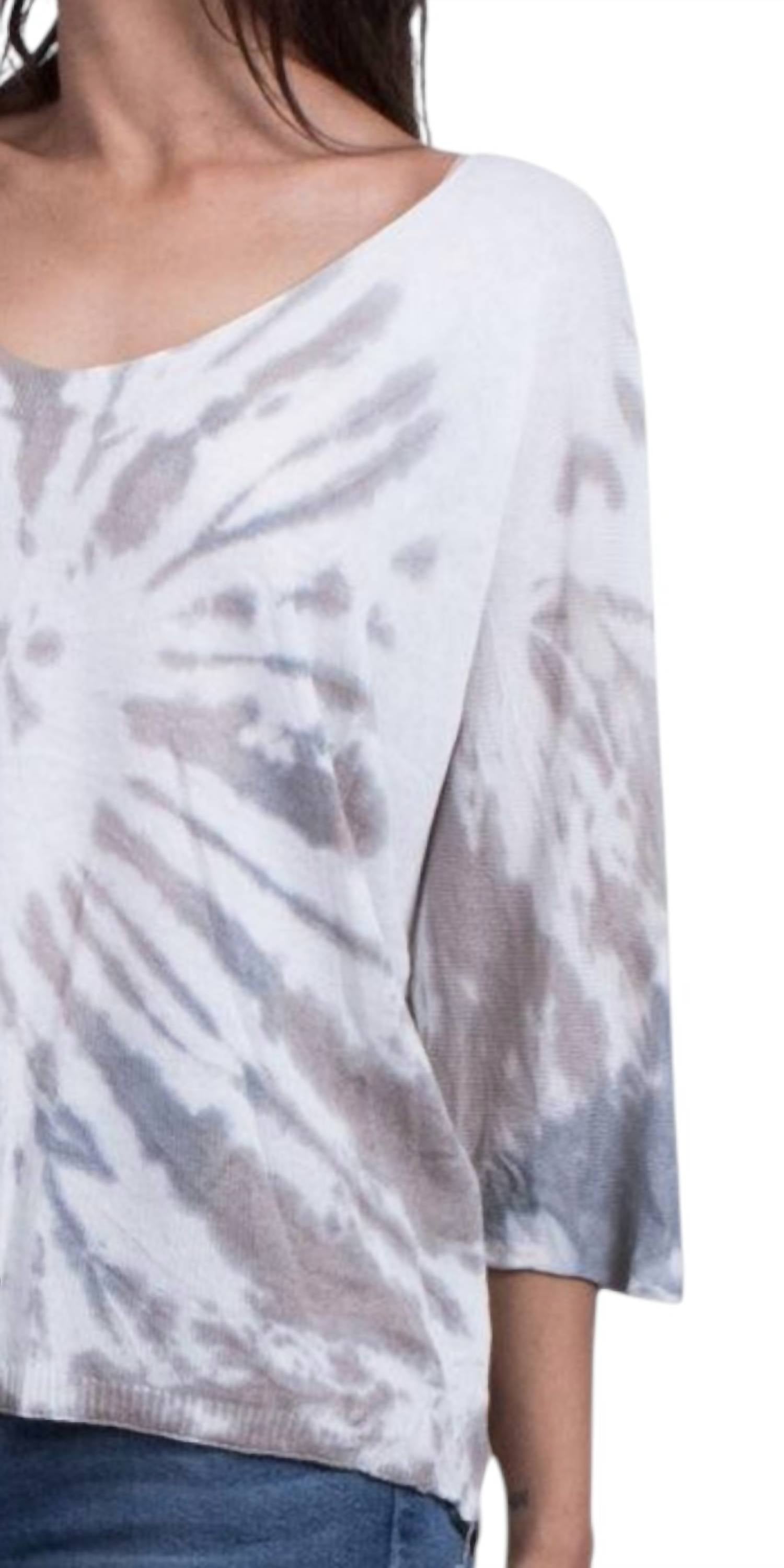 Introducing the Petunia Scoop Neck Tie Dye Sweater by GIGI MODA, a stylish addition to any wardrobe with its on-trend tie-dye pattern in taupe and grey. This women's sweater features three-quarter sleeves and a comfortable scoop neck for a relaxed, yet chic look. Made from a luxurious blend of 55% modal and 45% acrylic, it's crafted in Italy to ensure quality and elegance. The pull-on design makes it easy to wear, and care is simple with hand wash and line dry instructions. Ideal for summer streetwear, it comes in one size that fits most. Model is 5'8".