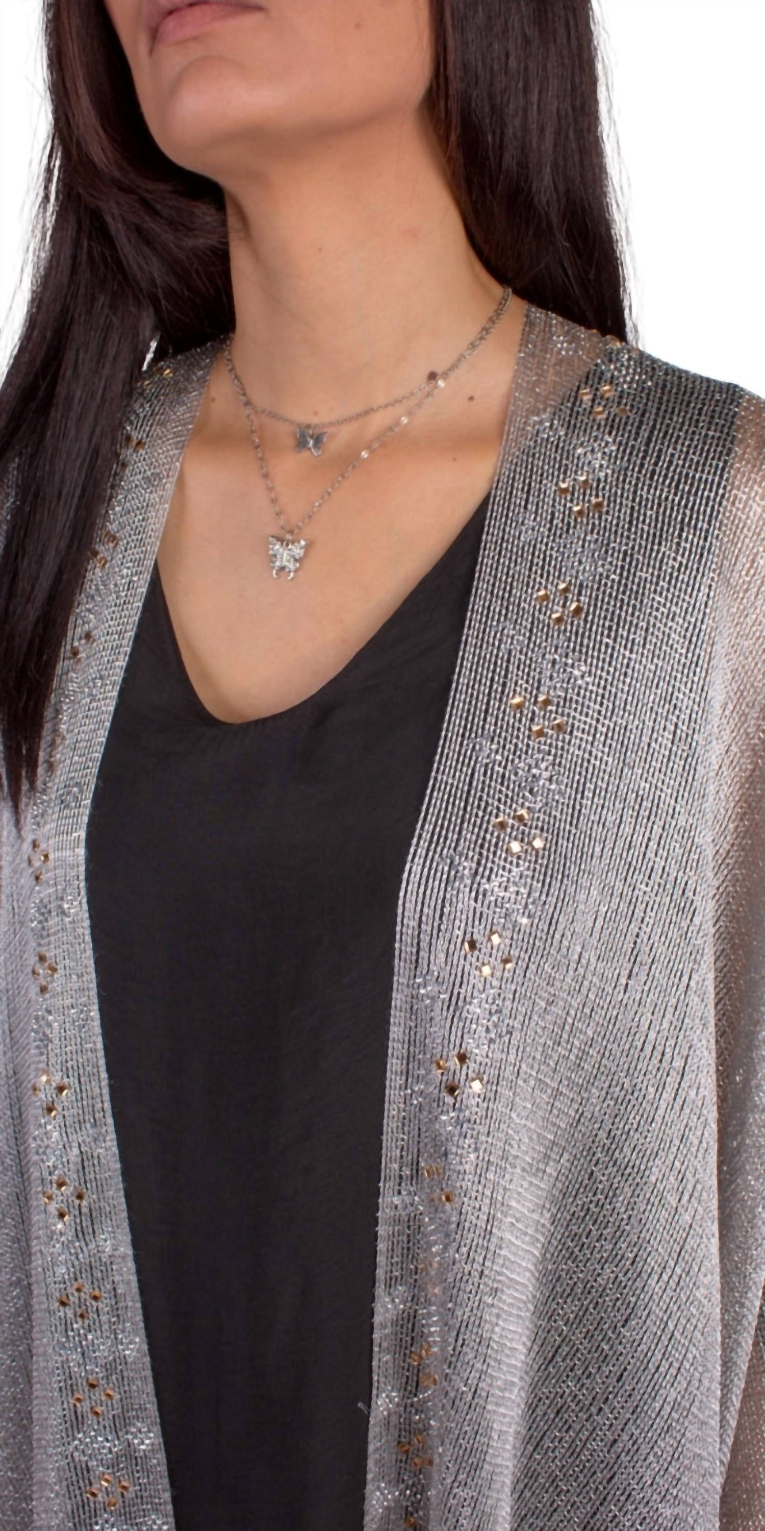 A classic fit that works just as good buttoned as it does left open. Discover the Spiaggia Open Front Kimono by GIGI MODA, a preppy addition to your fall wardrobe. This shimmery silver cardigan features three-quarter sleeves and a crewneck, perfect for layering. Made from 100% polyester with bedazzled details and a fringe bottom, it's designed in a one-size-fits-most silhouette. Closure: Pull on. Care: Hand wash, line dry. Model is 5'7".