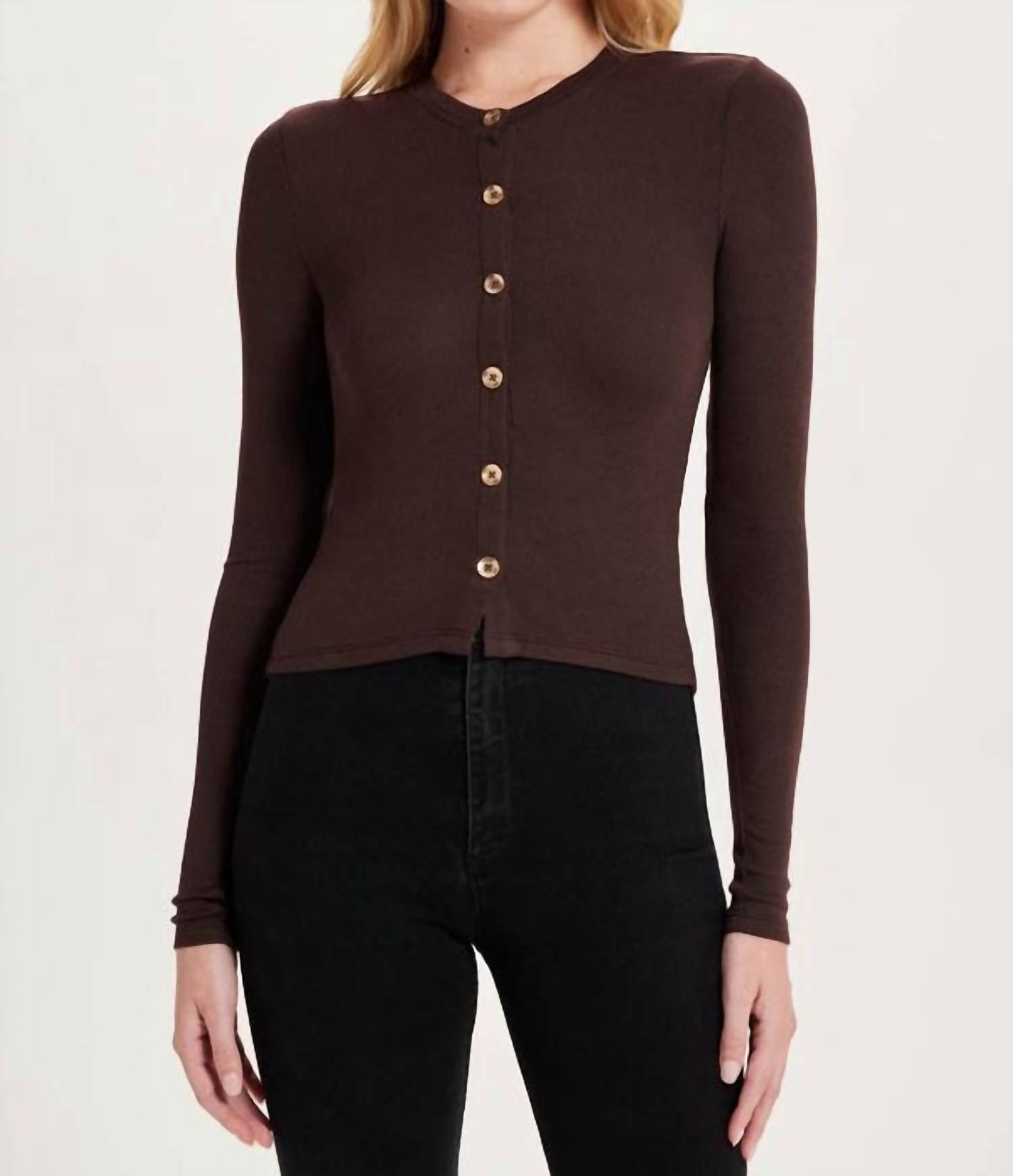 This cardigan will be a sweater-rotation favorite. Elevate your fall wardrobe with the Coffee Crop Long Sleeve Cardigan by GOLDIE, perfect for Thanksgiving and evening events. Crafted from 96% Modal and 4% Spandex, this cardigan promises comfort and style with its solid monochrome look. Originating from Peru, it features a crewneck design, long sleeves, pockets for added convenience, and a button closure for easy wear. For care, simply machine wash to maintain its quality.