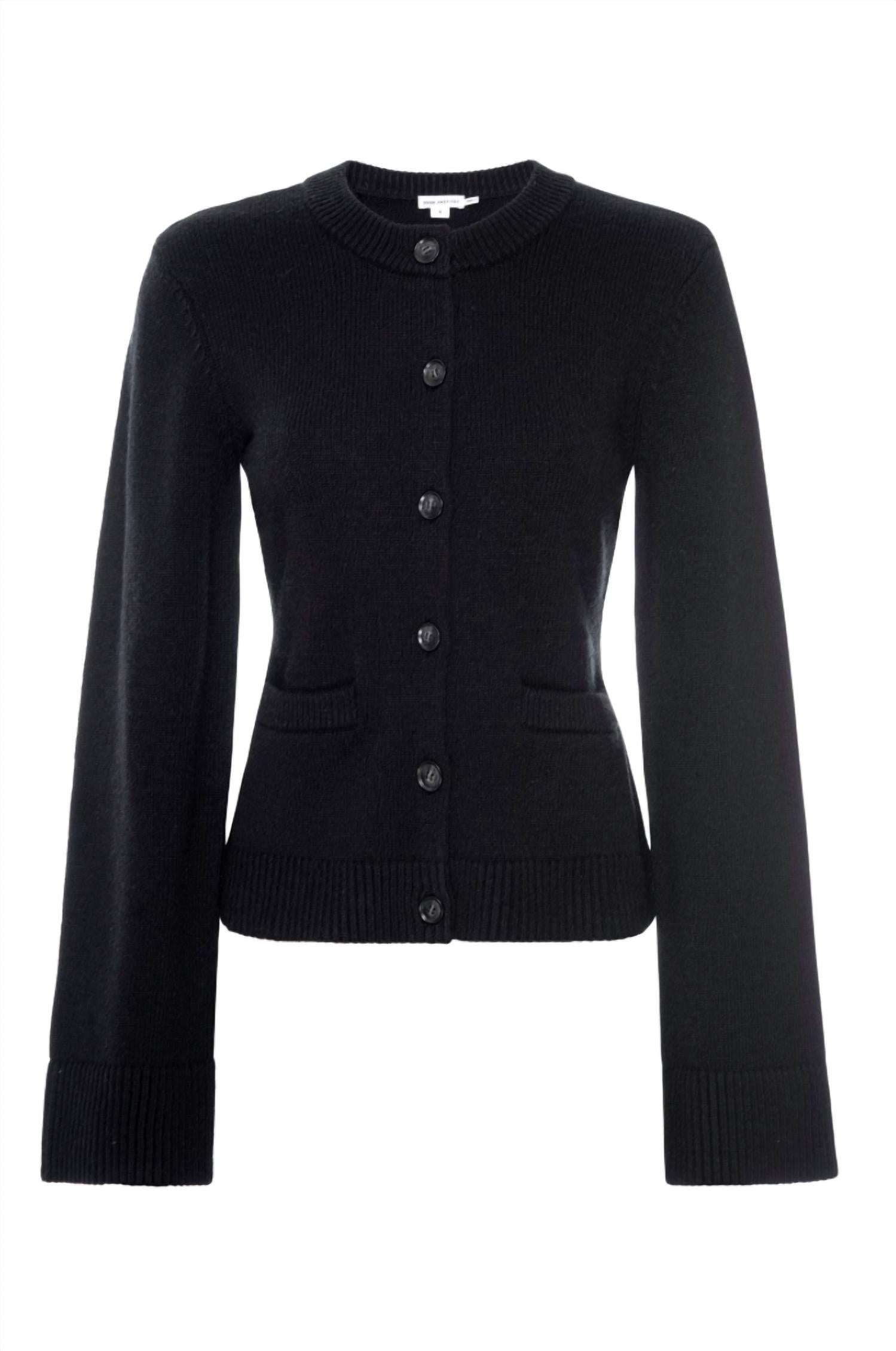 This cardigan will be a sweater-rotation favorite. Embrace elegance with the Women's Knit Cardigan by Good American, designed for both versatility and style. This black, long sleeve piece features a classic crewneck and a button-up closure for a sleek, slim fit. Made from a soft blend of 48% Viscose, 28% Polyester, and 24% Nylon, it offers a delightful texture and comfortable wear. Care is simple: machine wash cold with similar colors or opt for dry cleaning.