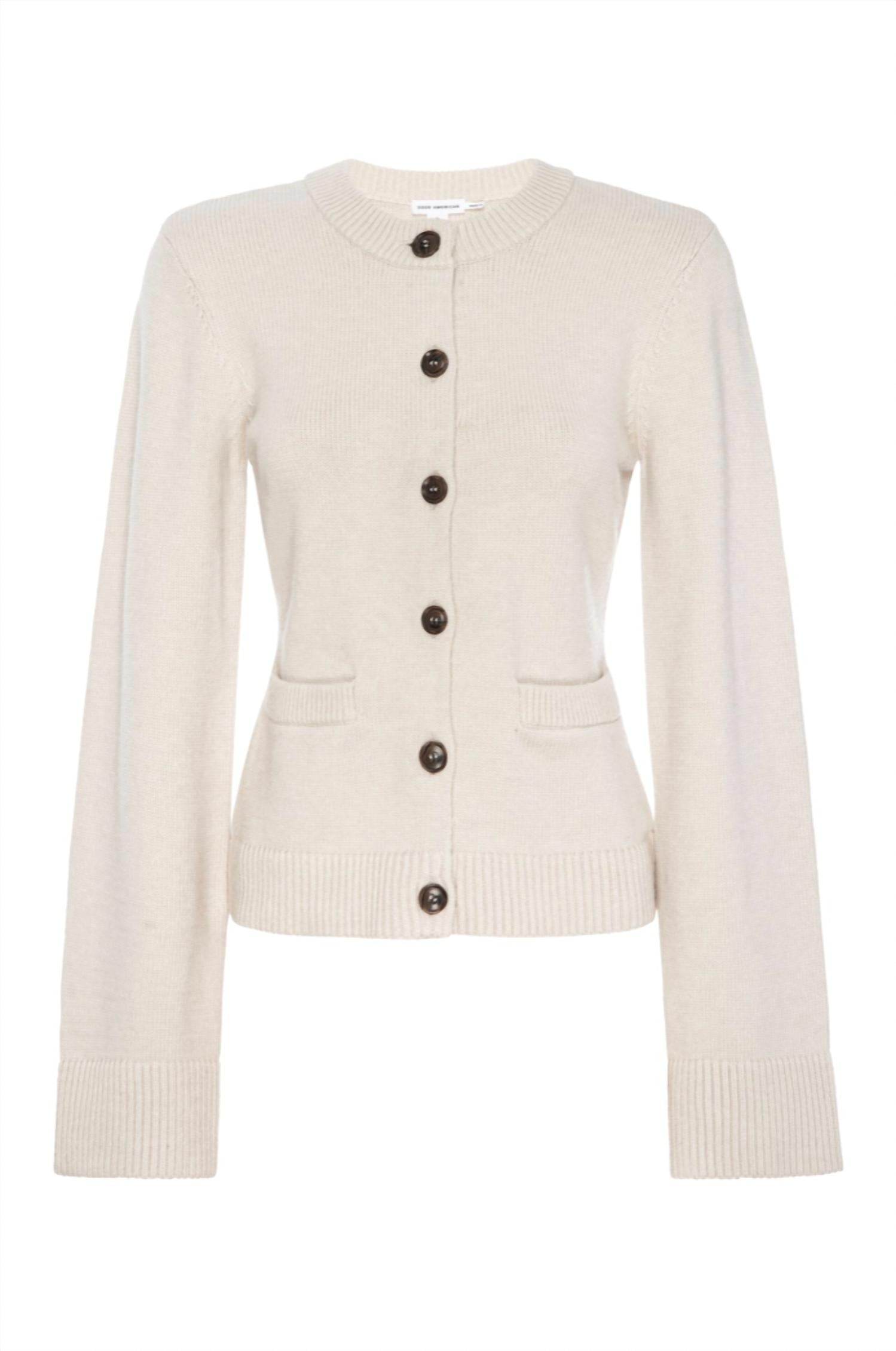 A classic fit that works just as good buttoned as it does left open. Meet the Women's Knit Cardigan by GOOD AMERICAN, a stylish piece in a versatile vanilla hue perfect for any dinner party occasion. This long sleeve cardigan is crafted from a smooth blend of 48% Viscose, 28% Polyester, and 24% Nylon, offering a flattering slim fit with a preppy, refined aesthetic. Featuring a classic crew neckline, button closure, and practical pockets, this cardigan seamlessly combines functionality with style. Care is simple with a machine wash cold with similar colors option or a professional dry clean.