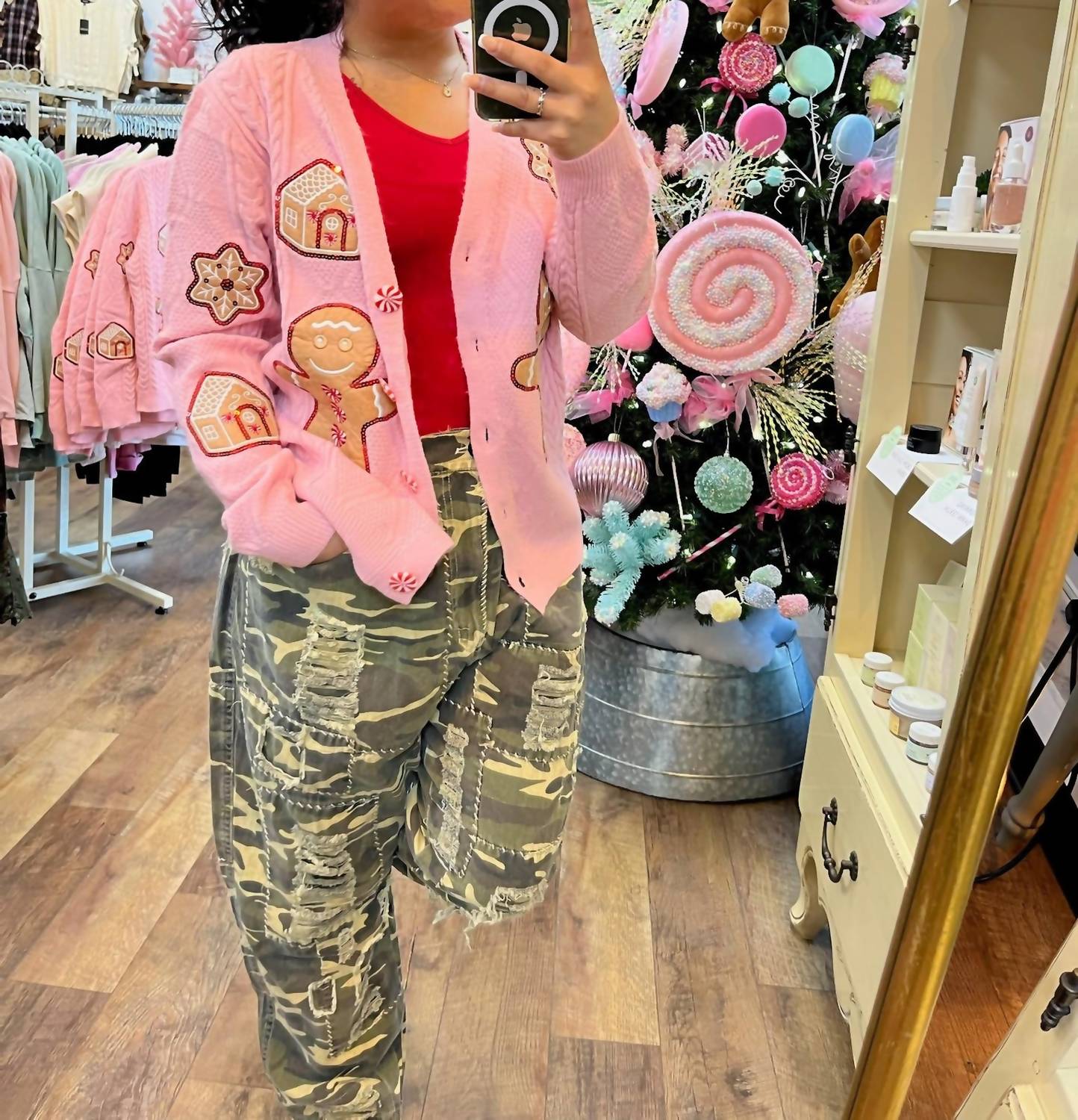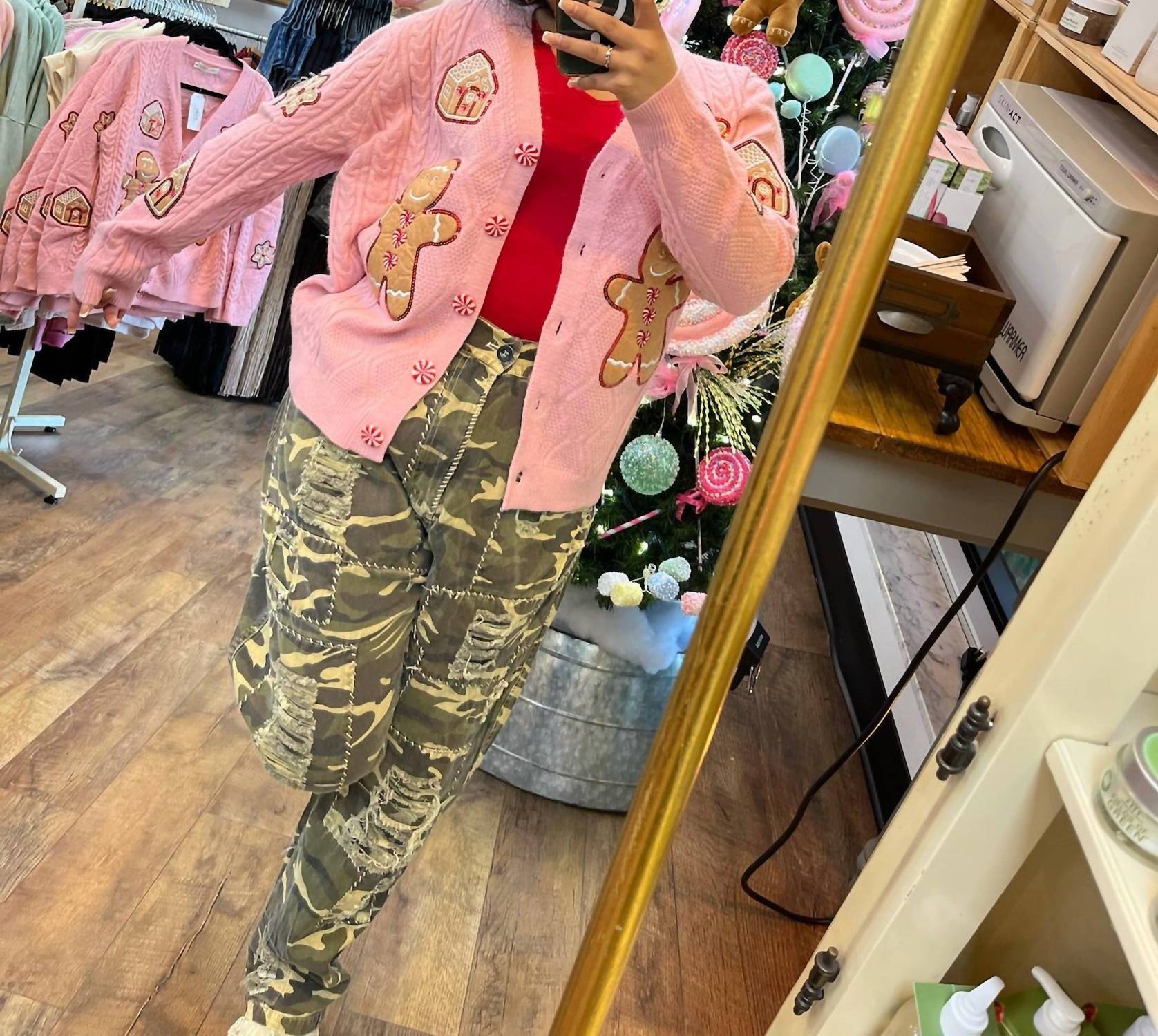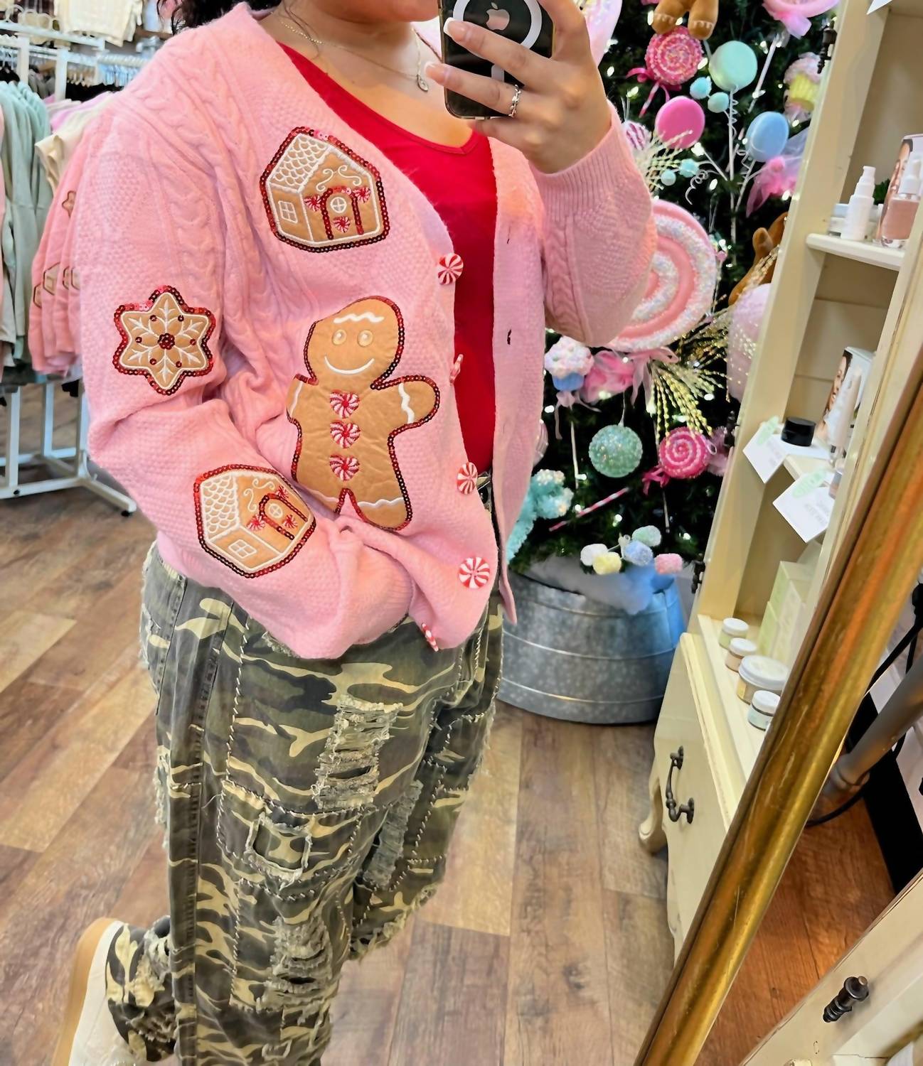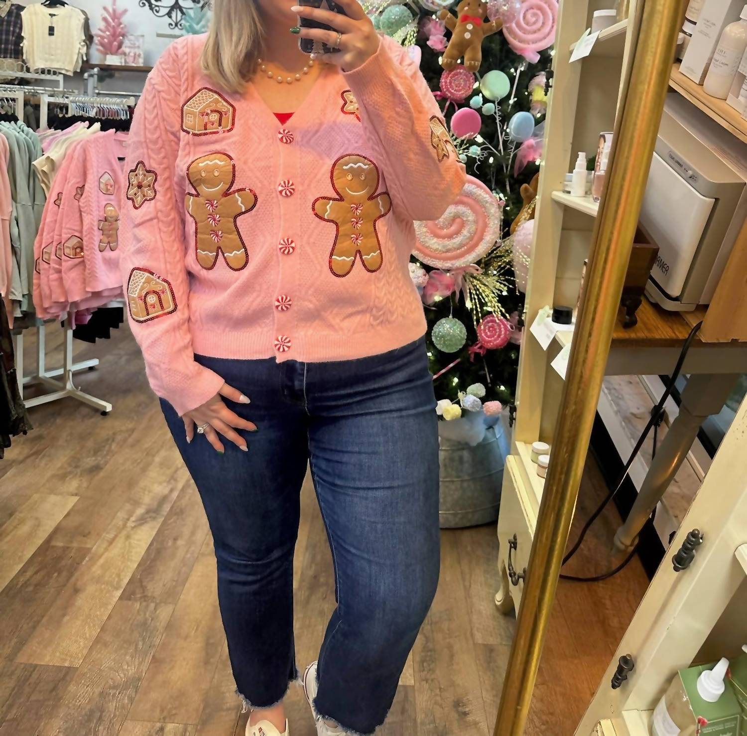 A classic fit that works just as good buttoned as it does left open. Introducing the Grace + Emma Cable Knit Gingerbread Cardigan Top, a charming addition to your fall wardrobe crafted for women who appreciate festive style. This delightful pink cardigan features long sleeves, showcasing a whimsical gingerbread-inspired graphic design, complemented by adorable peppermint button closures for a playful touch. Perfect for holiday parties or a cozy everyday look, its soft, textured knit offers the warmth you crave. Care instructions and country of origin are not specified.