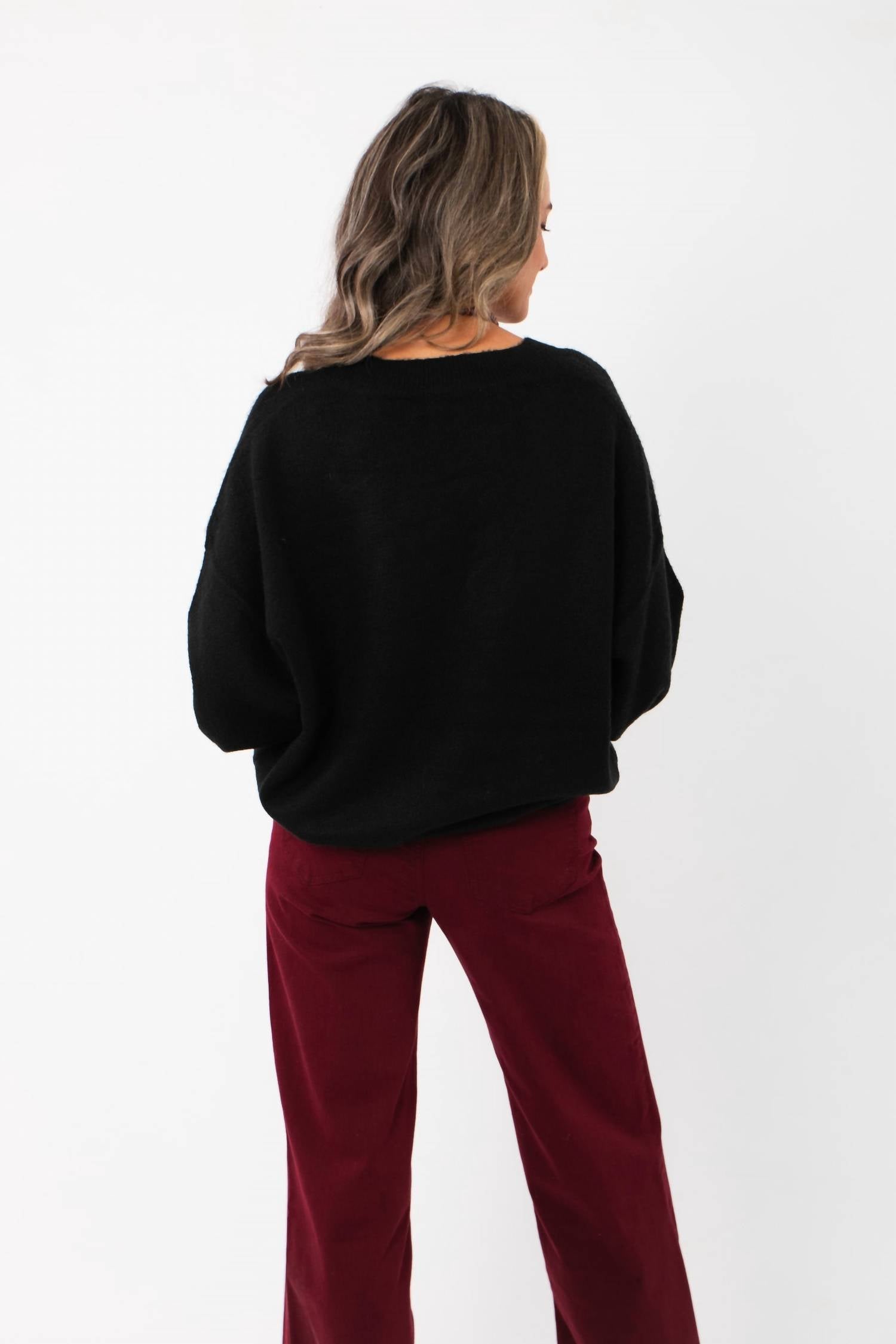 Wear this v-neck sweater with your favorite denim for the perfect fall look. Meet the Olivia Oversized Black V-Neck Sweater by HYFVE, an easy-loving essential perfect for effortless styling. This women's sweater features a long sleeve design with a relaxed drop shoulder and a flattering V-neckline. Closure: Pull-on. Care: Hand wash, lay flat to dry. Dress it up or down with ease, thanks to its soft, breathable midweight knit in a versatile solid black hue.