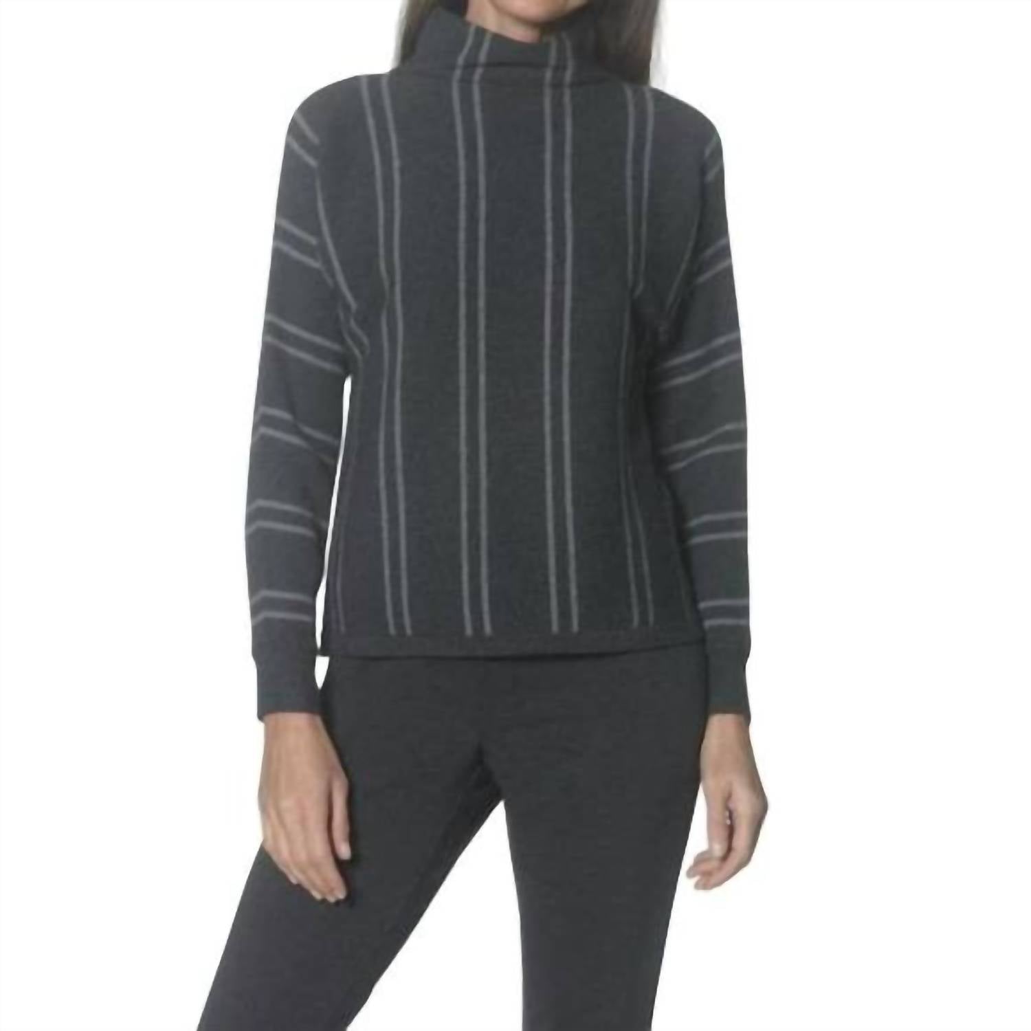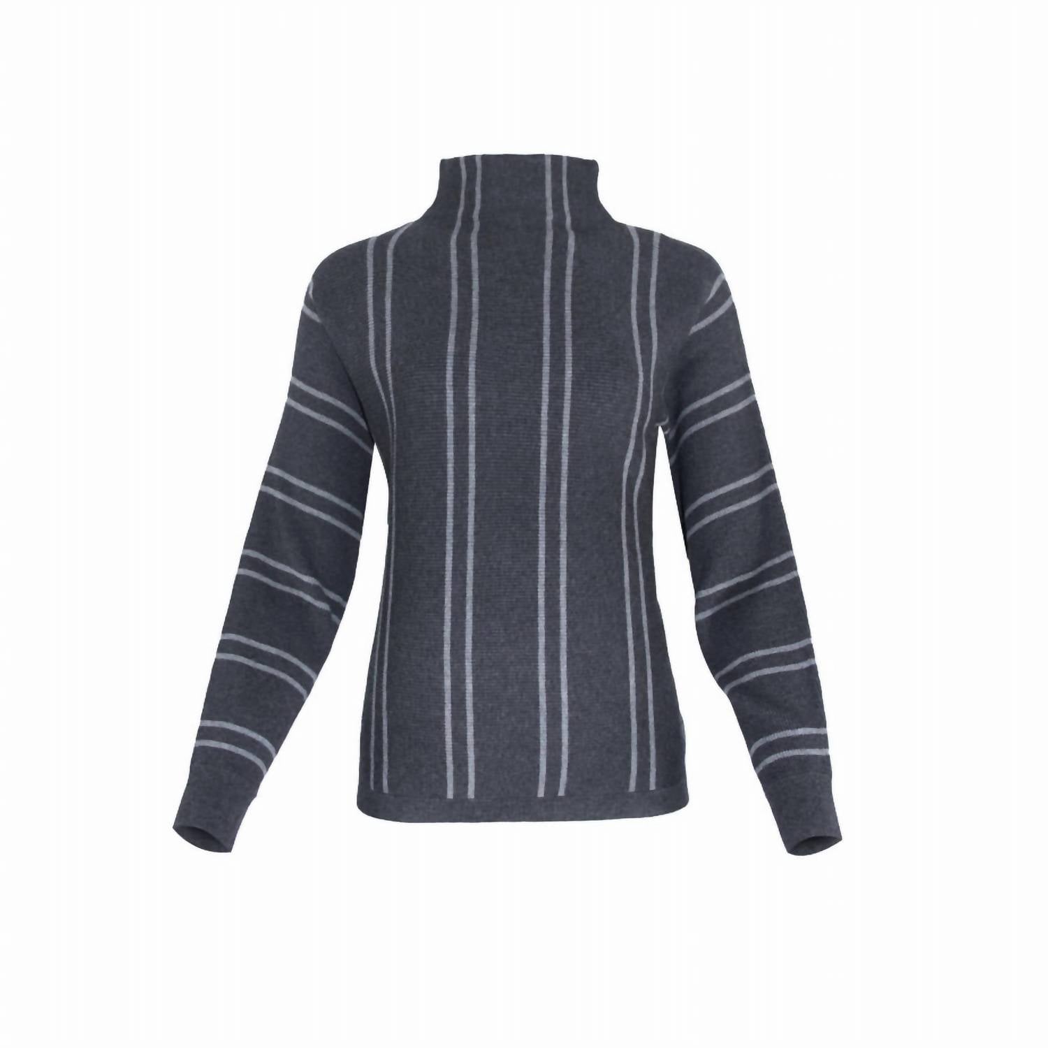 A classic staple that every closet needs. Introducing the Oslo Funnelneck Sweater by J'Envie/Eli, crafted in a luxurious charcoal grey viscose blend that ensures warmth and style. This sweater features long sleeves and a sophisticated mock neck, providing full coverage and a relaxed silhouette. Highlighted by its vertical stripe pattern, this piece adds understated polish to any fall wardrobe. Made in China, it offers effortless wear with its pull-on closure and is best cared for with a hand wash and line dry.