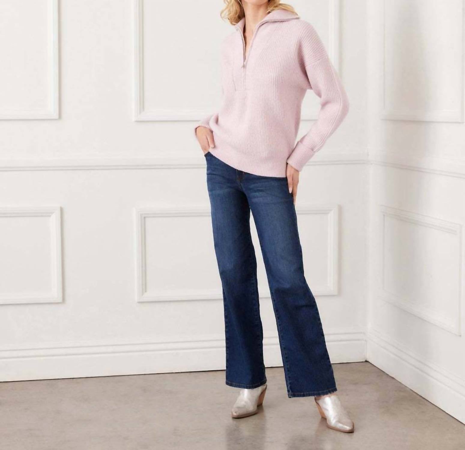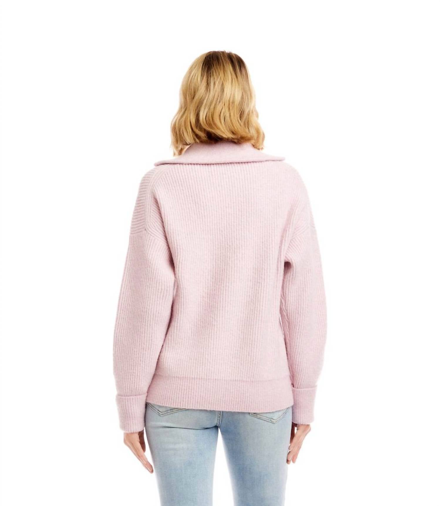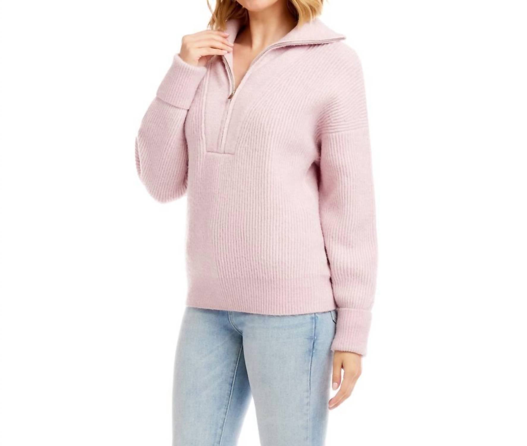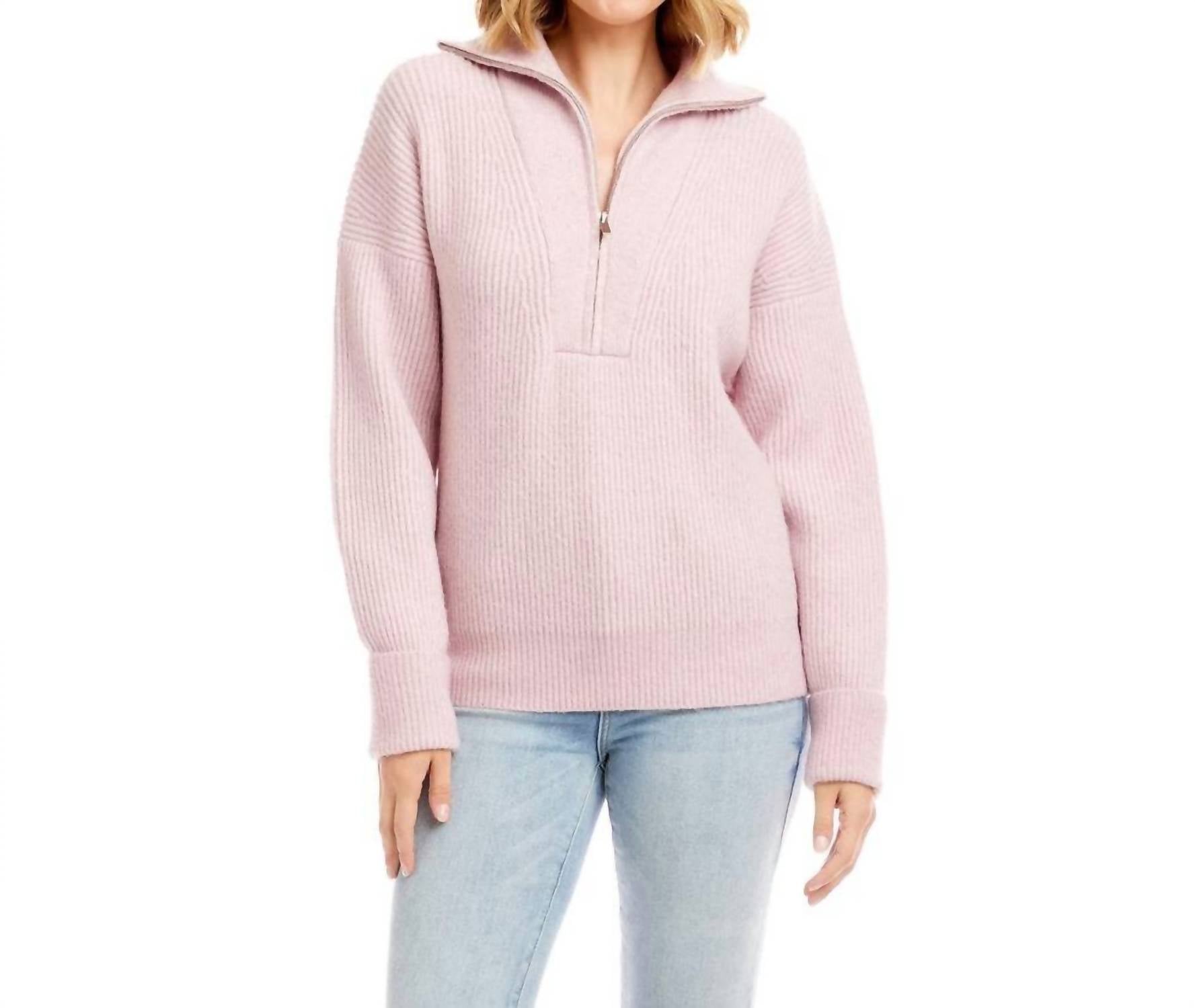 Layer under your favorite sweater or wear tucked into jeans for a perfectly polished winter look. Effortlessly cozy yet refined, this half-zip sweater is designed with a ribbed texture and a relaxed drop-shoulder silhouette. The elongated sleeves add a modern, slightly oversized feel, while the fold-over collar frames the neckline with an understated touch of structure. Crafted with minimal wool content, it offers the perfect balance of warmth and softness—ideal for layering or wearing on its own. Finished with a versatile half-zip detail, this piece is a timeless wardrobe essential. Relaxed, slightly boxy fit. Sweater: 35% Recycled Polyester 27% Acrylic 15% Nylon 10% Polyester 8% Wool 5% Spandex Imported Hand wash cold, lay flat to dry or dry clean. Length: 24 1/2 inches (Size M) Half zip closure Unlined Collared Drop shoulder sleeves Extended sleeves