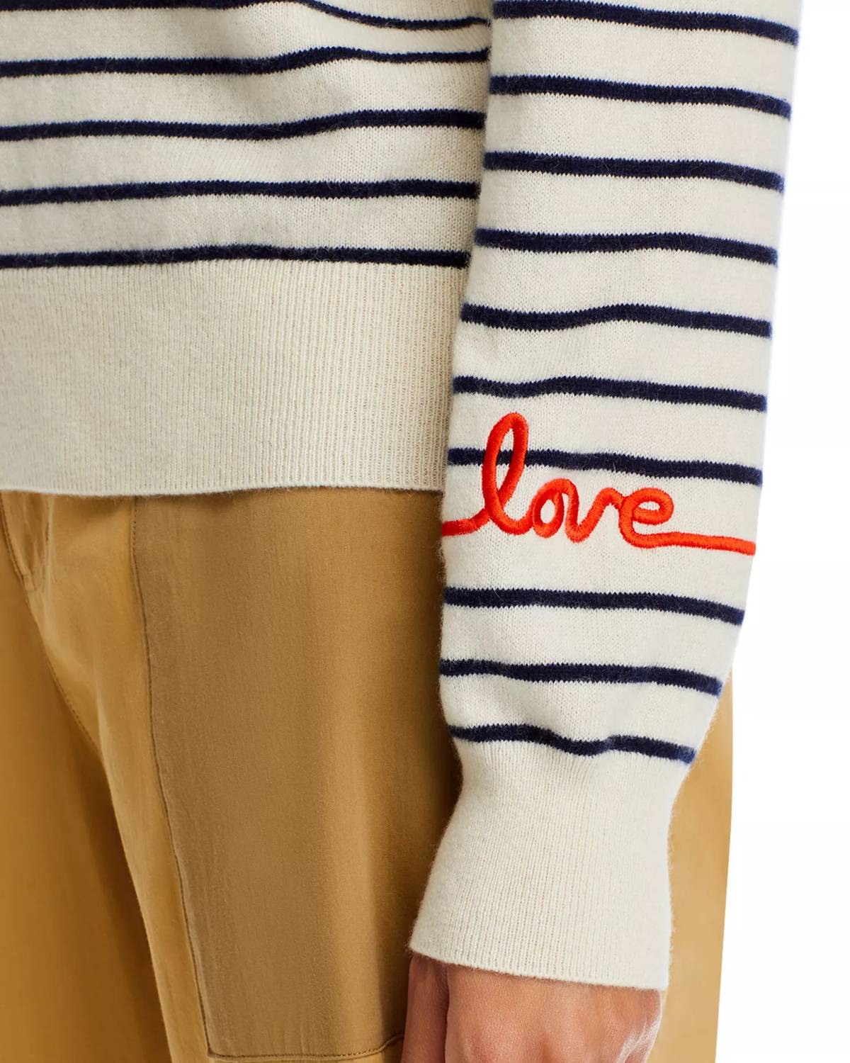 Stay warm and stylish in this versatile and effortlessly cool knitwear staple. Wear it alone or layered, it's the perfect sweater for the season and you'll wish you had it in every color. Indulge in luxurious comfort with the Betty Love Sweater by KULE, featuring long sleeves and a charming "Love" embroidery. Crafted from 100% cashmere, this cream and navy stripe sweater offers ribbed trim at the neck and cuff for a polished look. It's designed as a pull-on crewneck style, adding effortless elegance to your wardrobe. Made with precision, this imported piece requires dry cleaning for optimal care.