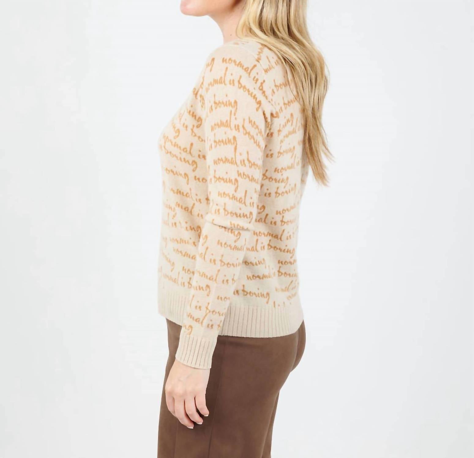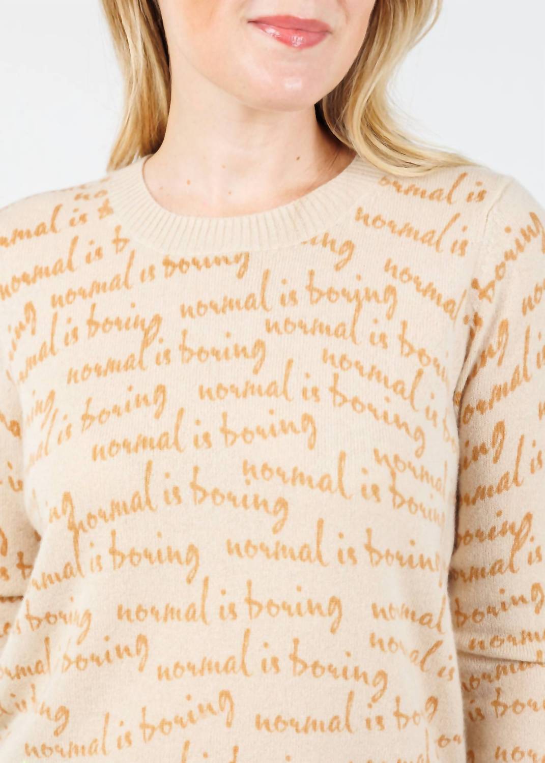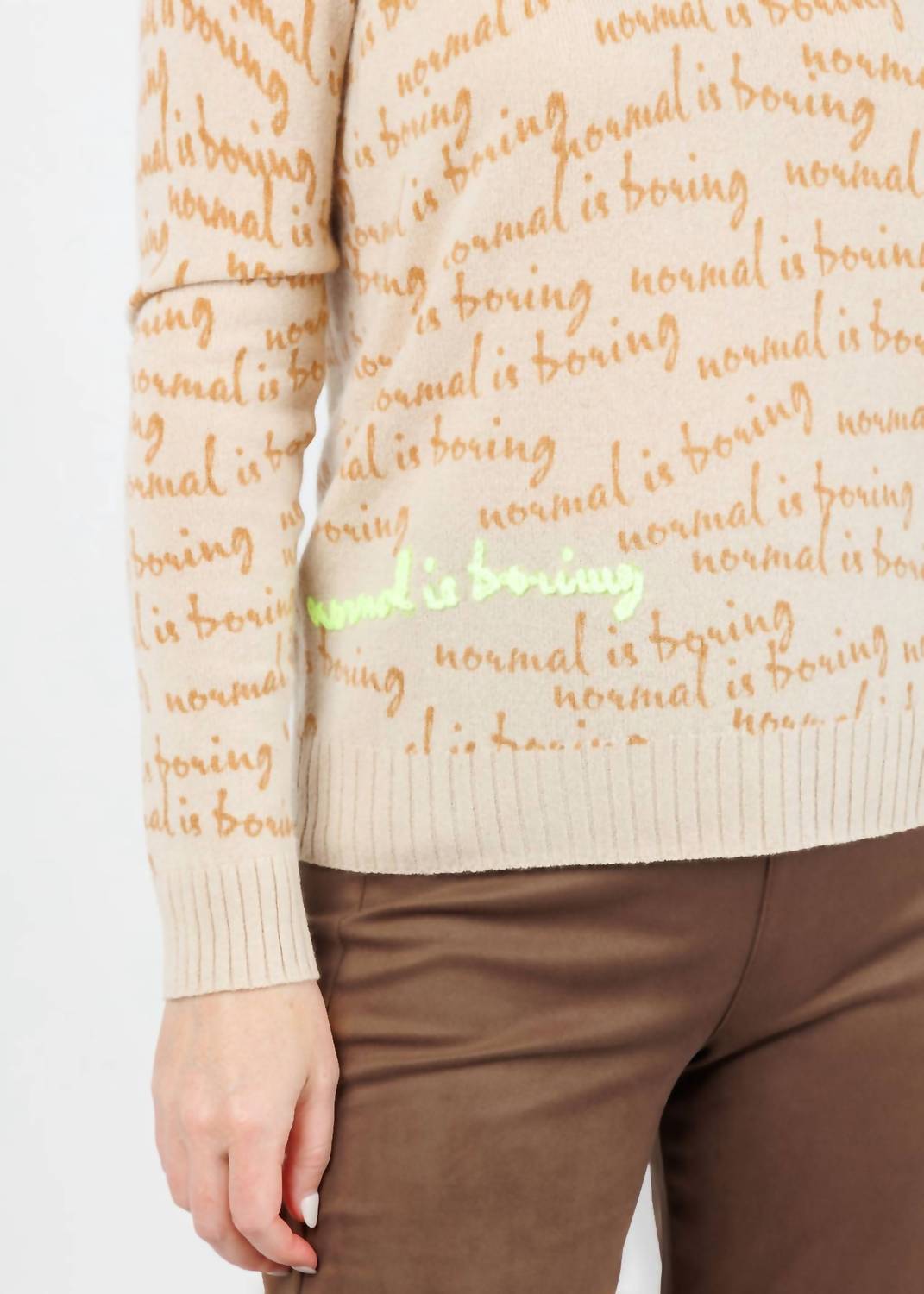 The ultimate go-to sweater, expertly crafted to provide the perfect combination of warmth and style. Its classic design and soft fabric make it a must-have addition to your wardrobe. Elevate your knitwear collection with the Lisa Todd Normal Is Boring Sweater in Latte. This luxurious piece features long sleeves and a playful all-over script motif with a pop of neon embroidery, providing a whimsical yet sophisticated touch. Made from 100% Cashmere, it boasts a cozy yet tailored fit, perfect for relaxed weekends or chic layered looks. With a classic crew neckline and ribbed trim, this pull-on sweater effortlessly combines comfort with style.