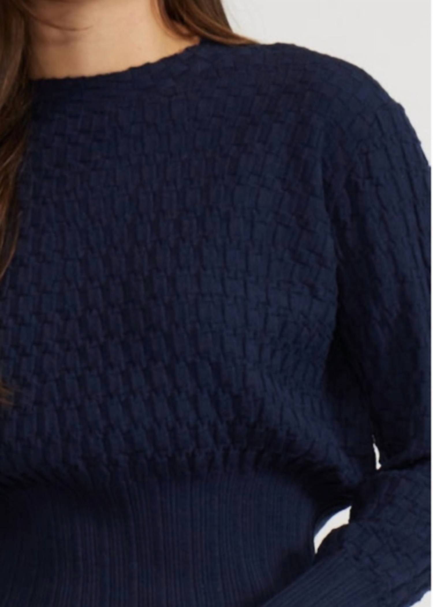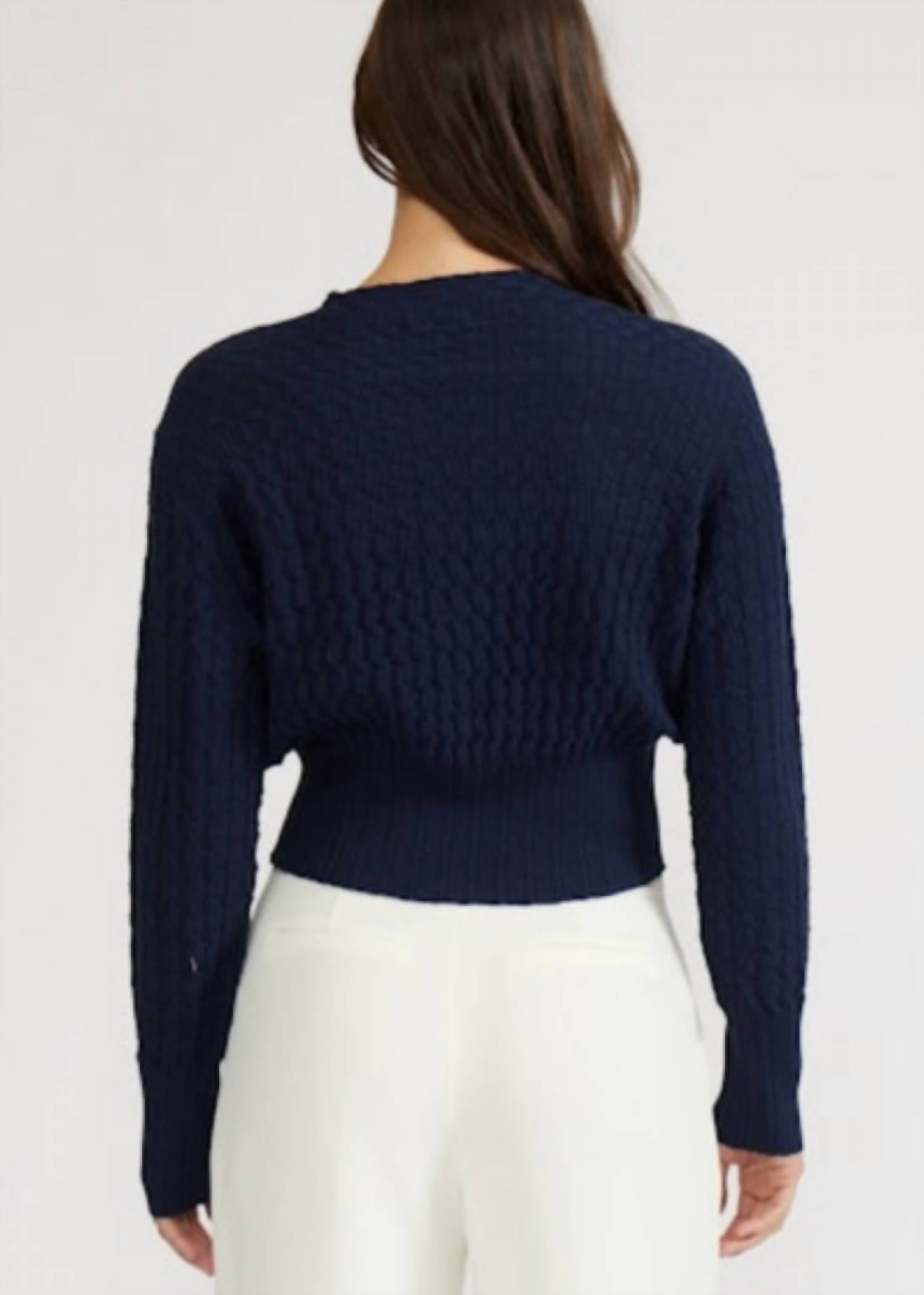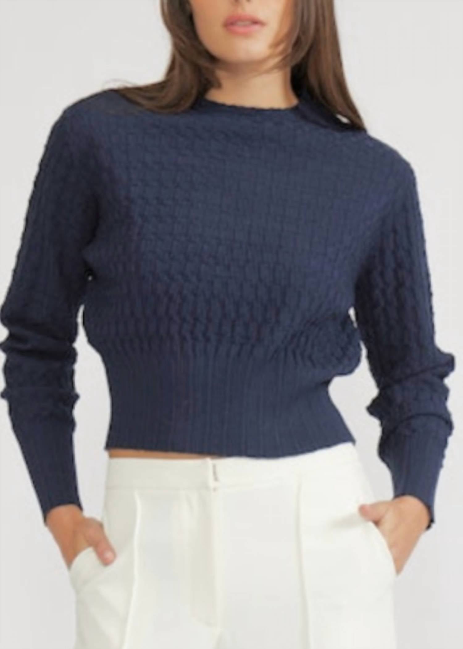 Stay warm and stylish in this versatile and effortlessly cool knitwear staple. Wear it alone or layered, it's the perfect sweater for the season and you'll wish you had it in every color. Elevate your spring wardrobe with the Barton Knit Sweater by LUCY PARIS, a preppy and polished addition in classic navy. This sweater features long textured sleeves in a stylish waffle or cable-knit pattern, and its cropped length with a fitted waistband accentuates your silhouette. Made from a luxurious blend of 51% Acrylic, 32% Nylon, and 17% Wool, it ensures comfort and style. With a mock neck design, this pull-on sweater is perfect for Thanksgiving or vacation occasions. Care: Hand wash cold, line dry.
