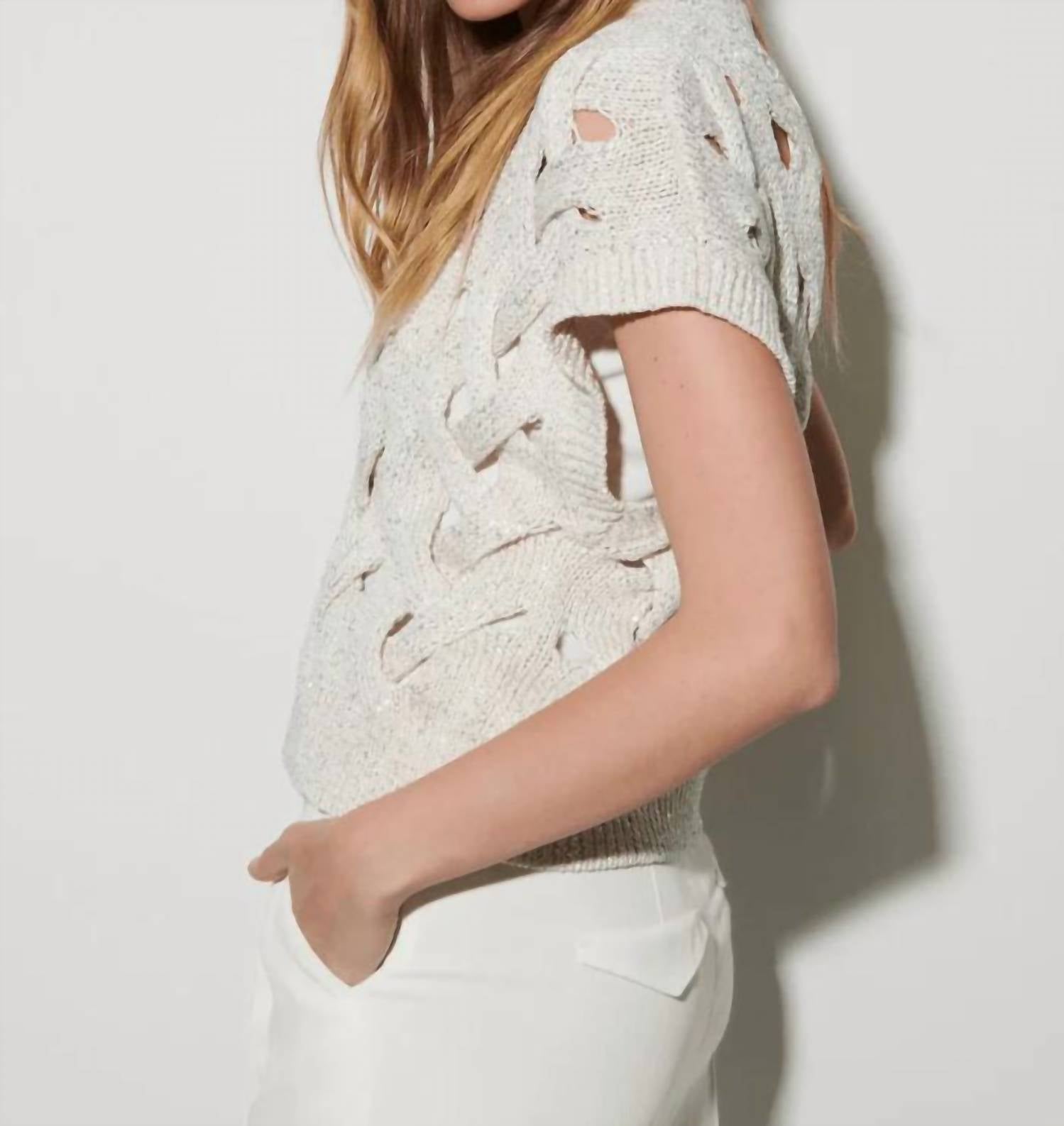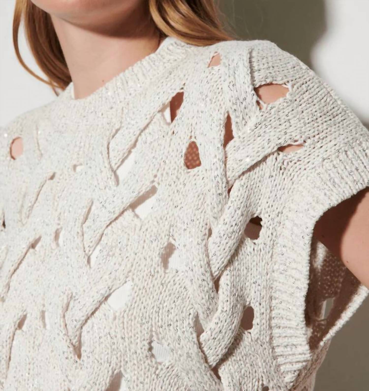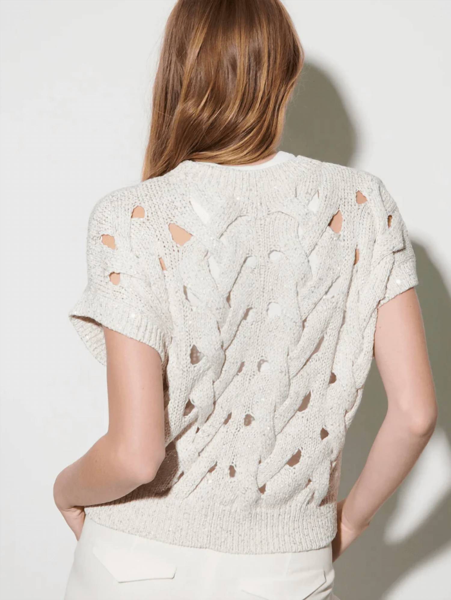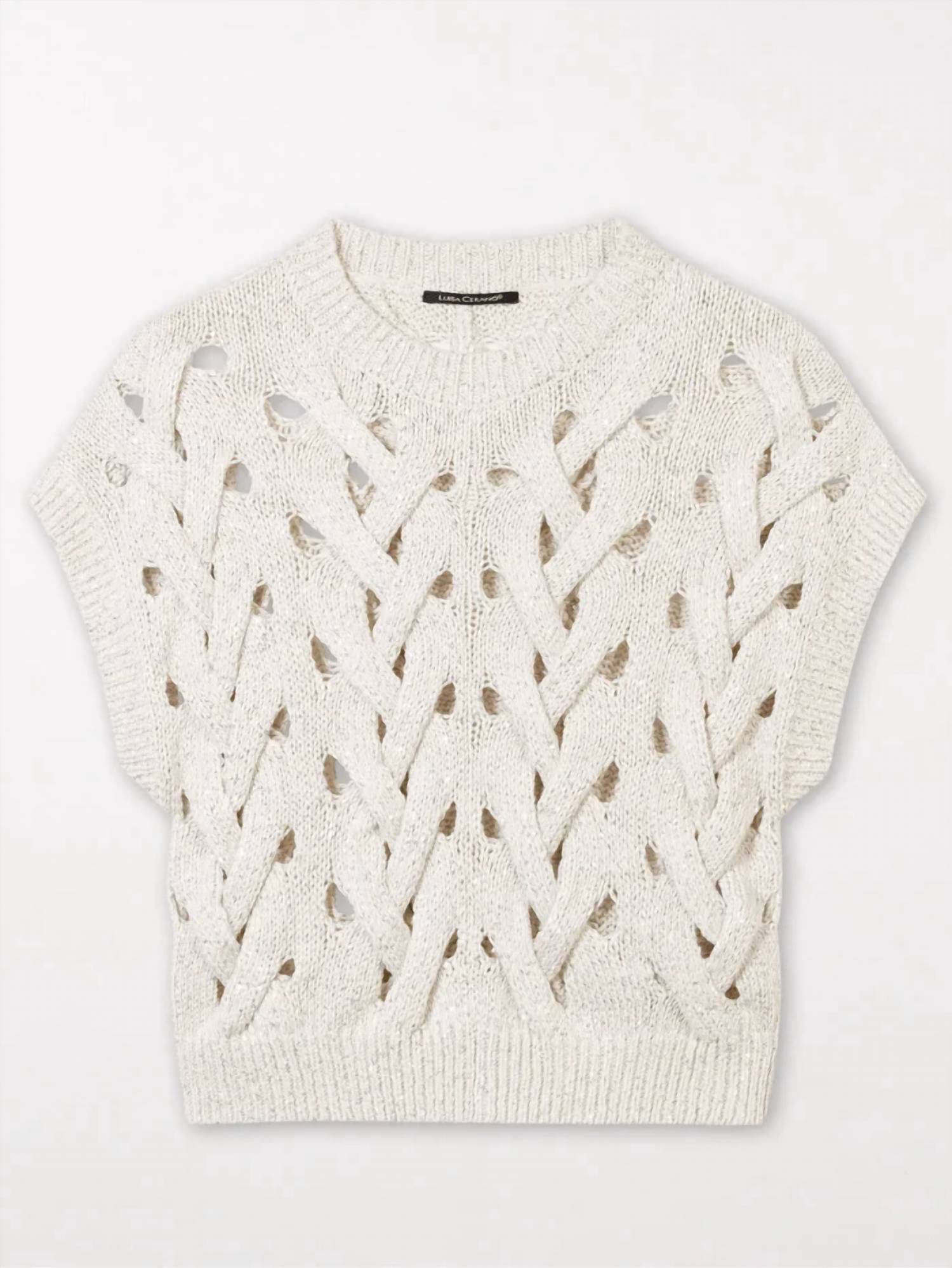 Stay warm and stylish in this versatile and effortlessly cool knitwear staple. Wear it alone or layered, it's the perfect sweater for the season and you'll wish you had it in every color. Discover the Cable Knit Tank Sweater by LUISA CERANO, a stylish addition to your wardrobe in a cream hue. Crafted with short sleeves and a luxurious linen blend of 35% Linen, 25% Polyester, 25% Cotton, and 20% Polyamide. This pull-on sweater features a textured cable-knit pattern with decorative holes for a modern, shorter fit. Ideal for fall, this crewneck sweater offers a chic, effortless look.