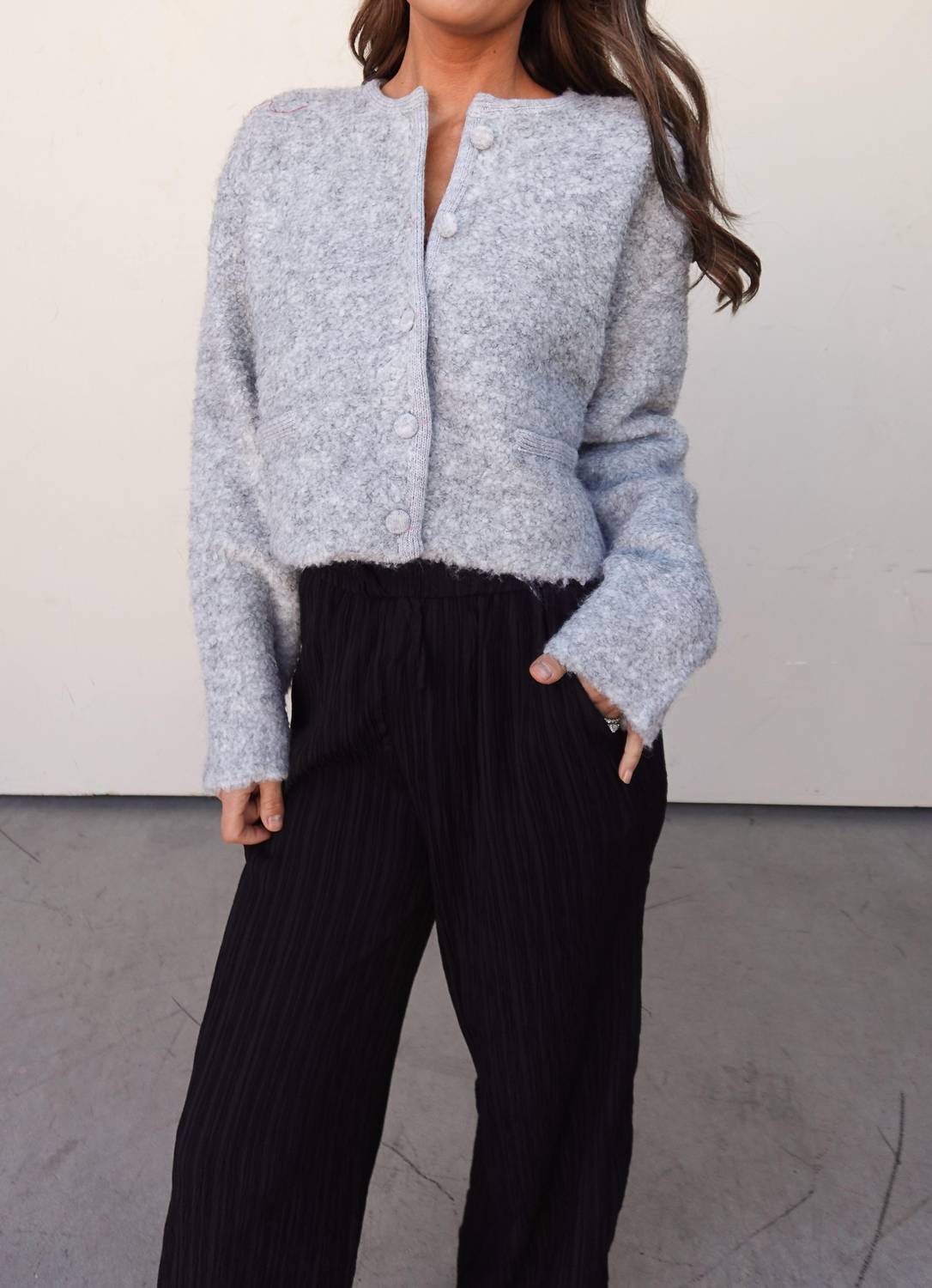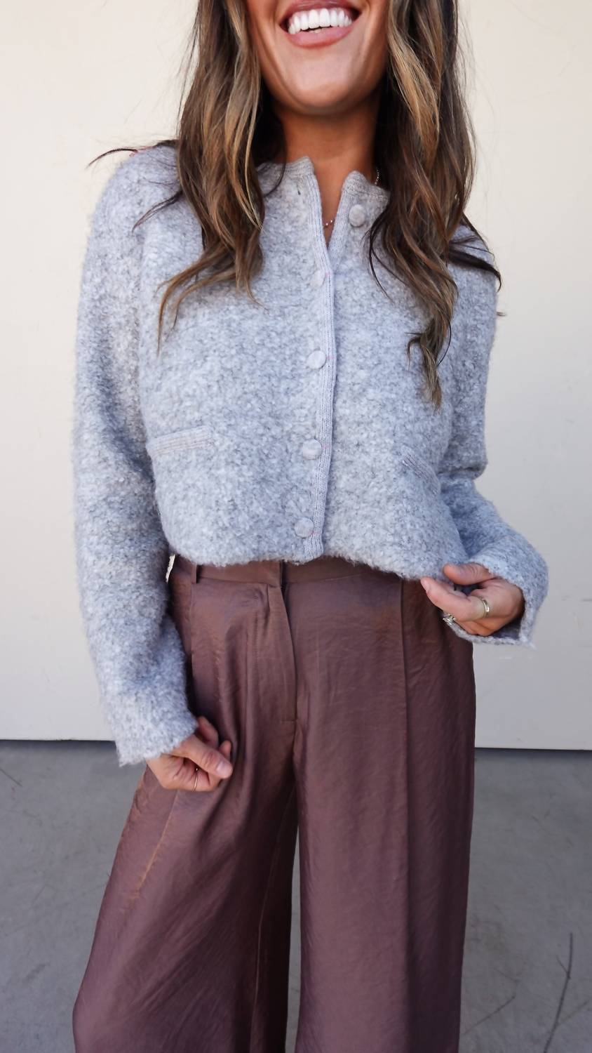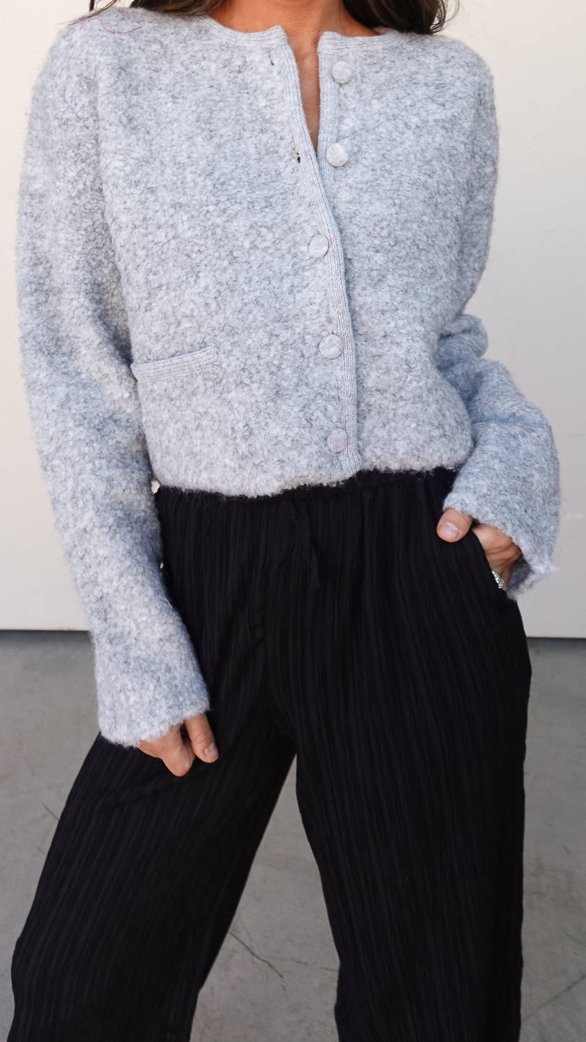 A classic fit that works just as good buttoned as it does left open. Meet the Textured Knit Cardigan Jacket by MABLE, a stylish and functional addition to your fall wardrobe. This long sleeve piece, crafted from 65% Acrylic and 30% Nylon, offers a sophisticated textured pattern in versatile gray. Designed with a cropped silhouette and a scoop neckline, it features a boxy fit ideal for layering. Closure: Button closure. Care: Hand wash and lay flat to dry. Perfect for transitional weather, it's a polished alternative to a classic cardigan or blazer. Elizabeth is 5’7” and wears a Medium, while Lauren is 5’2” and wears a Small.