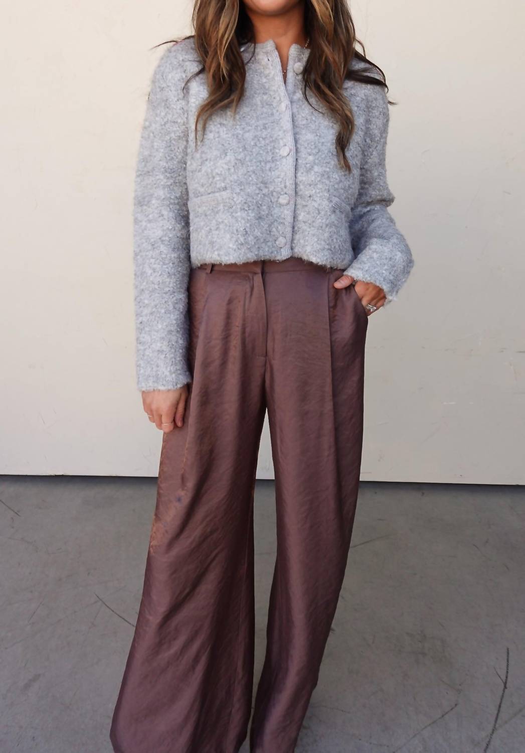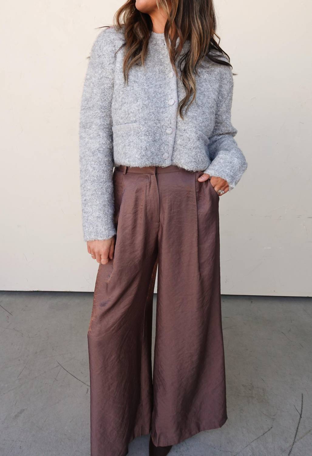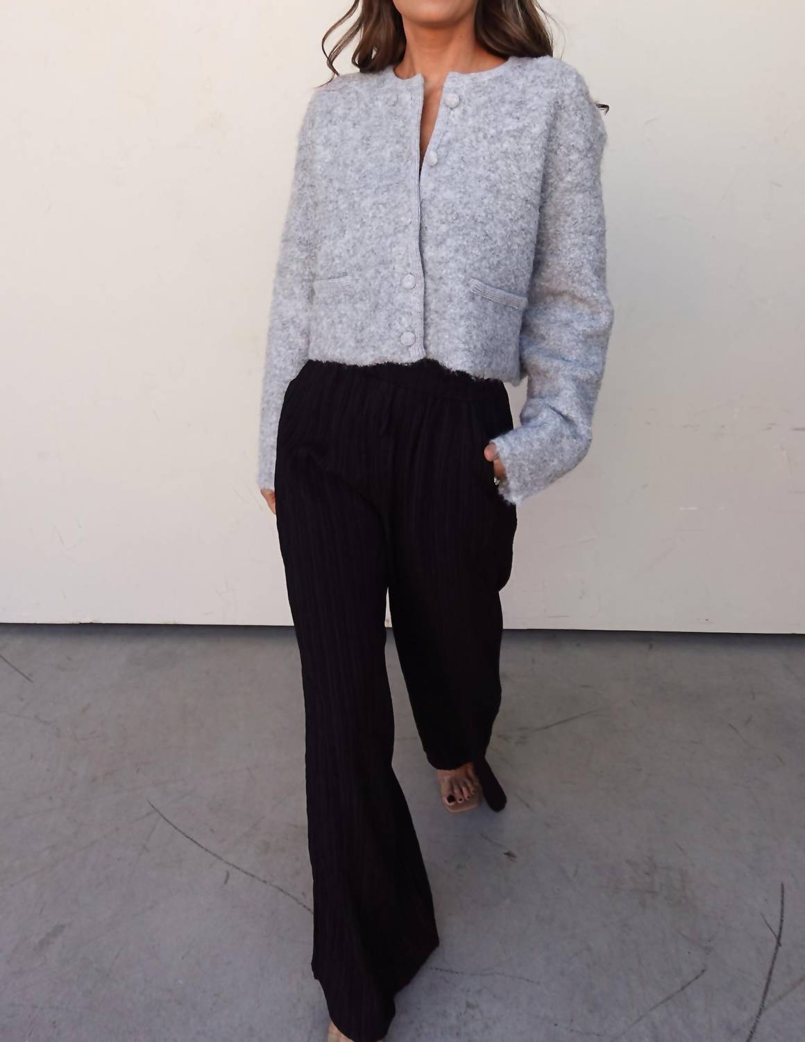 A classic fit that works just as good buttoned as it does left open. Meet the Textured Knit Cardigan Jacket by MABLE, a stylish and functional addition to your fall wardrobe. This long sleeve piece, crafted from 65% Acrylic and 30% Nylon, offers a sophisticated textured pattern in versatile gray. Designed with a cropped silhouette and a scoop neckline, it features a boxy fit ideal for layering. Closure: Button closure. Care: Hand wash and lay flat to dry. Perfect for transitional weather, it's a polished alternative to a classic cardigan or blazer. Elizabeth is 5’7” and wears a Medium, while Lauren is 5’2” and wears a Small.