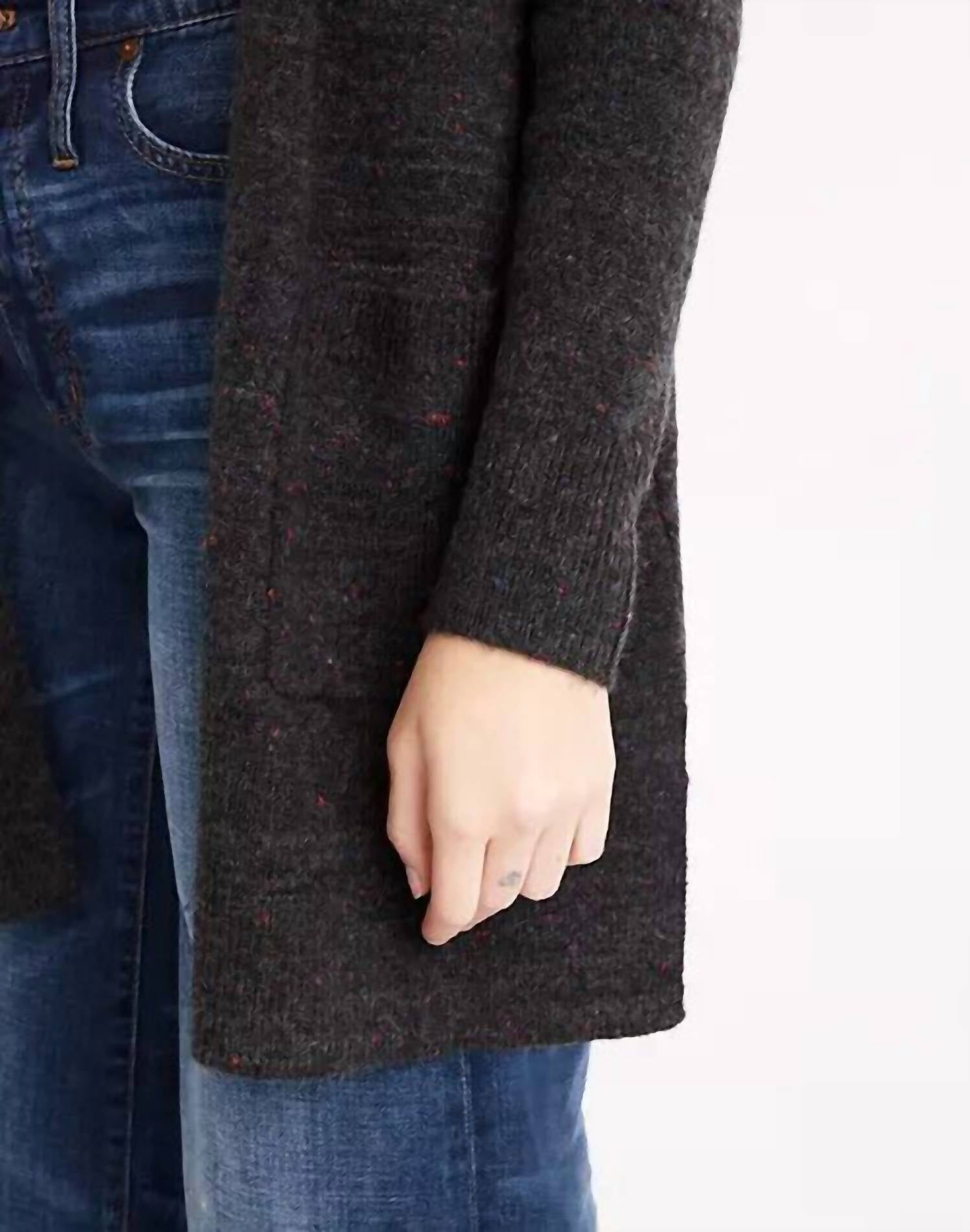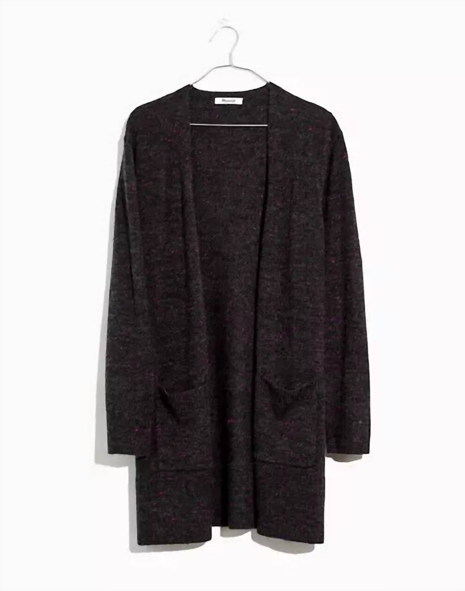 Throw this adorable cardigan over any cami or tank top. Discover the Madewell Donegal Open Front Cardigan in sophisticated gray, crafted from our signature Coziest Yarn for kitten-on-a-cloud softness. Featuring a slouchy fit with patch pockets and side slits, this regular fit cardigan is perfect for layering. Composition: 33% polyamide, 33% acrylic, 25% wool, 4% other fibers. Length: 33". Sleeve Length: 23". Shoulder Width: 15.5". Care Instructions: Hand wash.