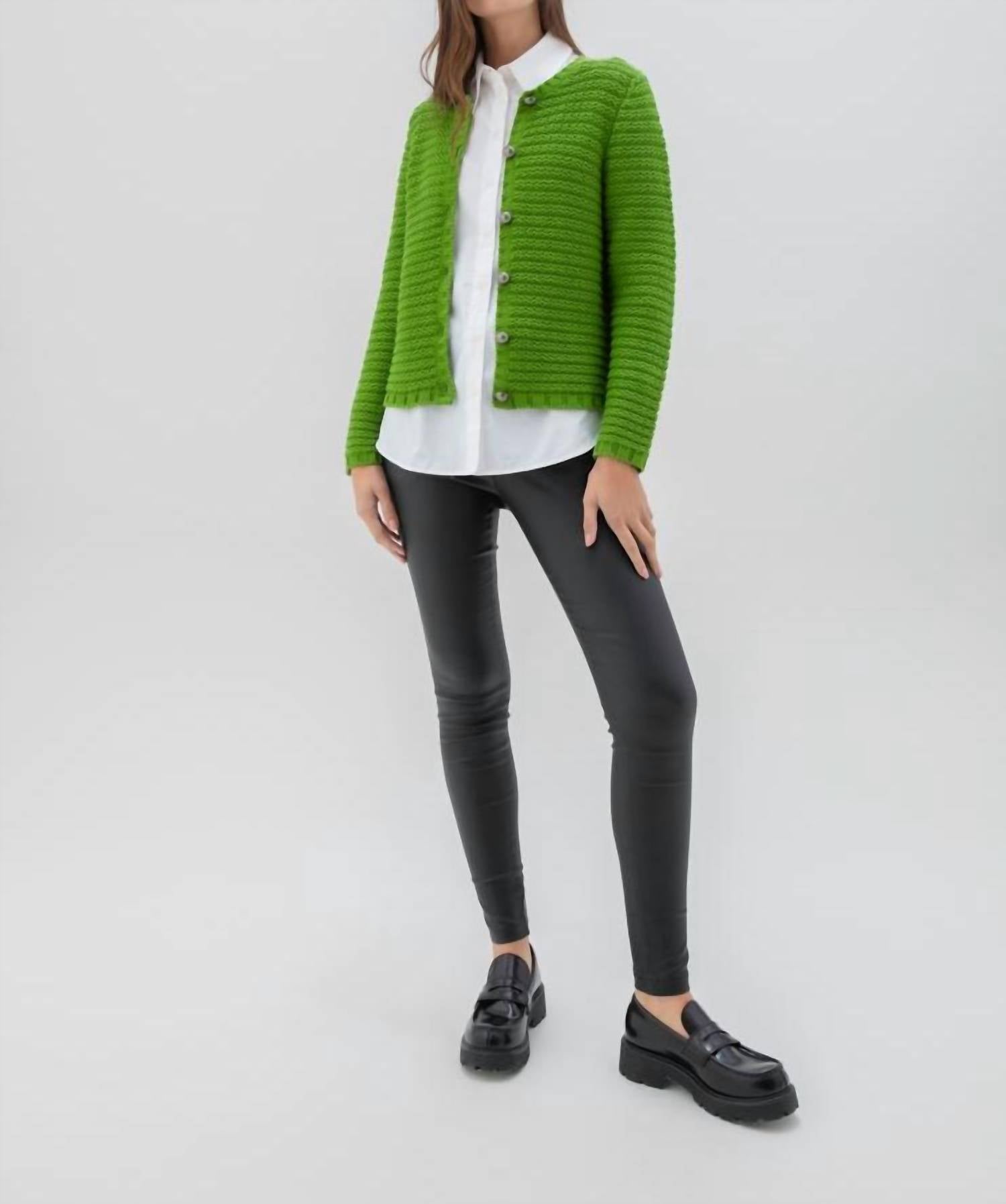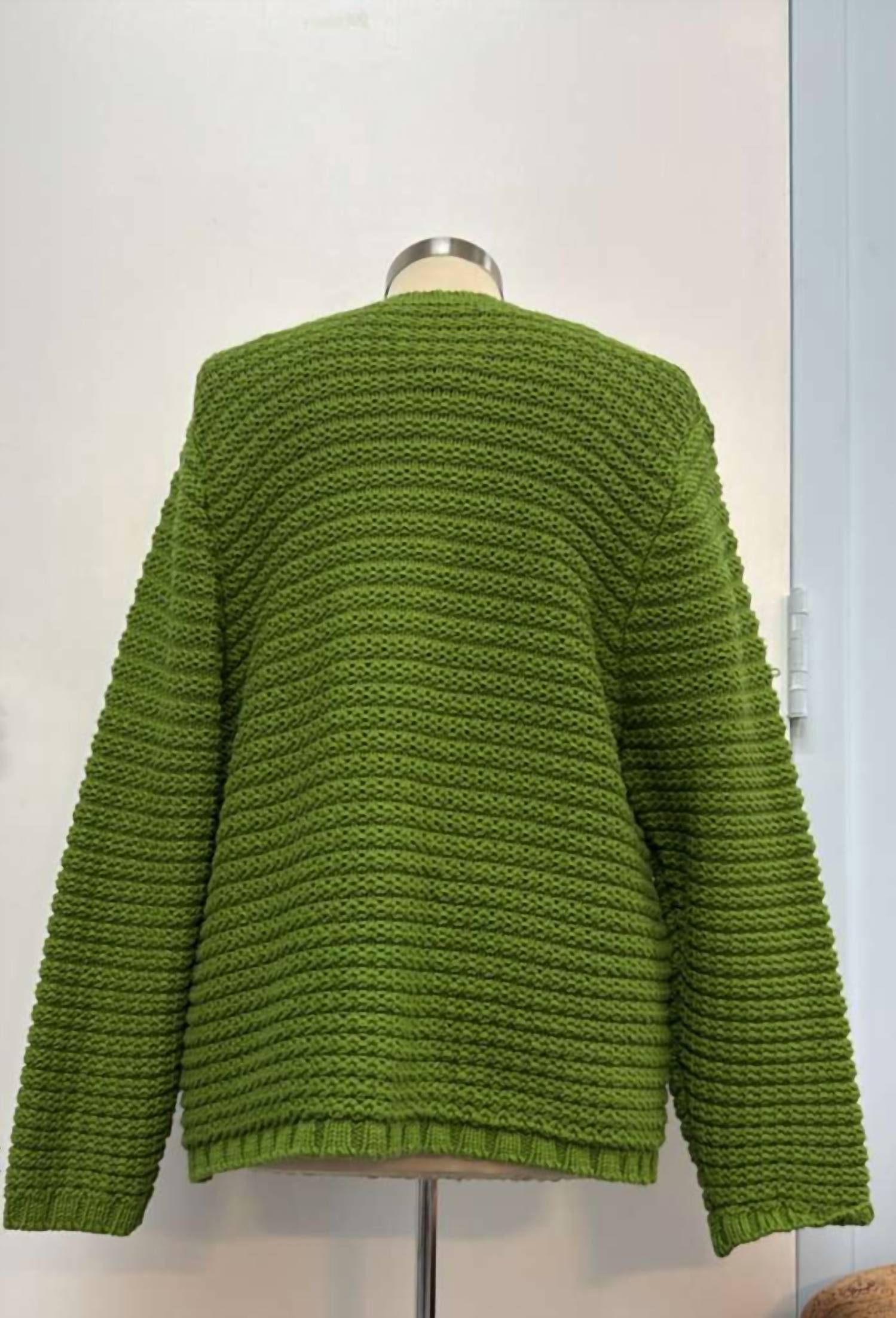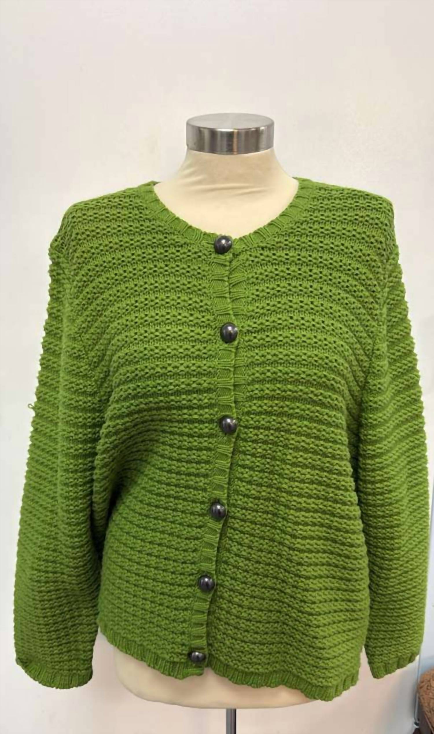 Throw this adorable cardigan over any cami or tank top. Introducing the Marble Textured Long Sleeves Cardigan 7652 by MARBLE, a stylish addition to any wardrobe in a vibrant green hue. Perfect for fall, this women's cardigan features a textured design with long sleeves and a classic crewneck for a preppy look. Made without pockets for a sleek silhouette, the cardigan closes with buttons for easy wear.