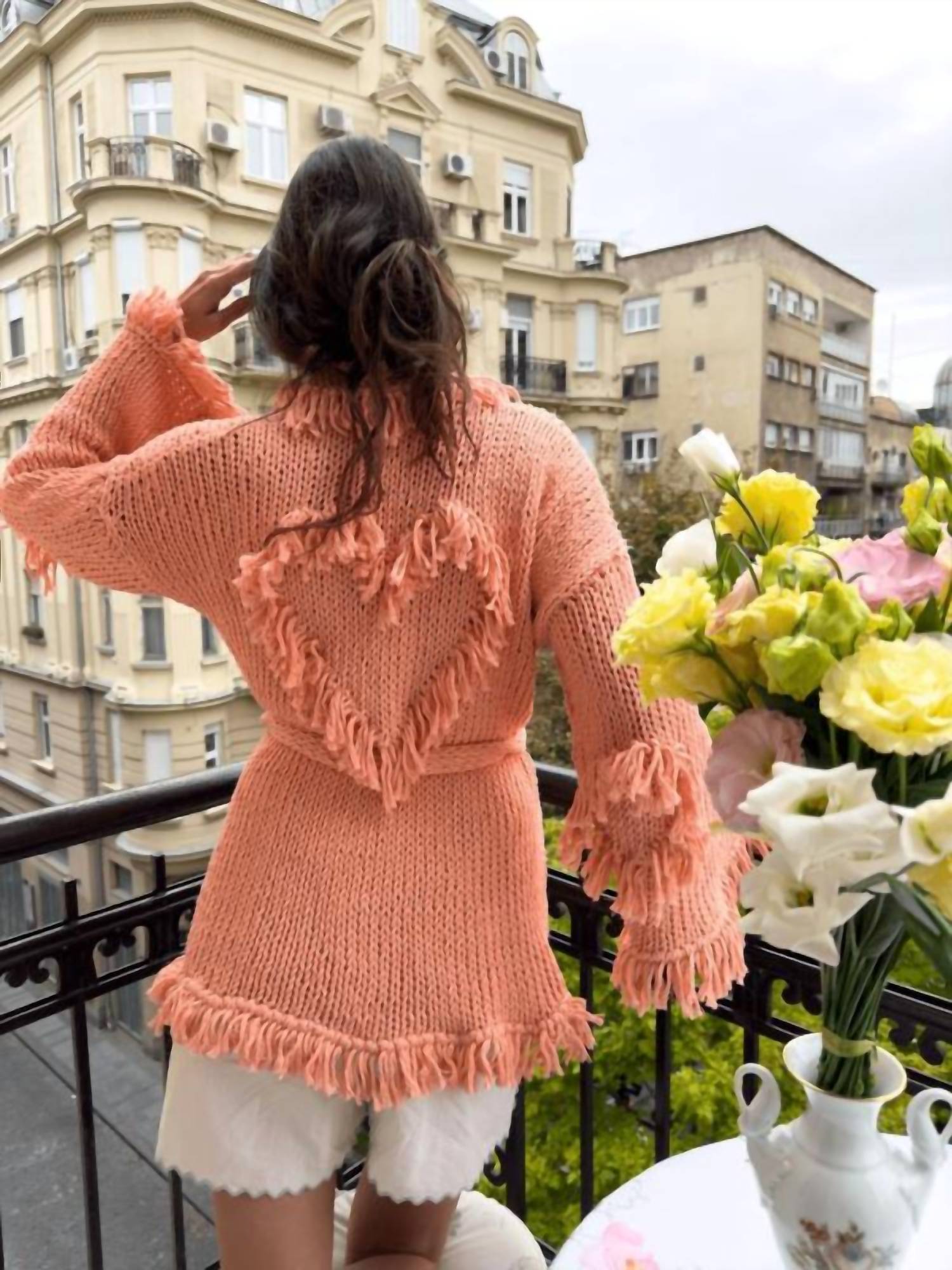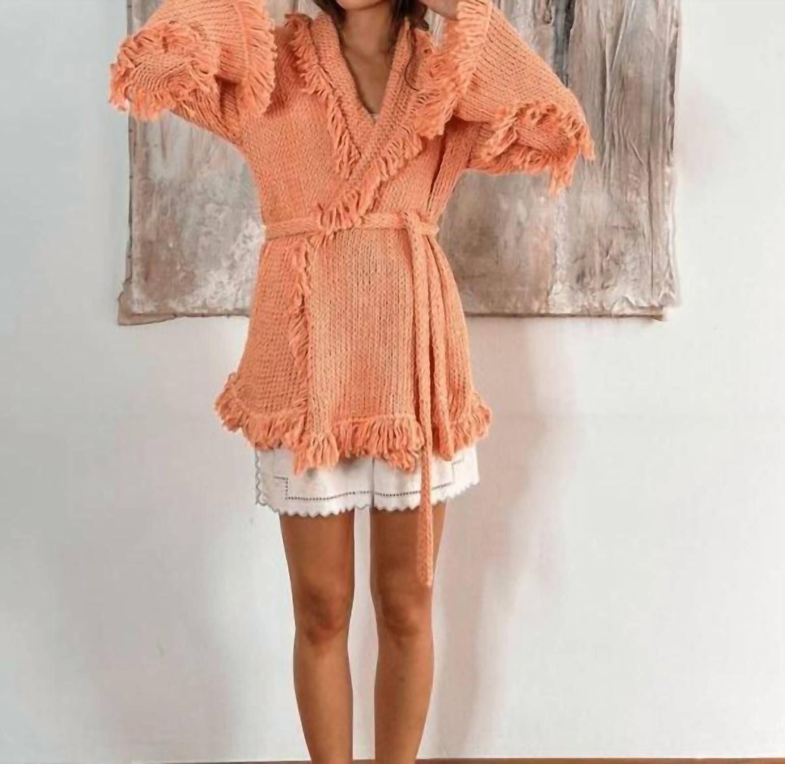 Throw this adorable cardigan over any cami or tank top. Introducing the Tenderness Cotton Blend Hand Knit Cardigan by Maridruna, a standout piece in a chic soft peach color. This long sleeve cardigan is crafted from 100% organic cotton, offering a lightweight yet cozy feel perfect for transitional weather. Featuring a textured, artisanal design with a collar neckline and a versatile one-size-fits-all style, it ties effortlessly with a secure tie closure. Care: Hand wash and lay flat to dry for lasting quality and style enhancement.
