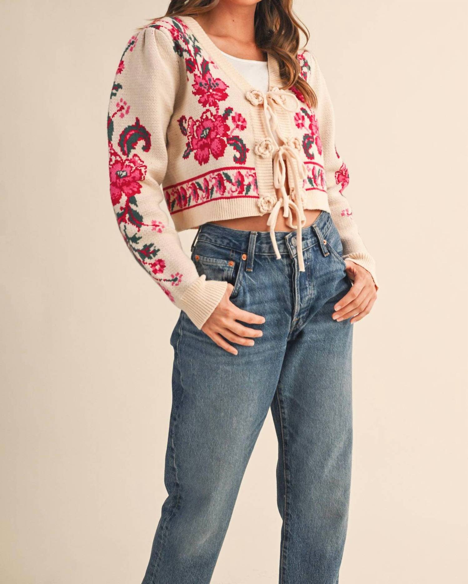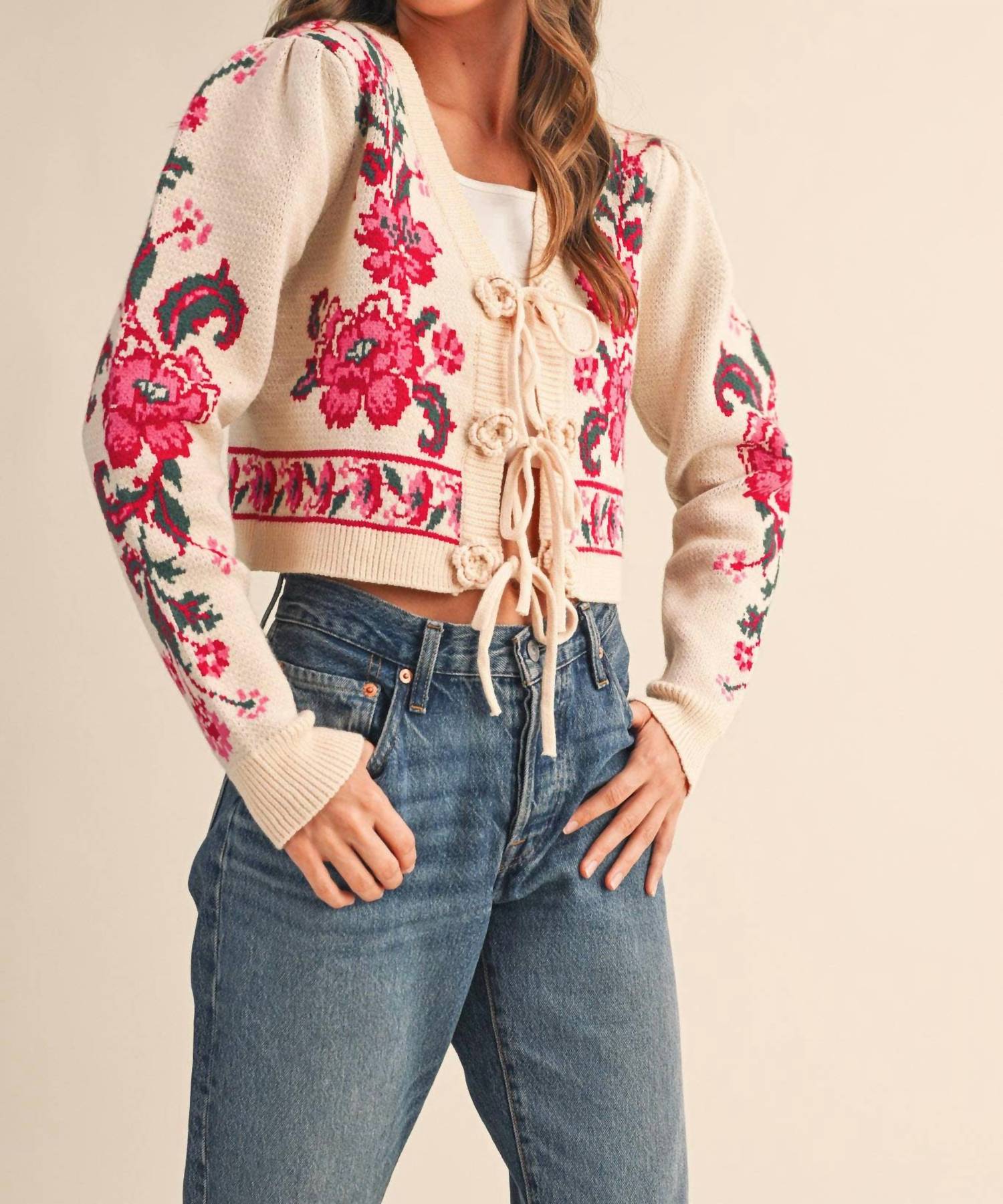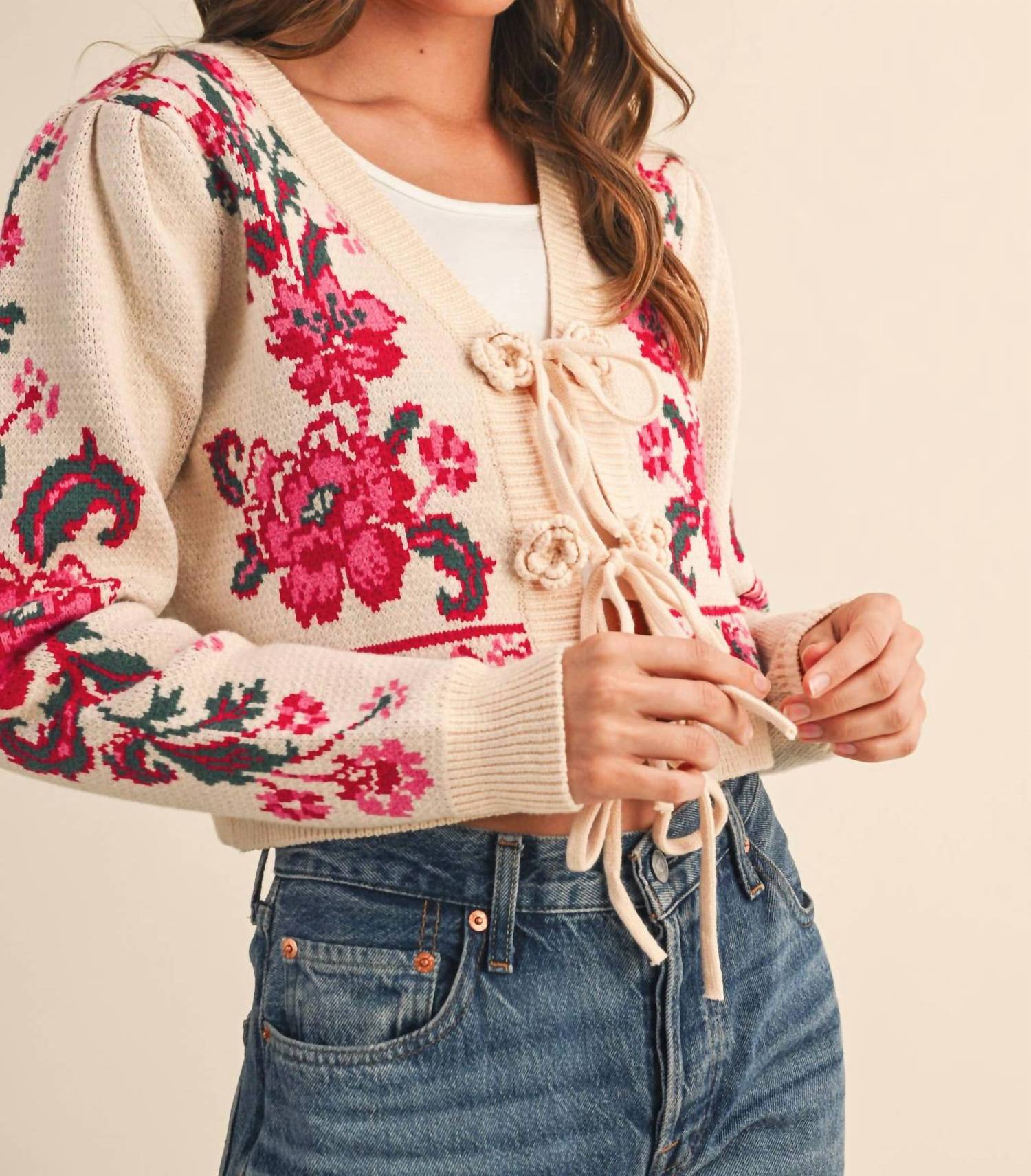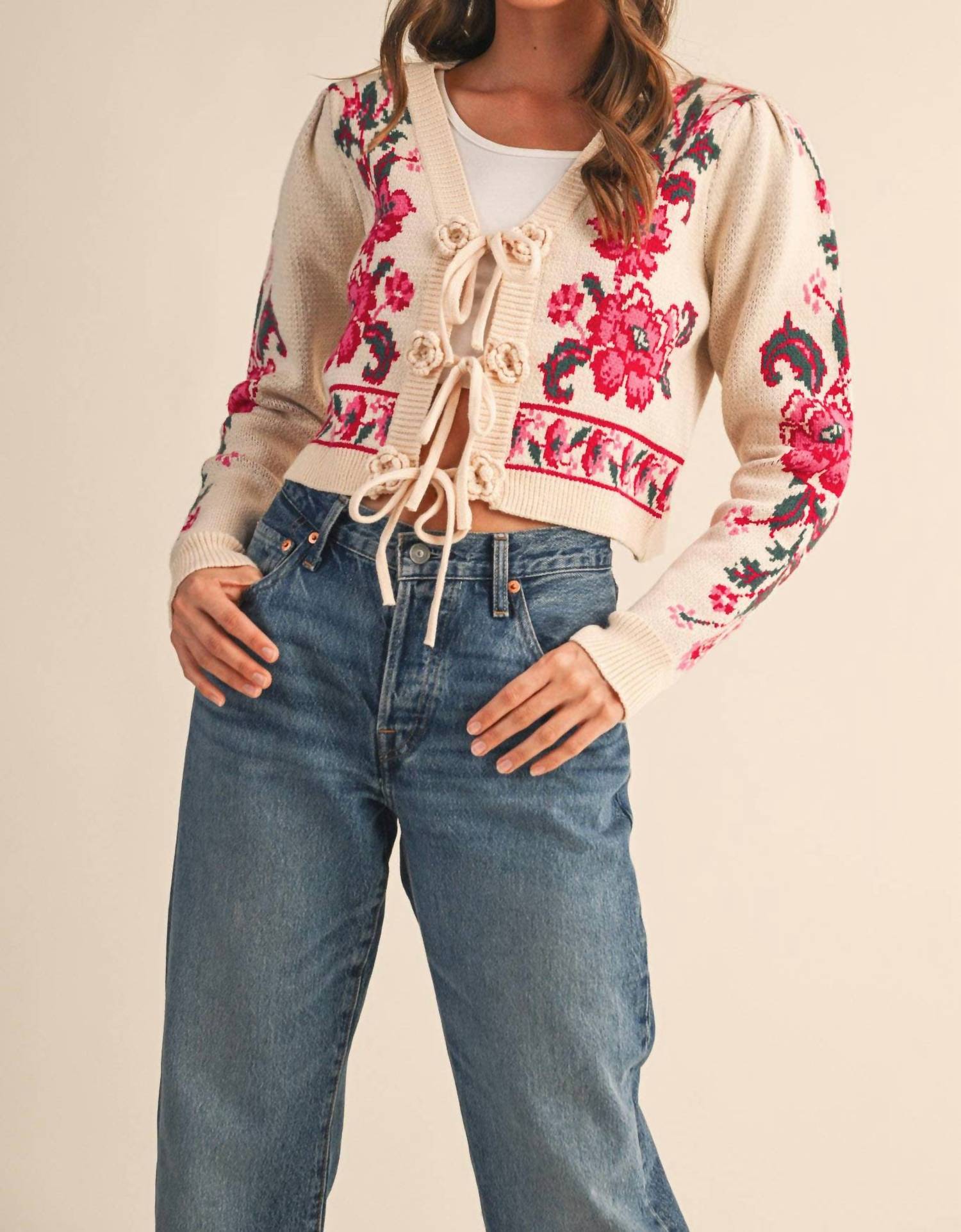 &Merci - Floral Knit Tie-front Cropped Sweater Cardigan