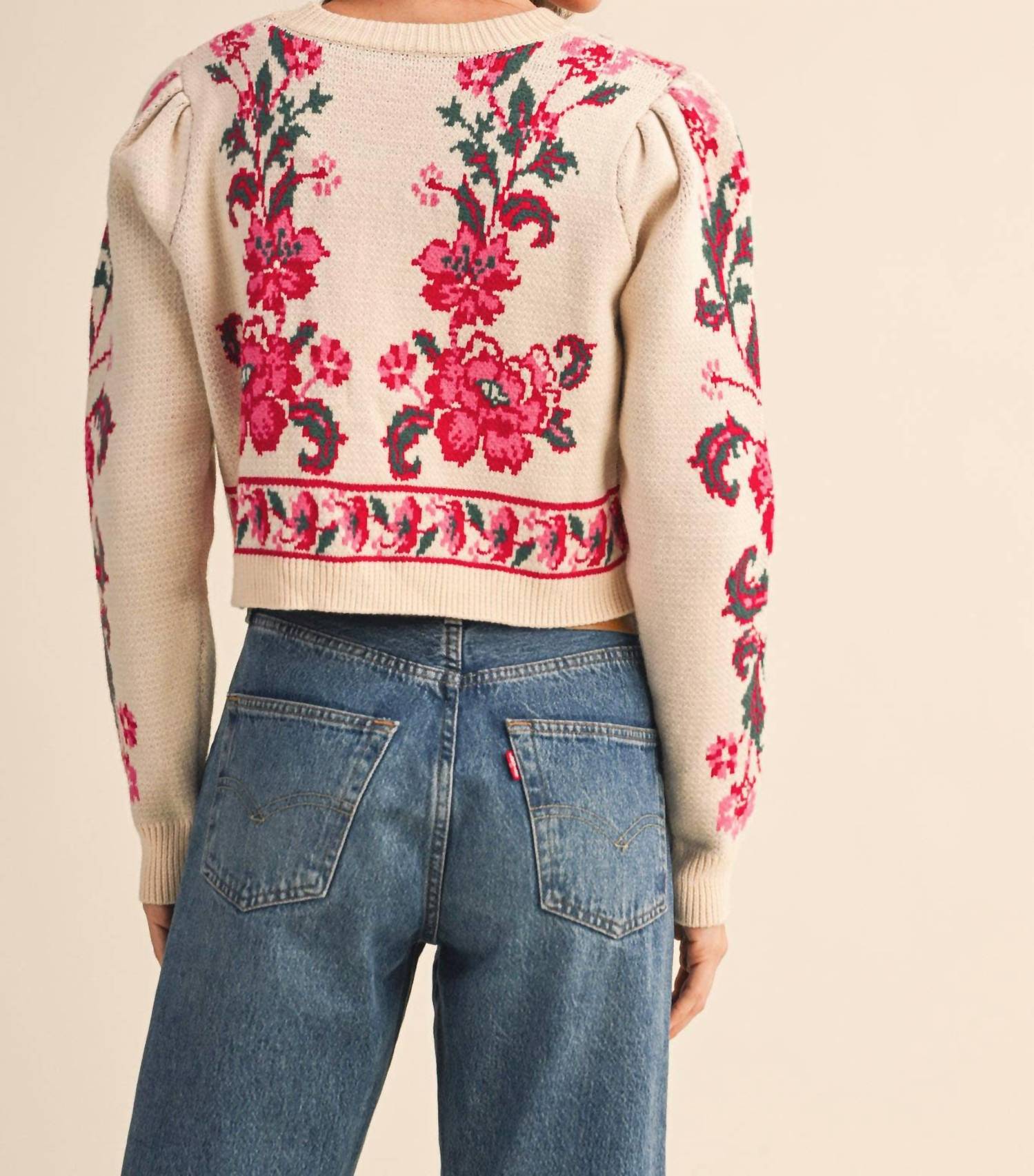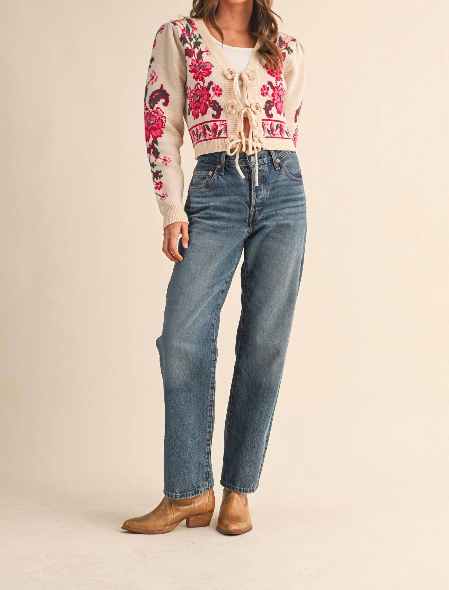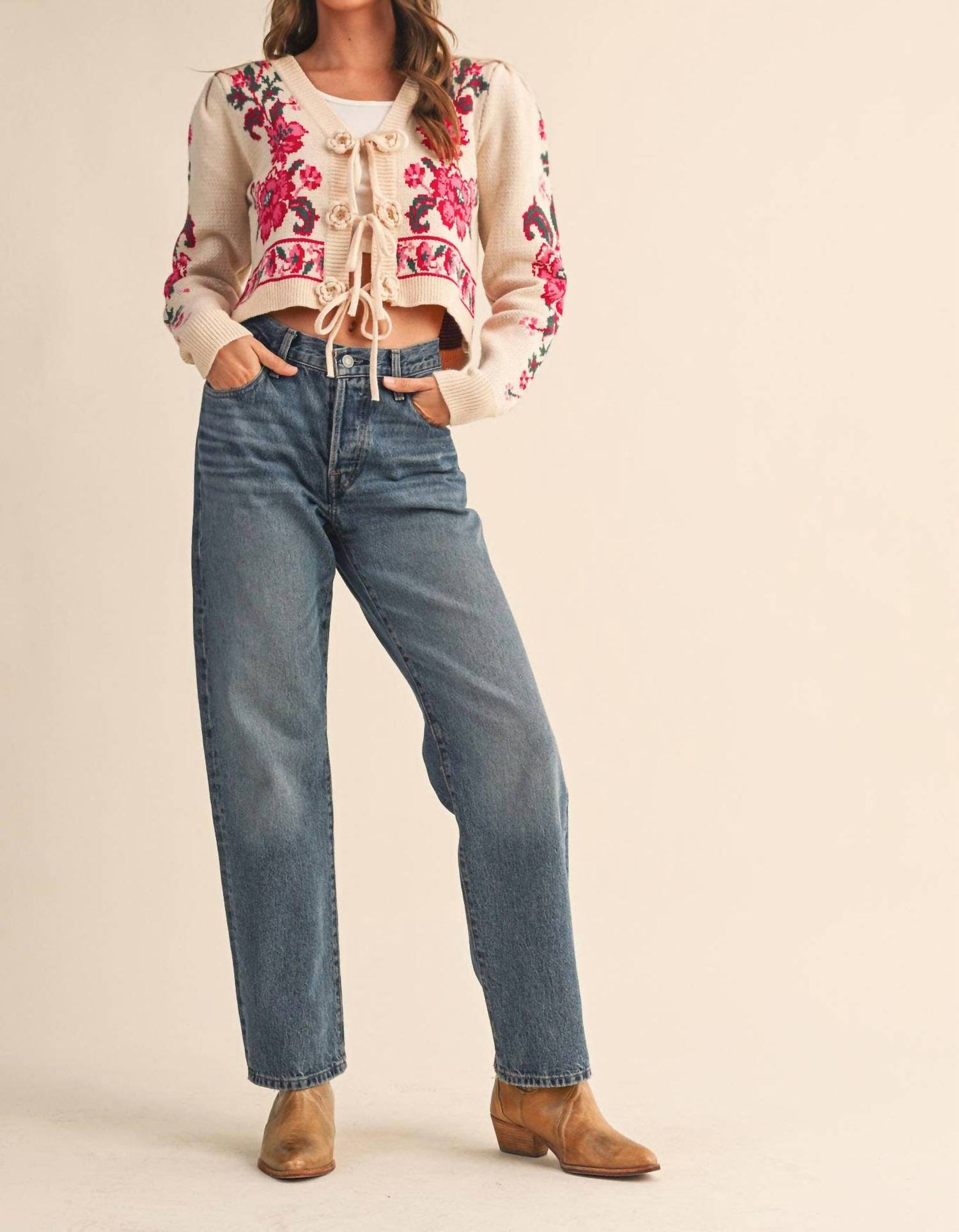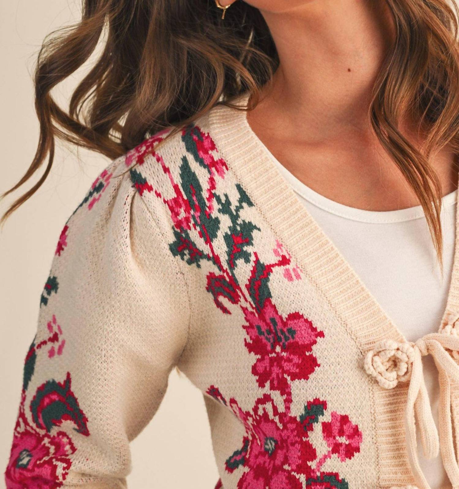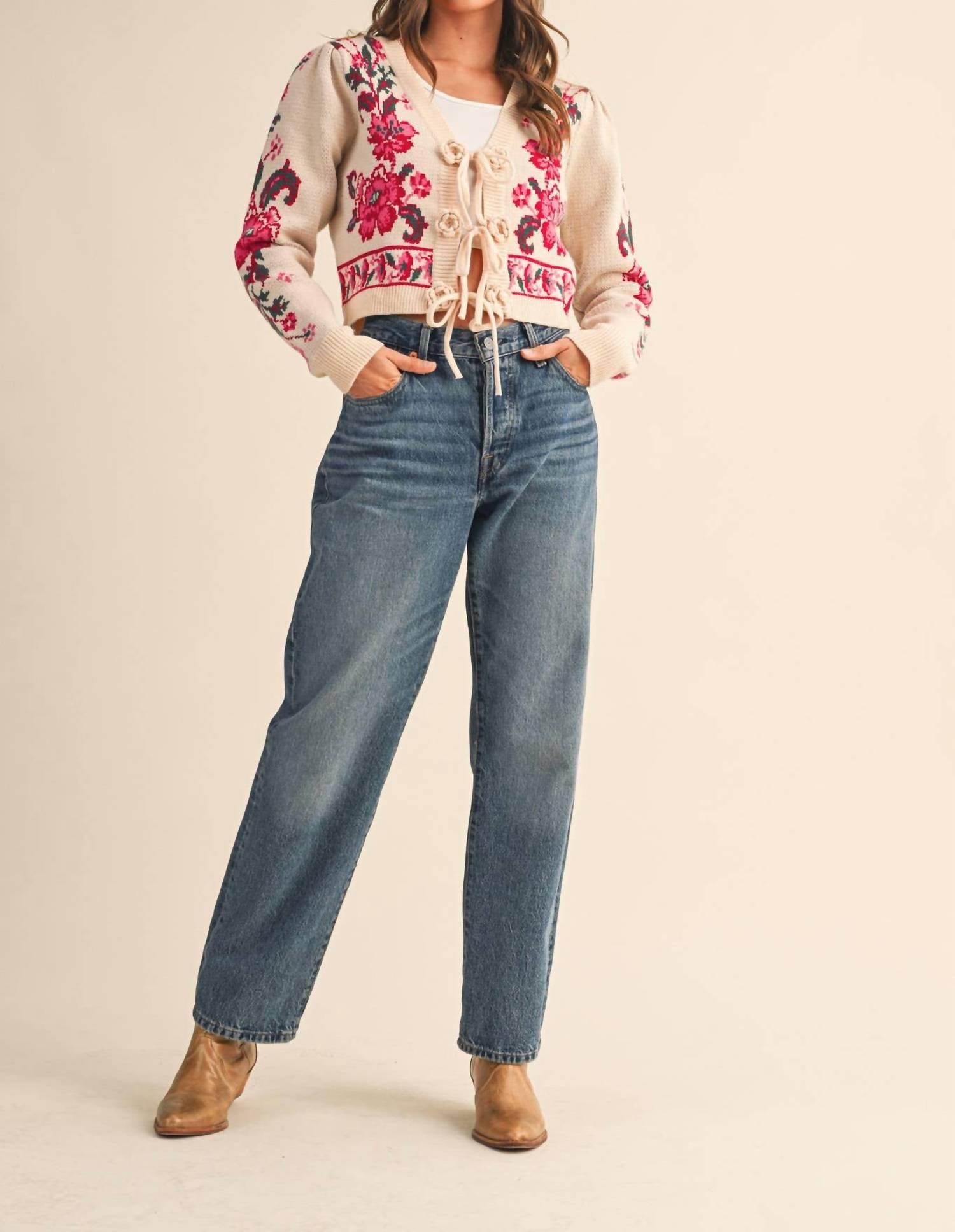 &Merci - Floral Knit Tie-front Cropped Sweater Cardigan